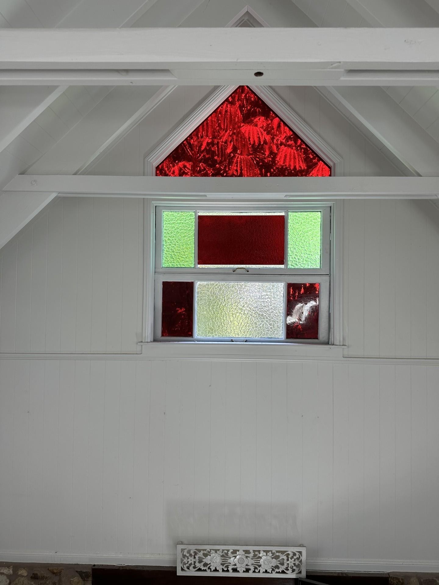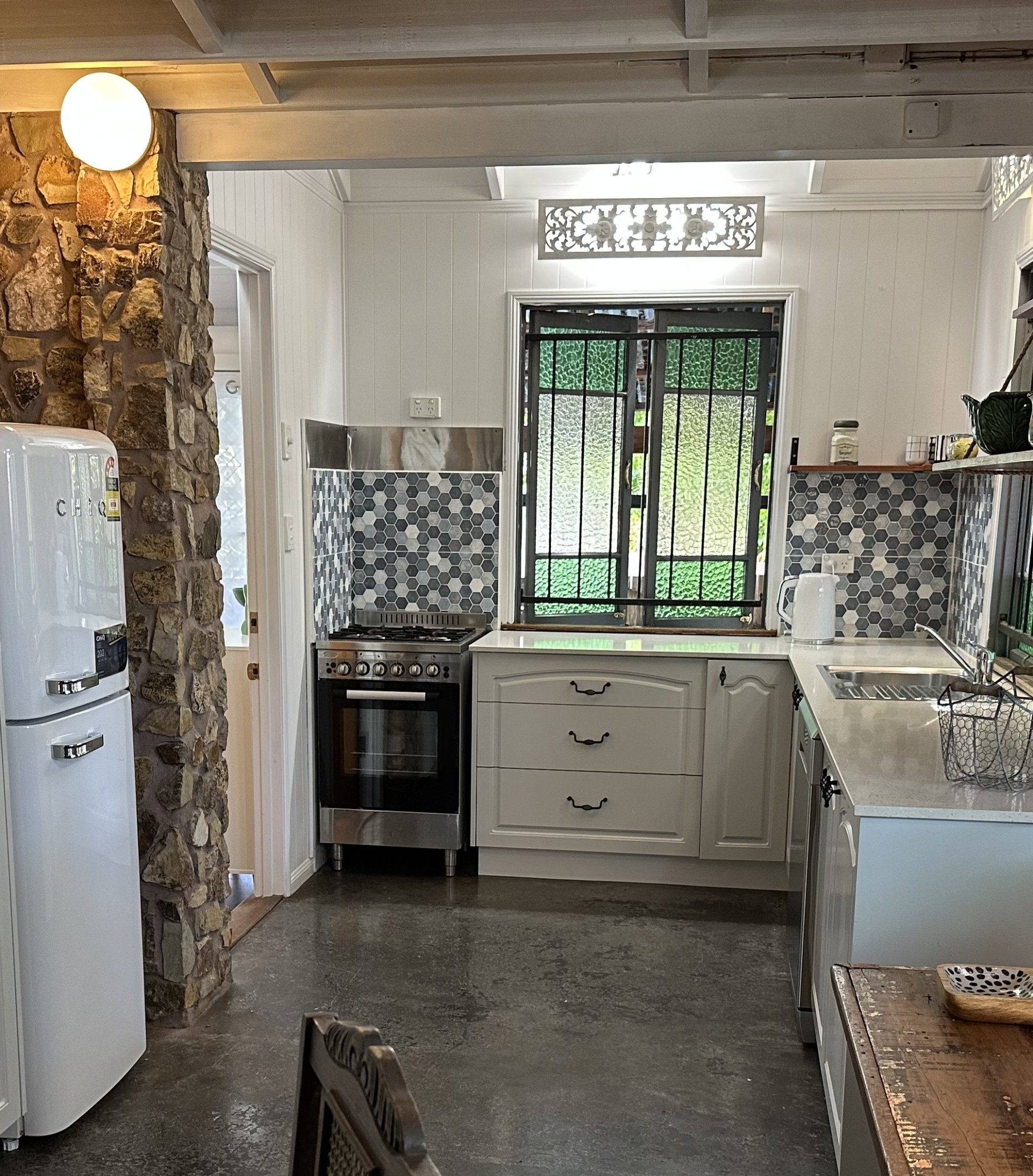 The modern kitchen with caesar stone bench top includes a brand new art deco fridge and new dishwasher. The stained glass windows of the stone cottage open up to overlook the tranquil outdoor garden.