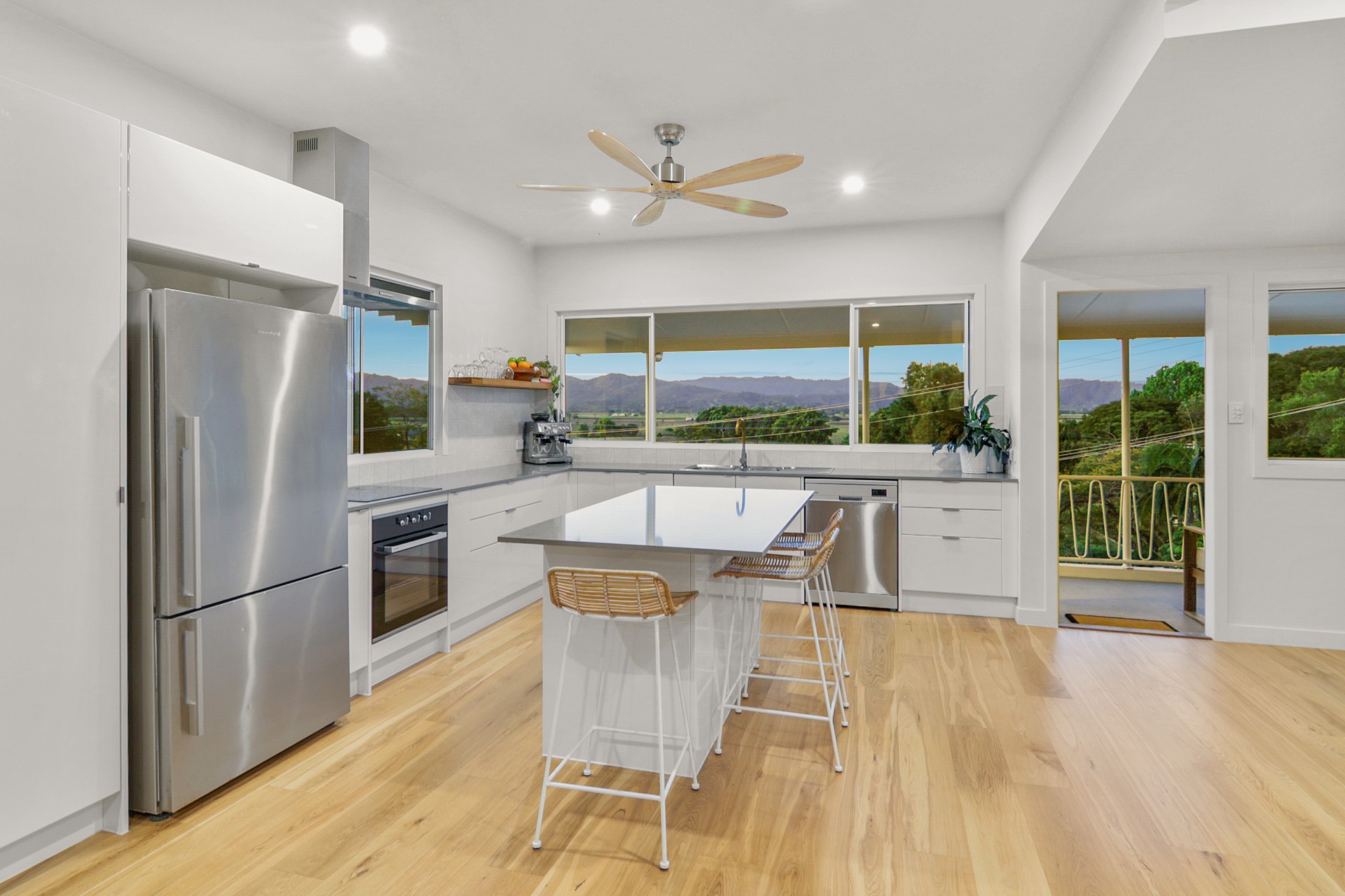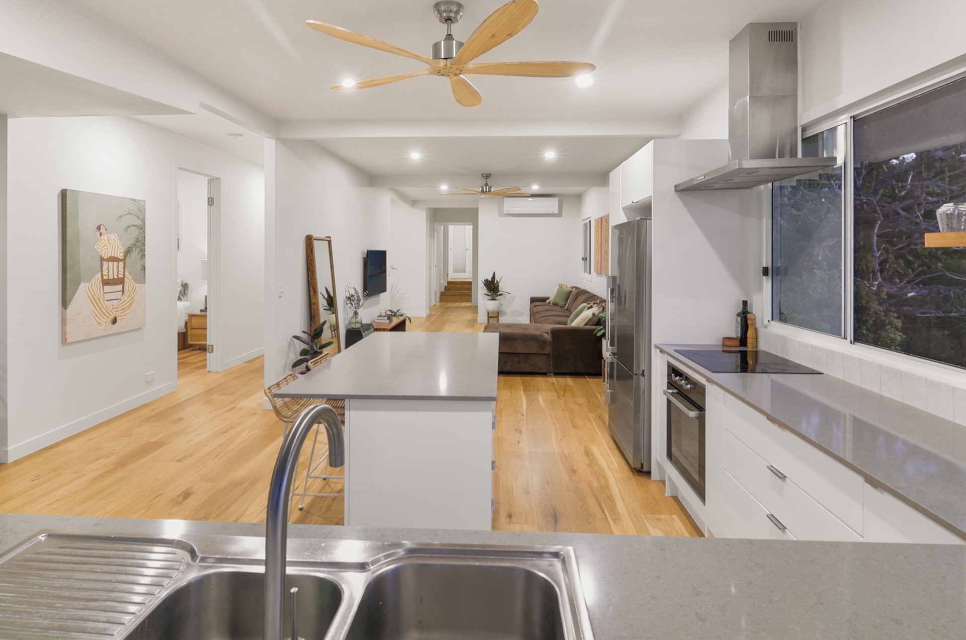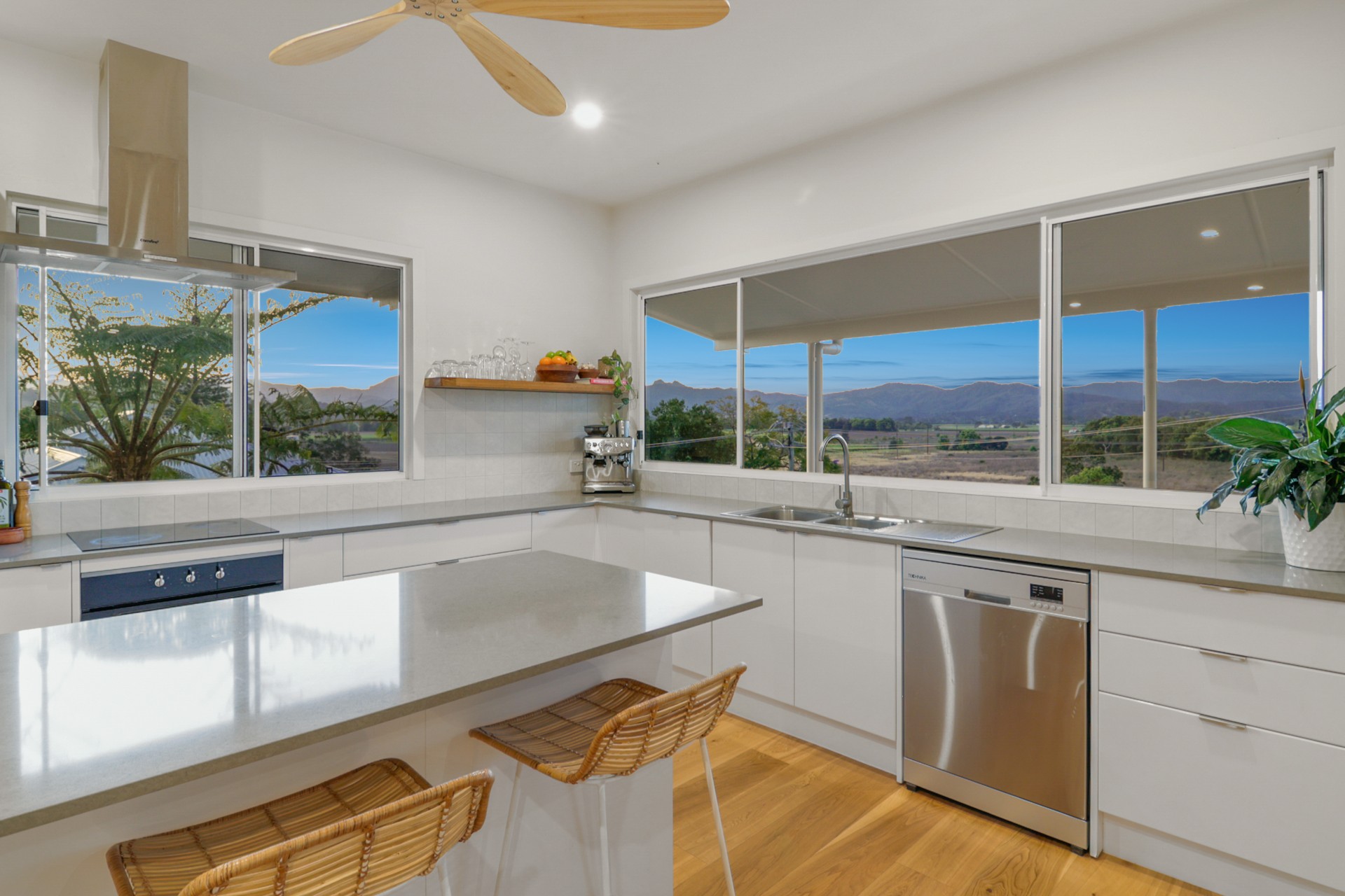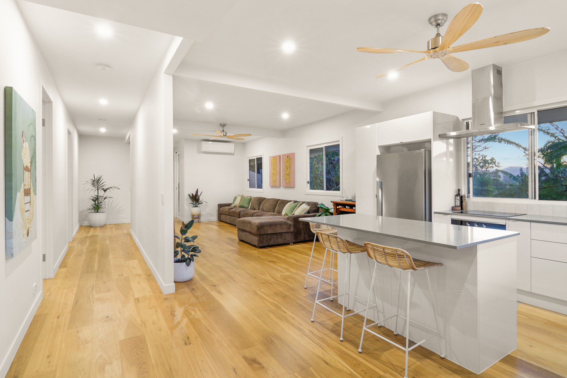 - Open-plan living flooded with natural light, and two large timber feature fans