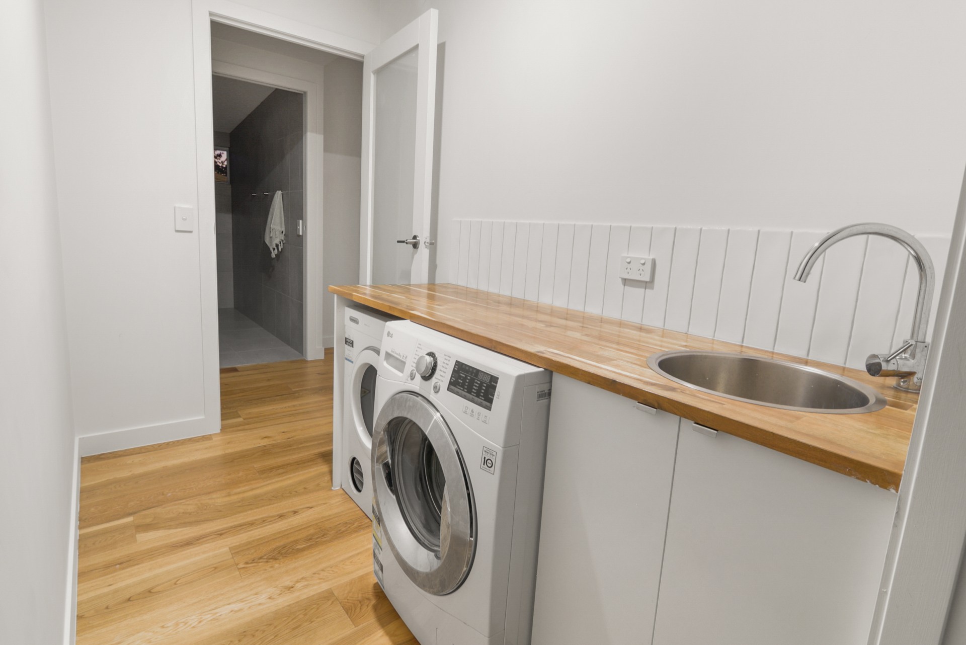 - Spacious laundry with large timber countertop
