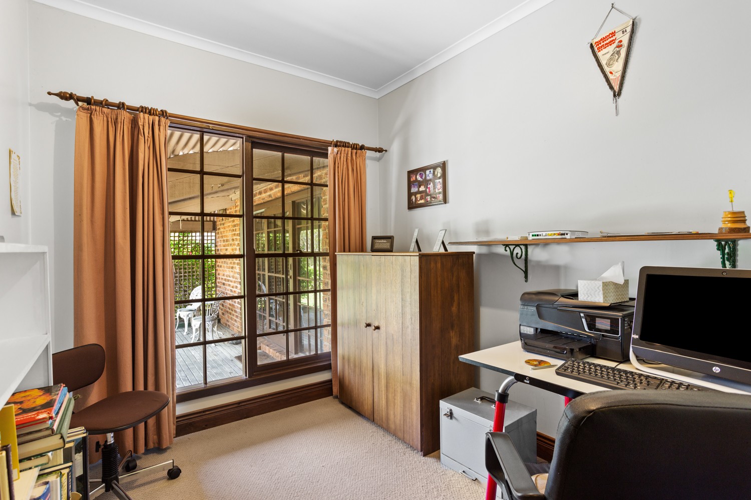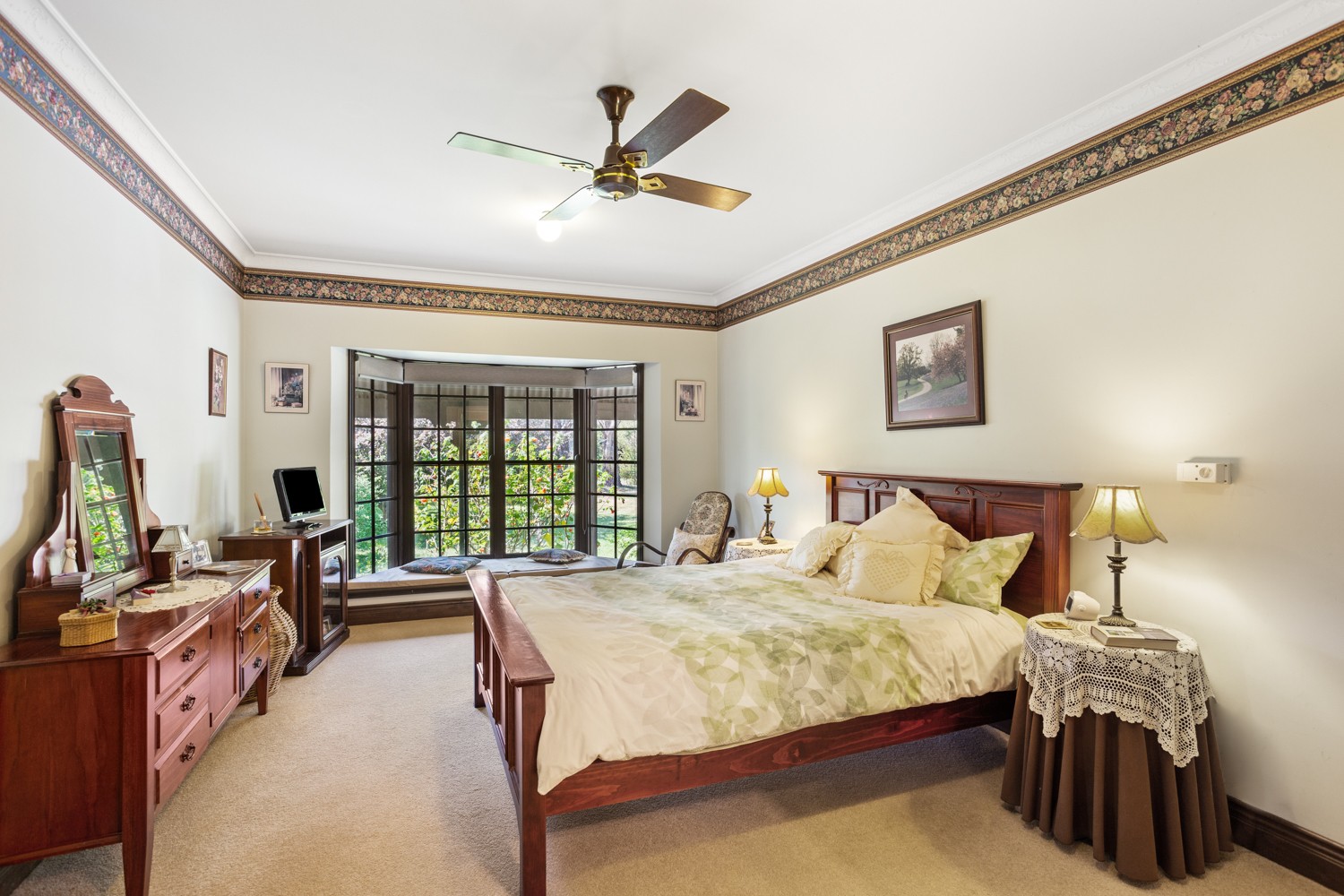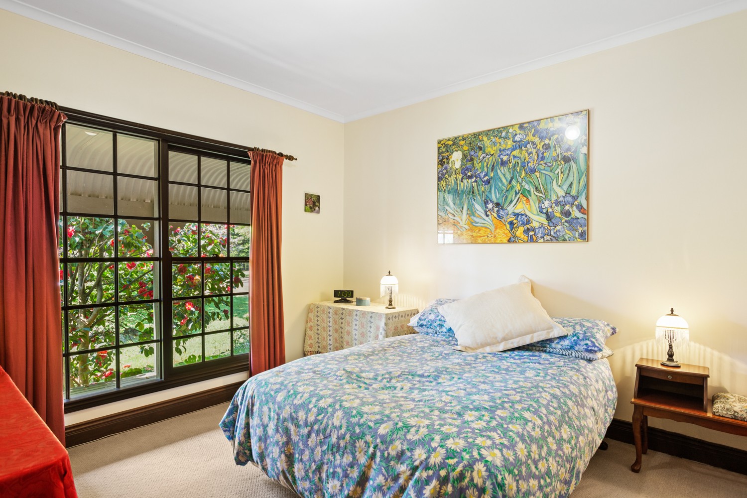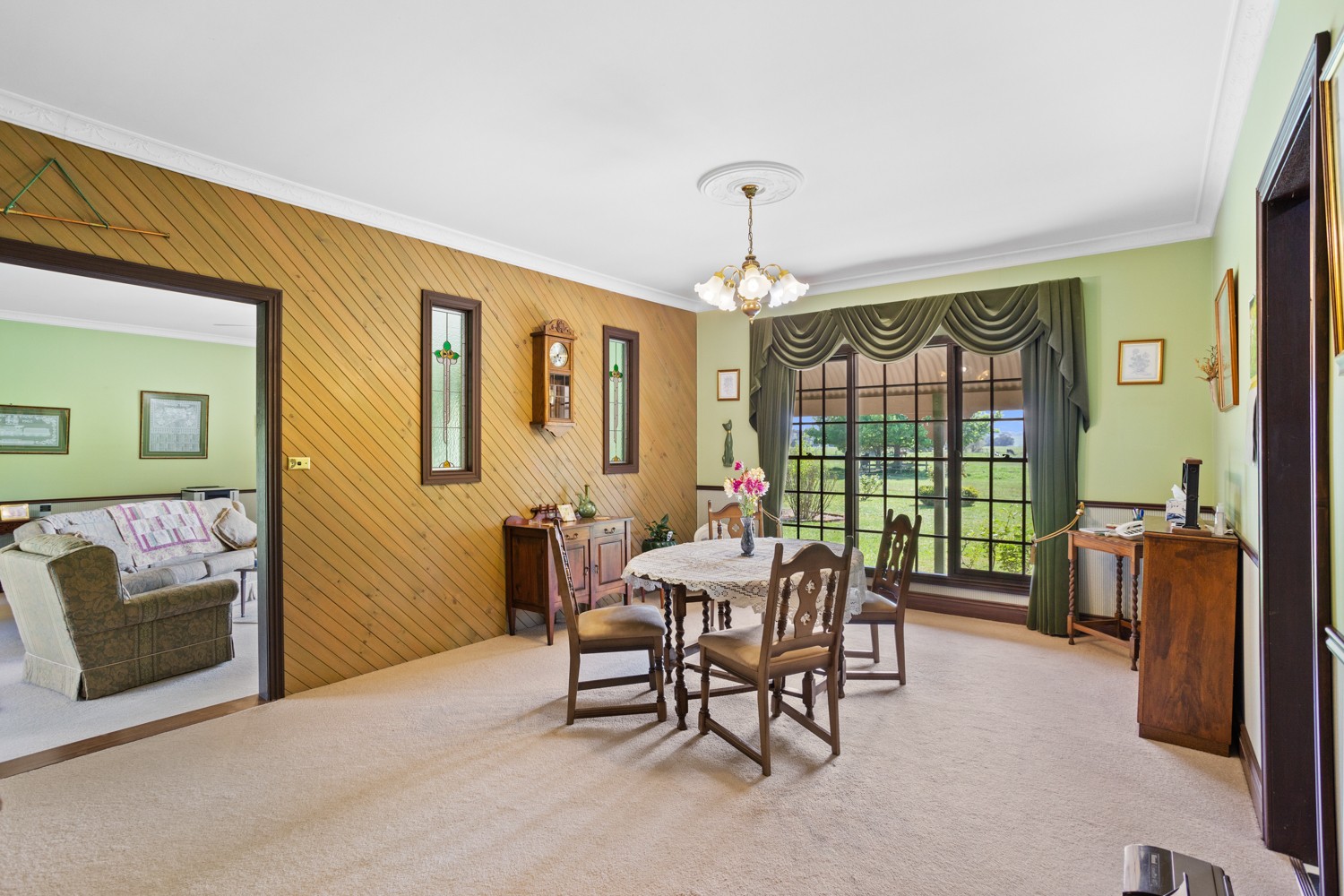 The dining room and large living room are carpeted, with drapes and stain glass windows on the interior wall separating the two rooms. Heating is in the form of a large slow combustion wood fire, which gives that kind of heat and ambience only a flame can provide. Drapes keep the heat out in summer and warmth in ensuring comfortable living all year round. There is also the option of gas heater in the dining room and ceiling fans to move the air in all seasons.