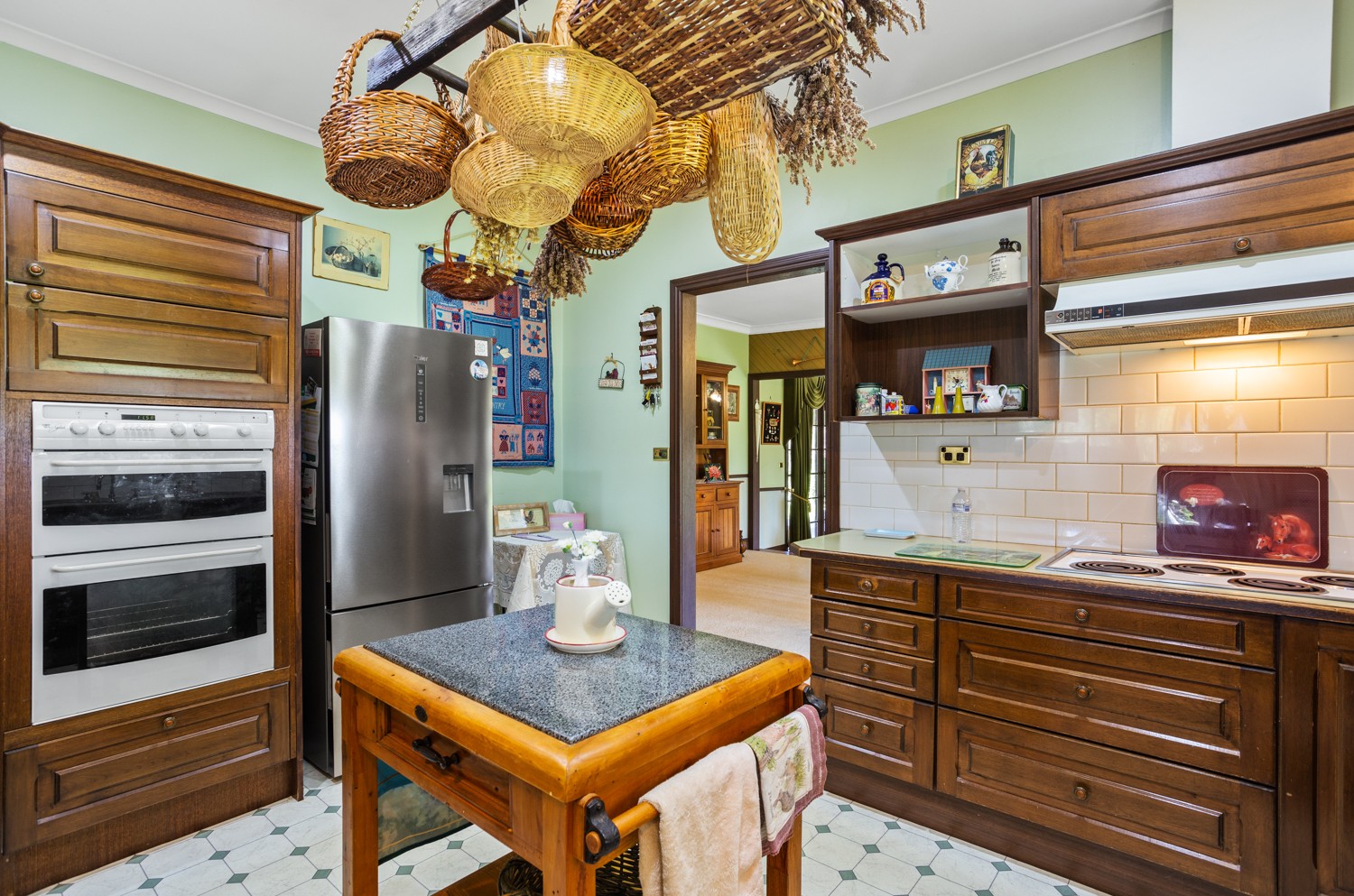 A charming country kitchen has all electric cooking, plenty of storage and a large corner pantry, room for 2 fridges and pretty colonial windows facing the paddocks and gardens.