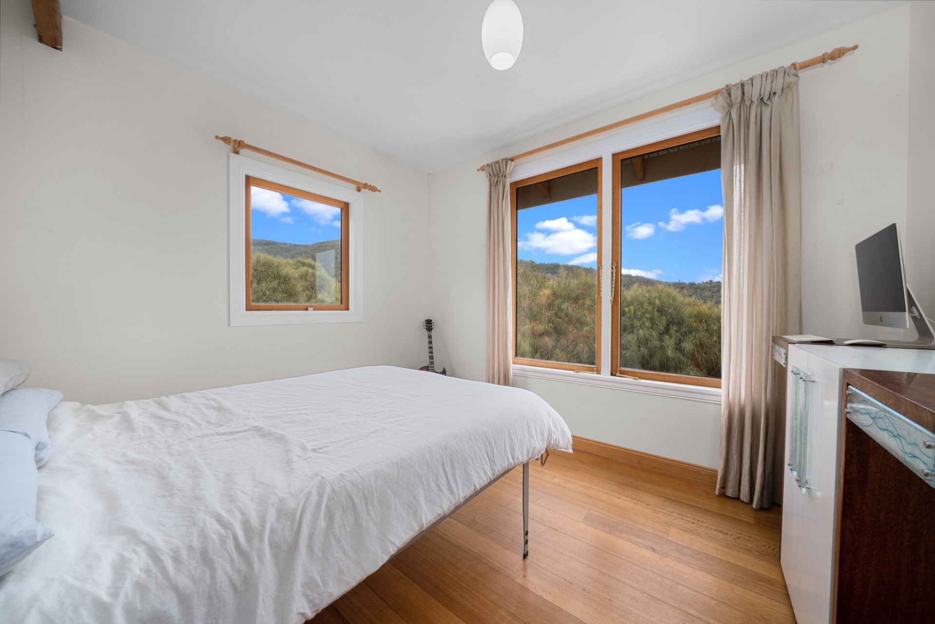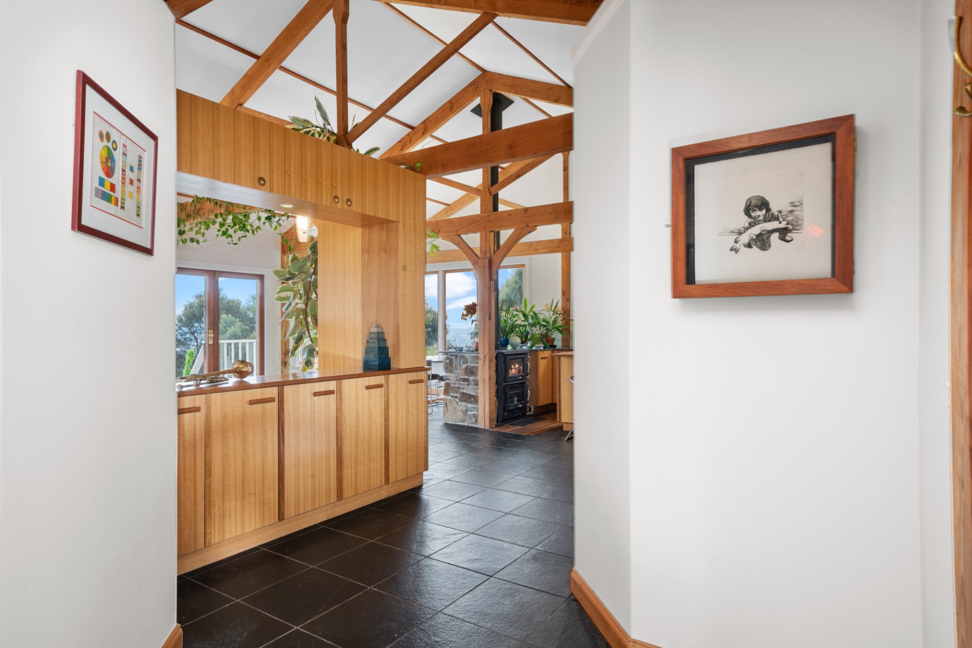 The house is oriented North and has been carefully designed and built with passive solar principles and technology, ensuring that it stays warm all winter and cool in the summer. Virtually no extra heating is required to maintain lovely ambient temperatures inside. Acoustic insulation and double glazing throughout also ensure that it remains quiet, even during the fiercest of Tasmanian weather! You will also be wonderfully surprised by the internal air quality. The house is built as close to zero VOC (volatile organic compounds) standards as possible. It contains no melamine, MDF, Polyurethane, synthetic textiles, or off-gassing compounds that are recognised as modern health hazards.