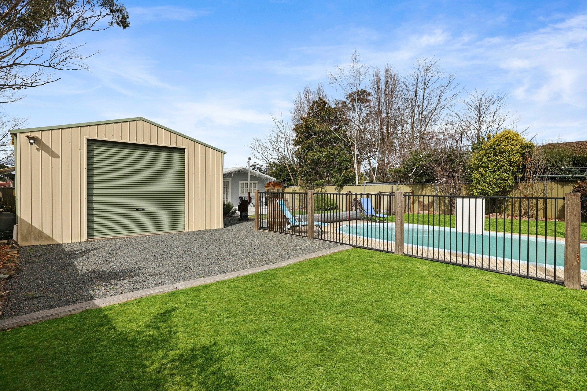 A great-sized shed with a mezzanine has a perfect setup with a secure lock-up garage, workshop, bar, pool table and fireplace. It will delight the avid home handyman or adventure motorbike rider and will be the ideal place to organise a home party with friends.