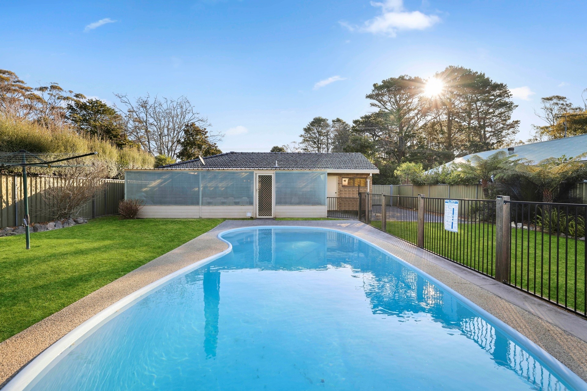 The sun-soaked fully fenced rear yard with an inground pool provides the perfect backdrop for outdoor entertaining or a children's playground.
