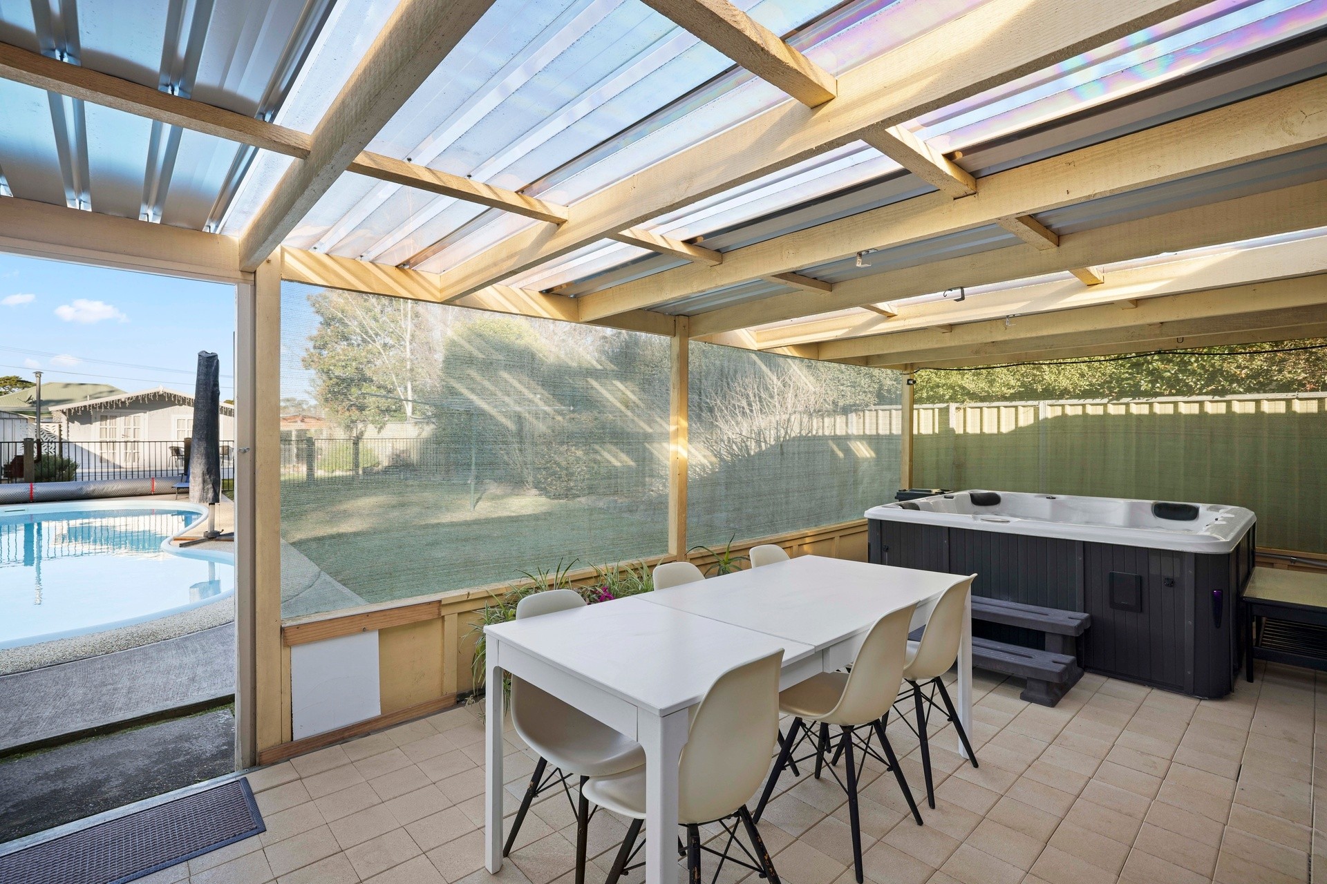 A pergola-covered terrace with the SPA and BBQ is the ideal spot to entertain family once the weather is cooling down and can be a safe space for your indoor animals.