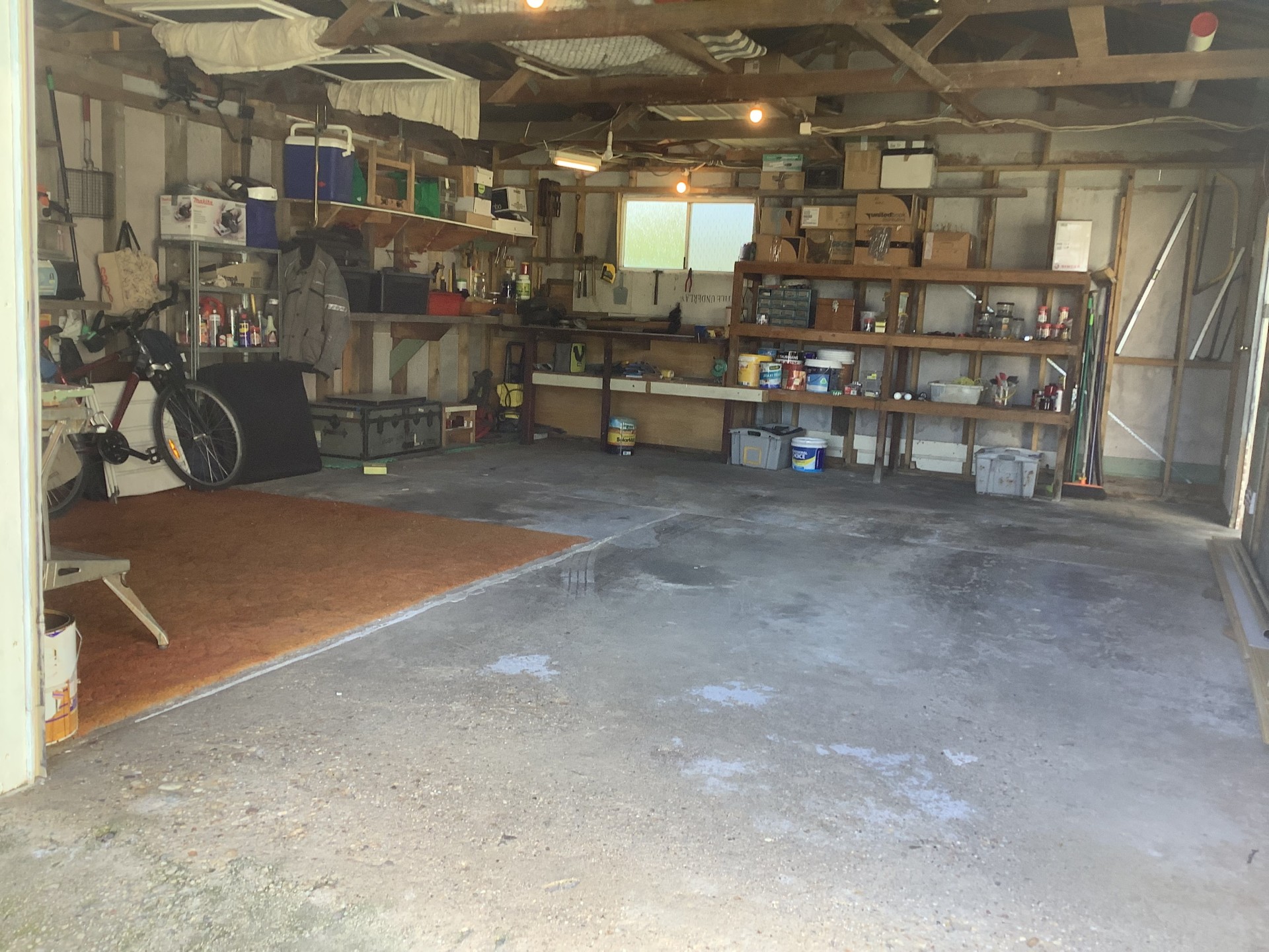 The large garage features ample shelving, a workbench, and another toilet. The garage is connected to power and water.