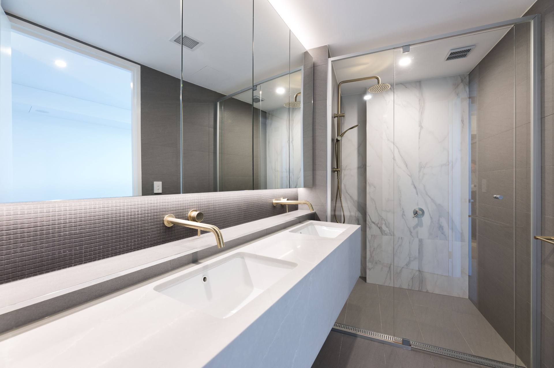 Apartment 38 consists of 3 large bedrooms in total. The Master Suite has its own double basin vanity, large shower and toilet Ensuite. Bedrooms 2 and 3 have built-in robes and share the 2nd bathroom with another generous-sized shower. The laundry facilities are all built-in and contained in this full-height tiled area for ease of use and efficiency.