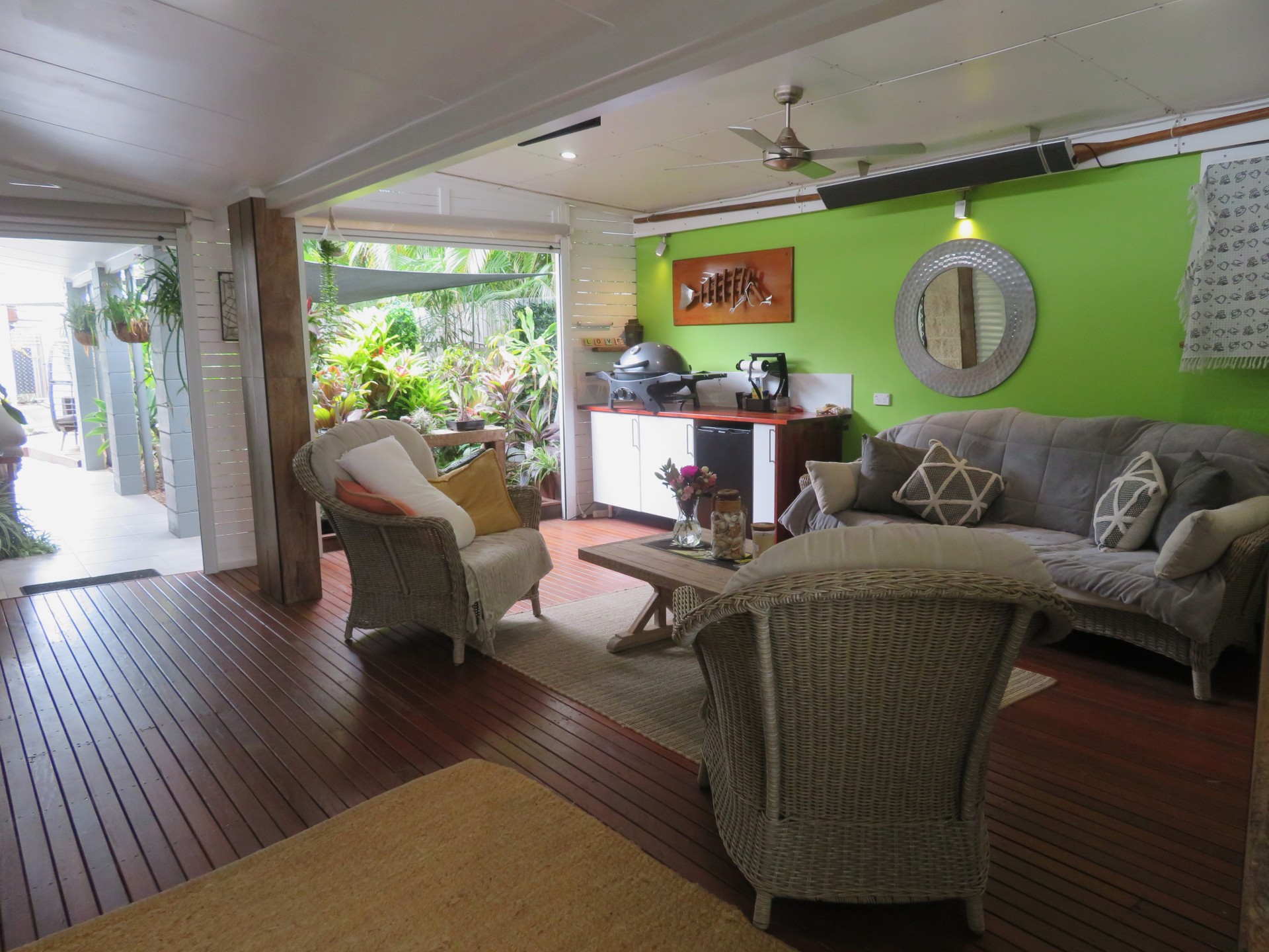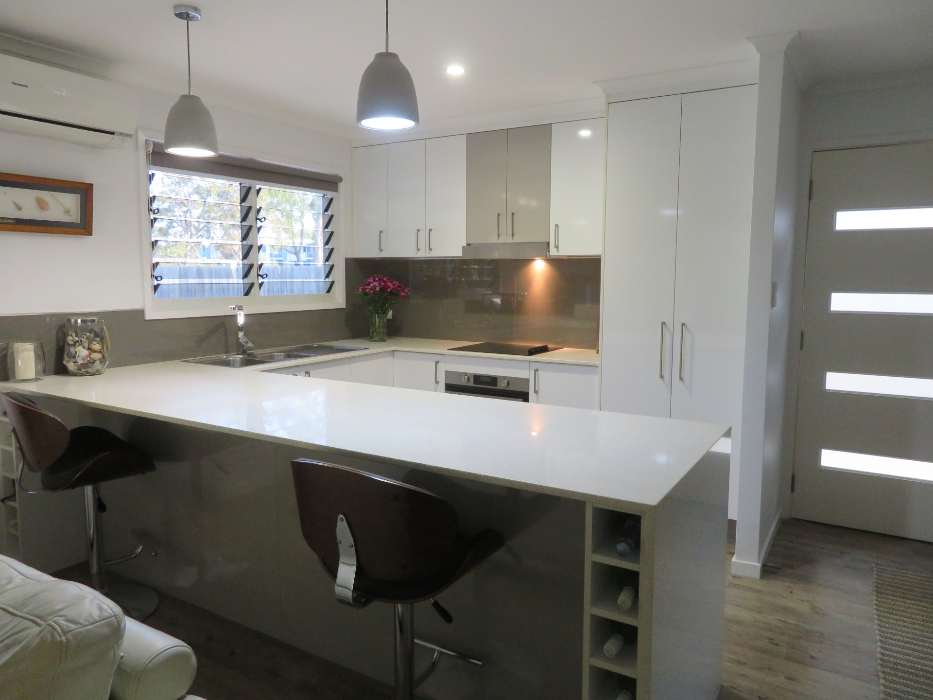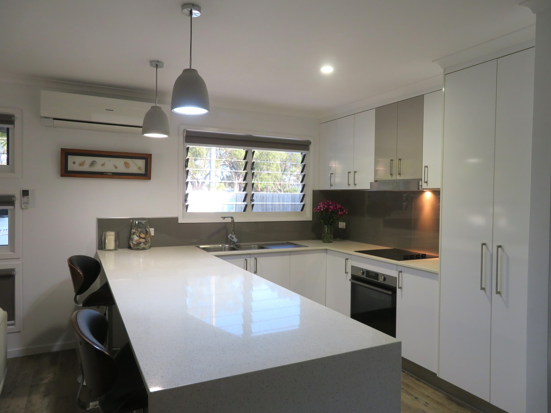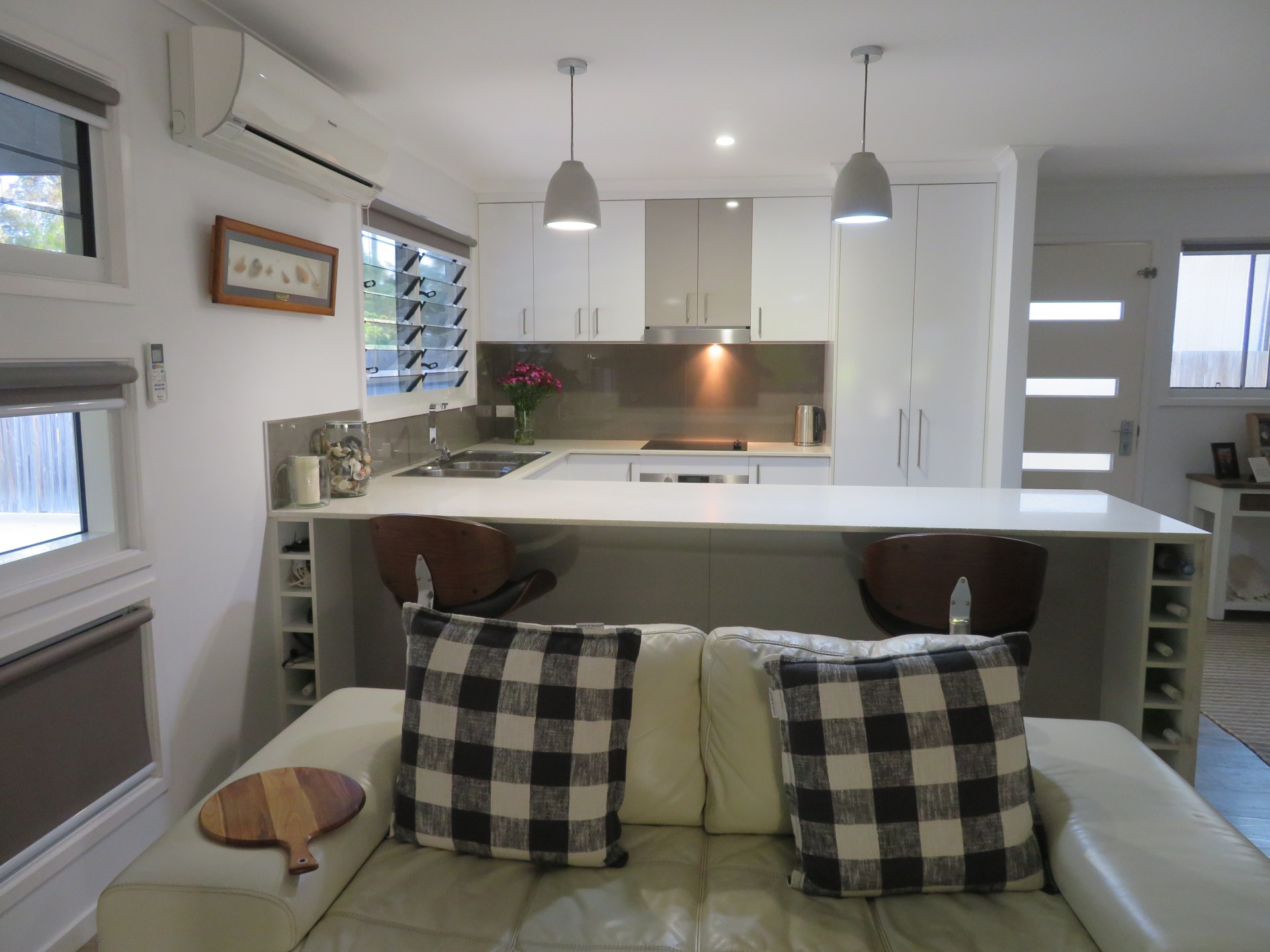 The home boasts a modern kitchen with a Caesarstone stone benchtop, with an open plan living area that flows out to the private, resort-style outdoor room.
