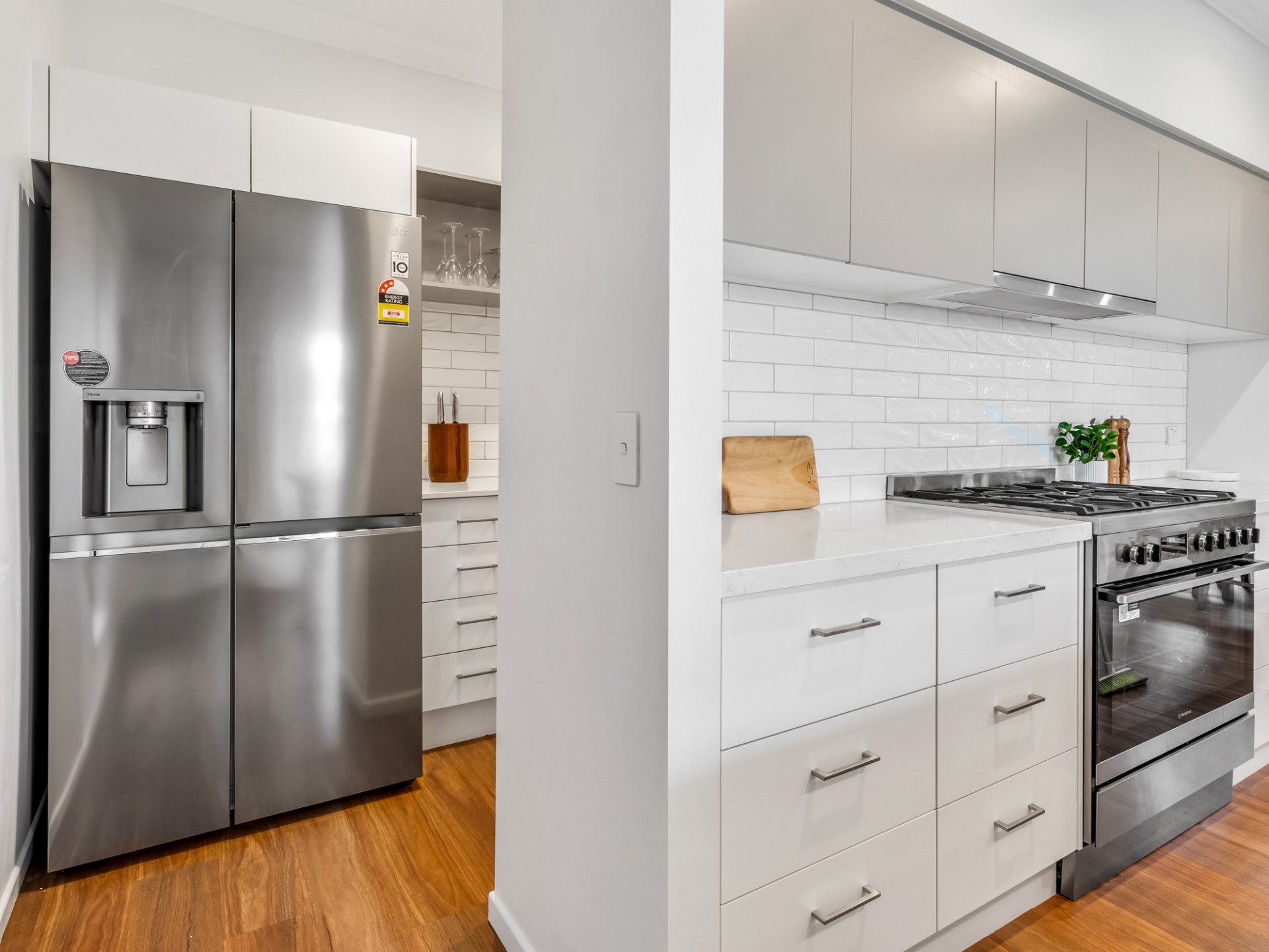 • Kitchen contains 40mm stone bench tops, 900mm stainless steel appliances, stove with gas cooktop & electric oven, dishwasher, large walk-in butler pantry and plumbed cold water fridge outlet.