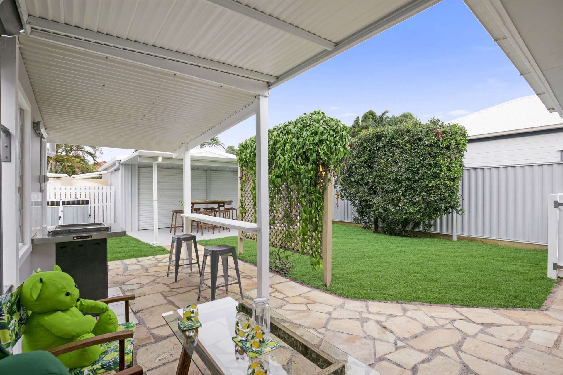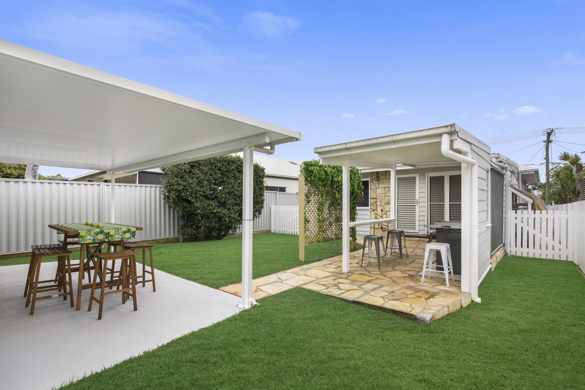 Private backyard for outdoor gatherings. Featuring a Christie Electric Beach Barbecue.