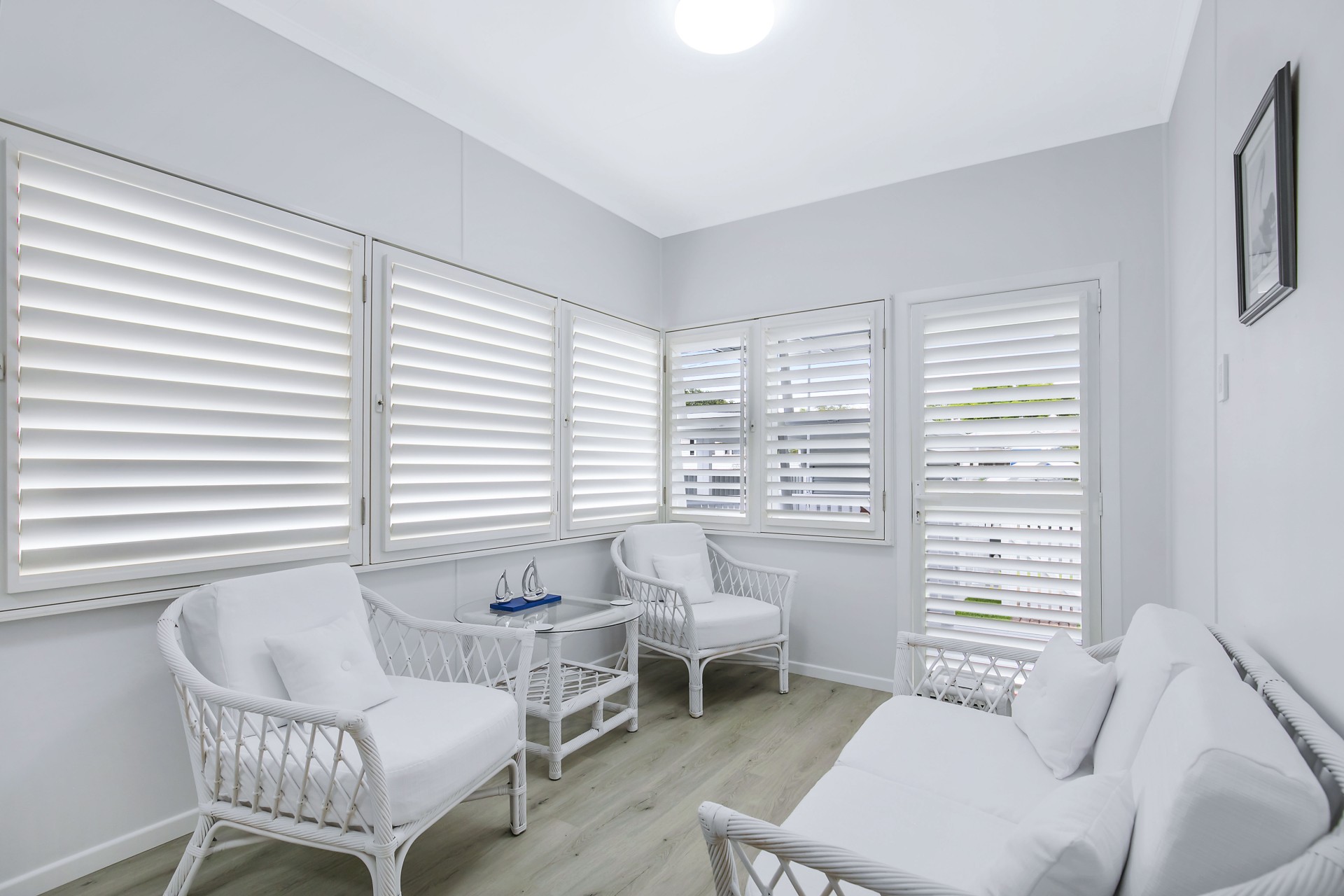 Queensland-made Guardian Lockable Shutters provide attractive all-in-one window and doorway furnishing (High Security, insect screens, adjustable blades with insulation for privacy and heat control.