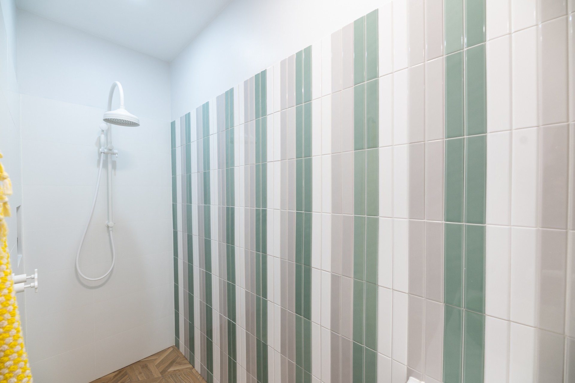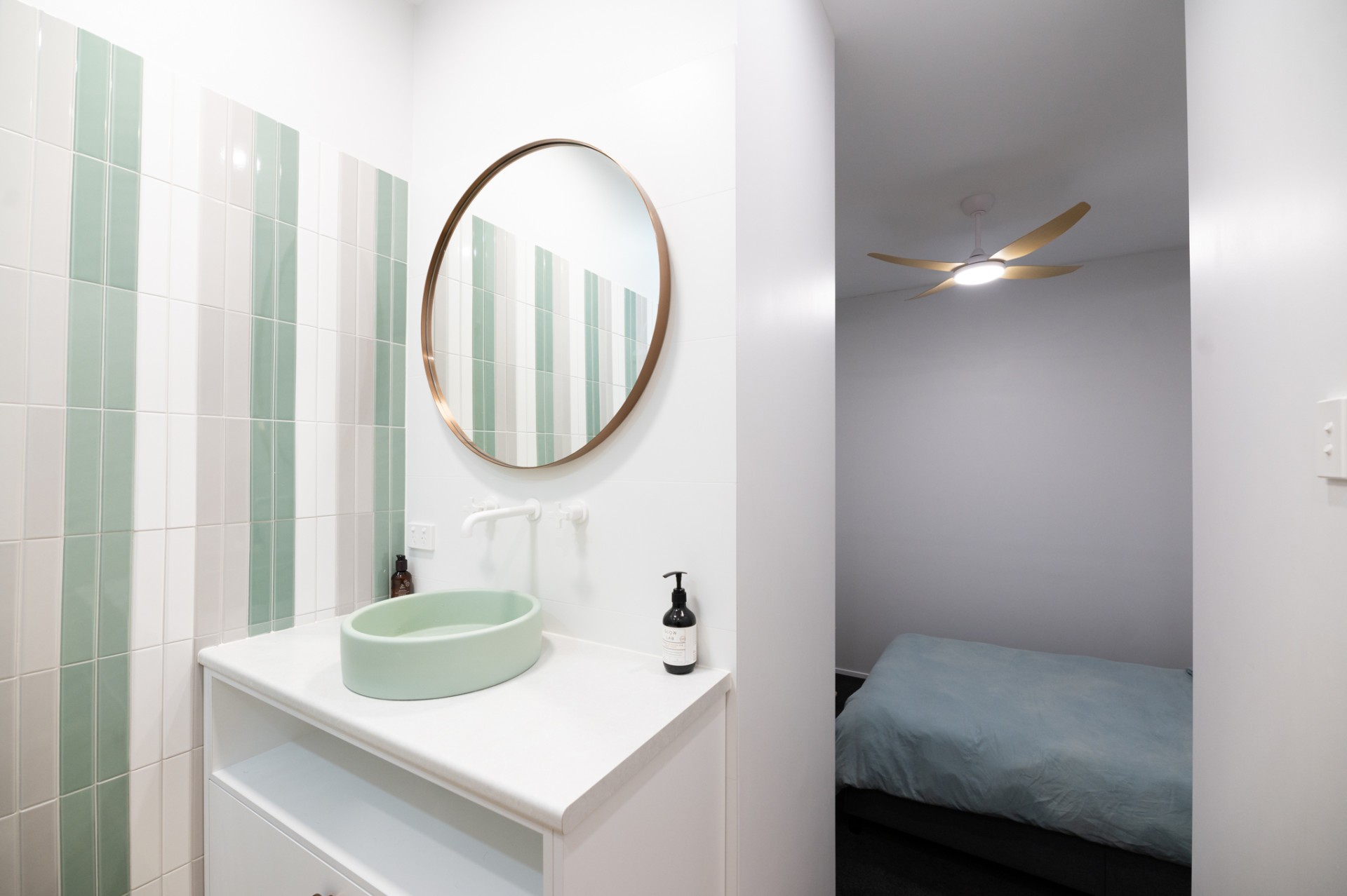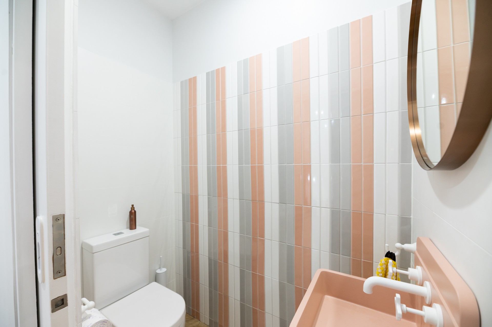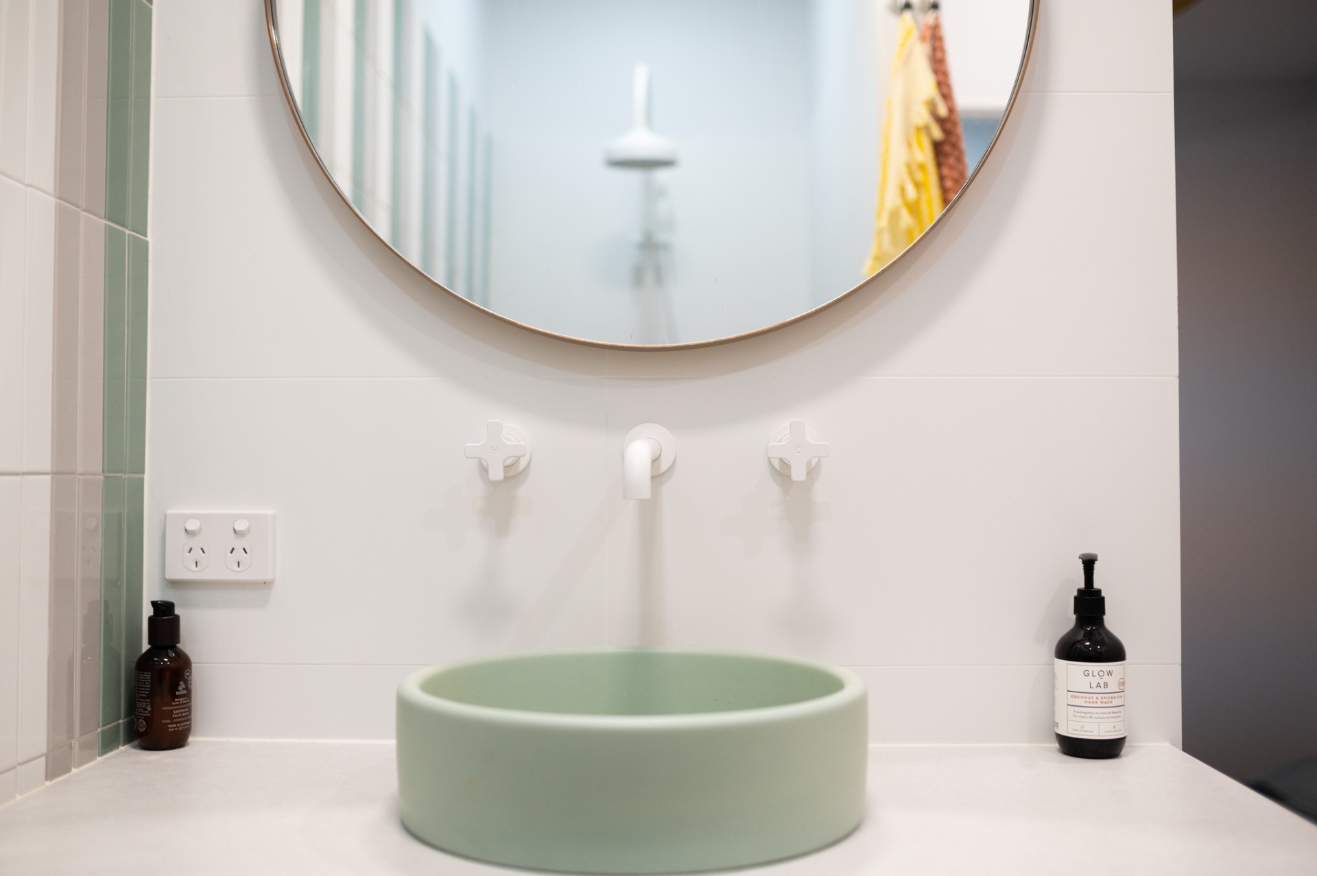 • Bathroom and toilet feature Nood Co concrete basins, custom white tapware and imported European wall and floor tiles.