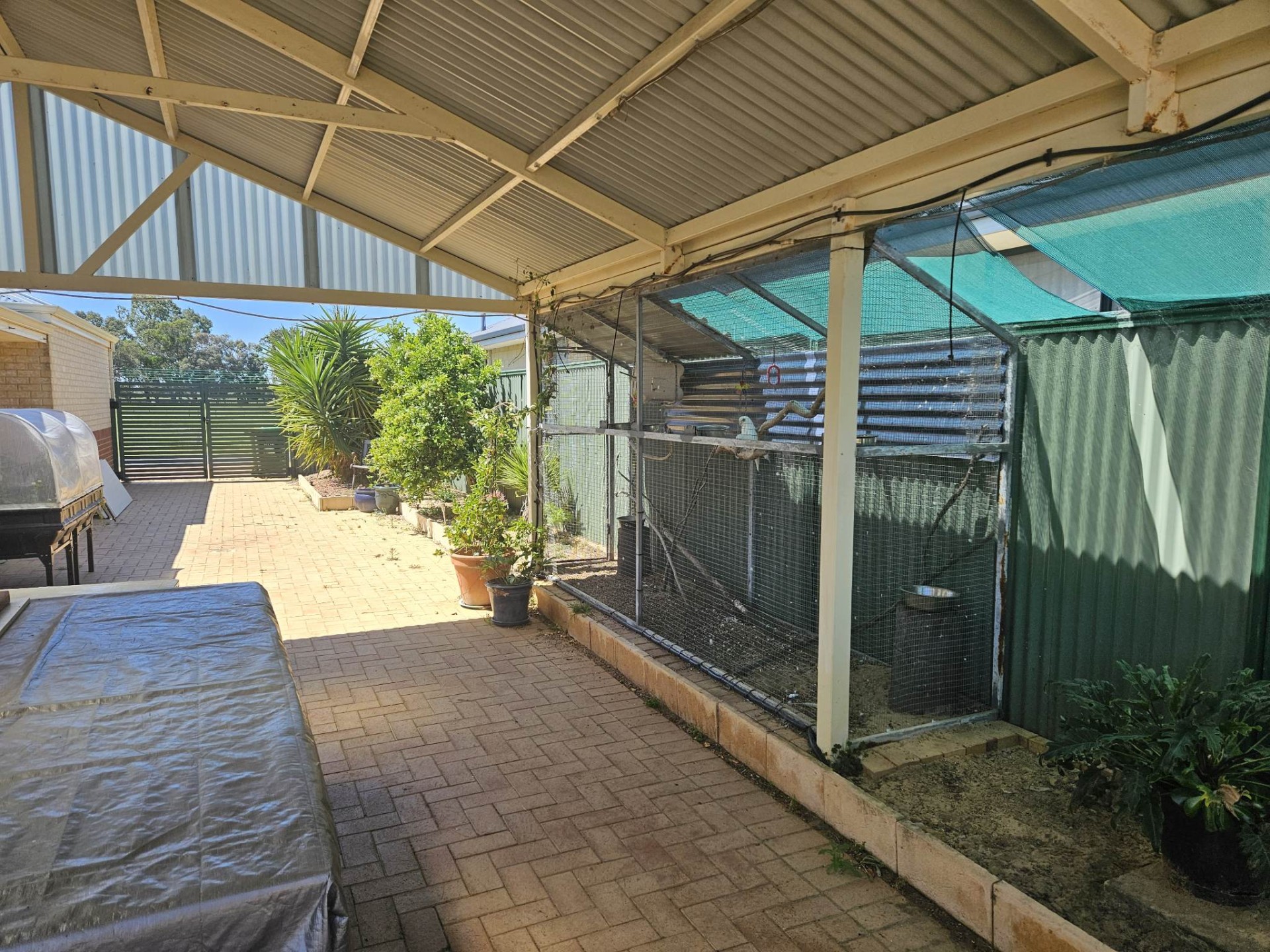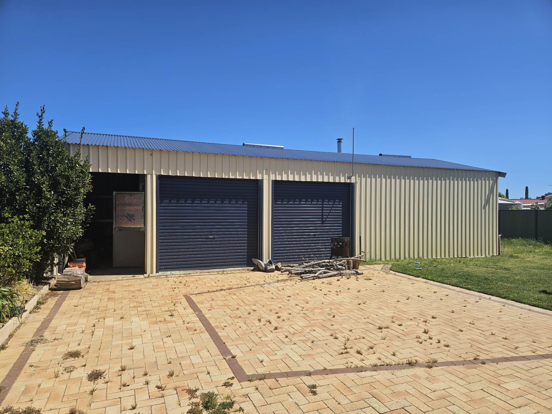 Large shed with storage and workshop and woodshed. Enclosed garden and covered patio.