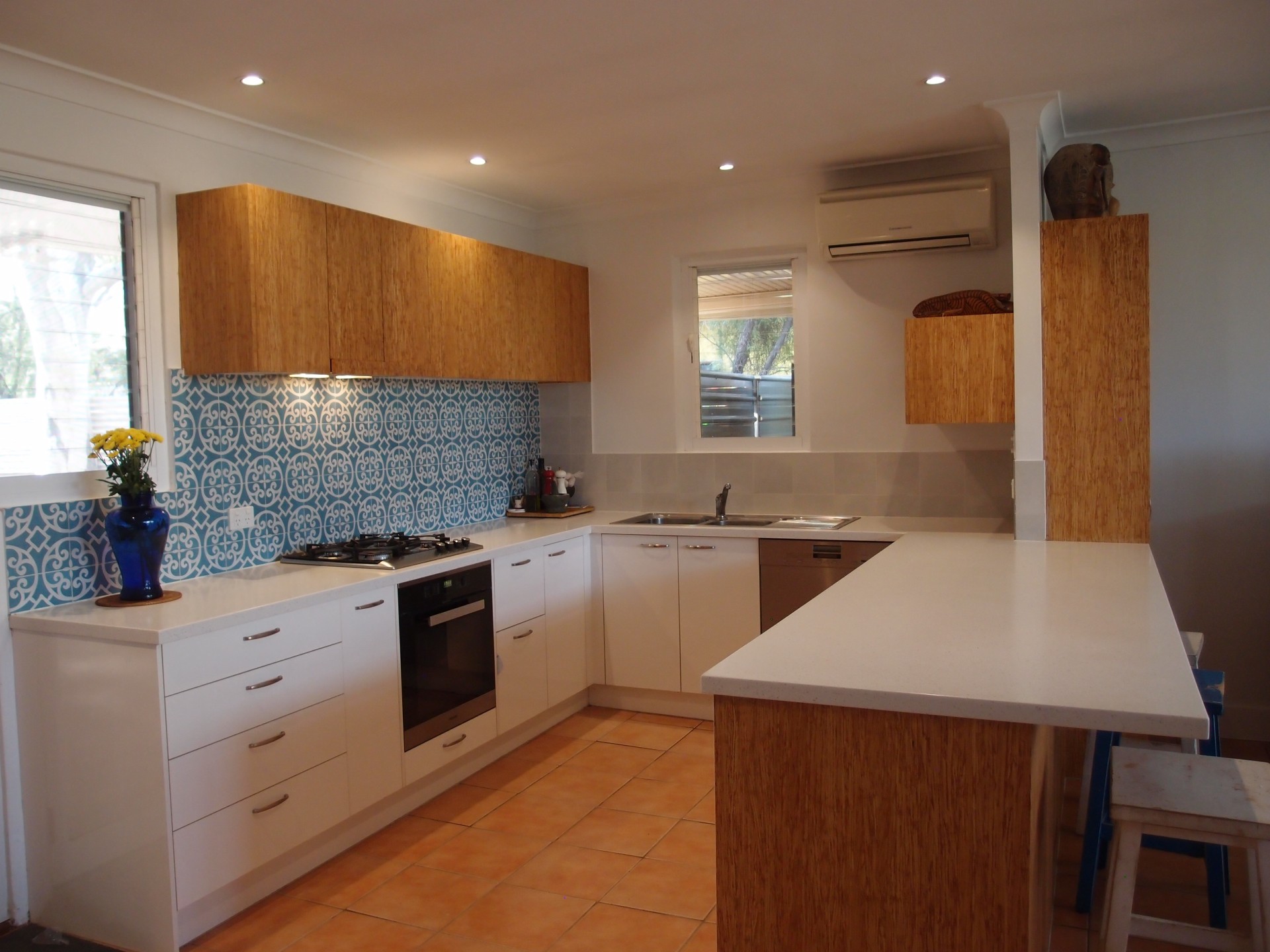 A recently renovated kitchen features a dishwasher, gas cooktop, electric self-cleaning oven, bamboo cupboards and high quality bench top and drawers.