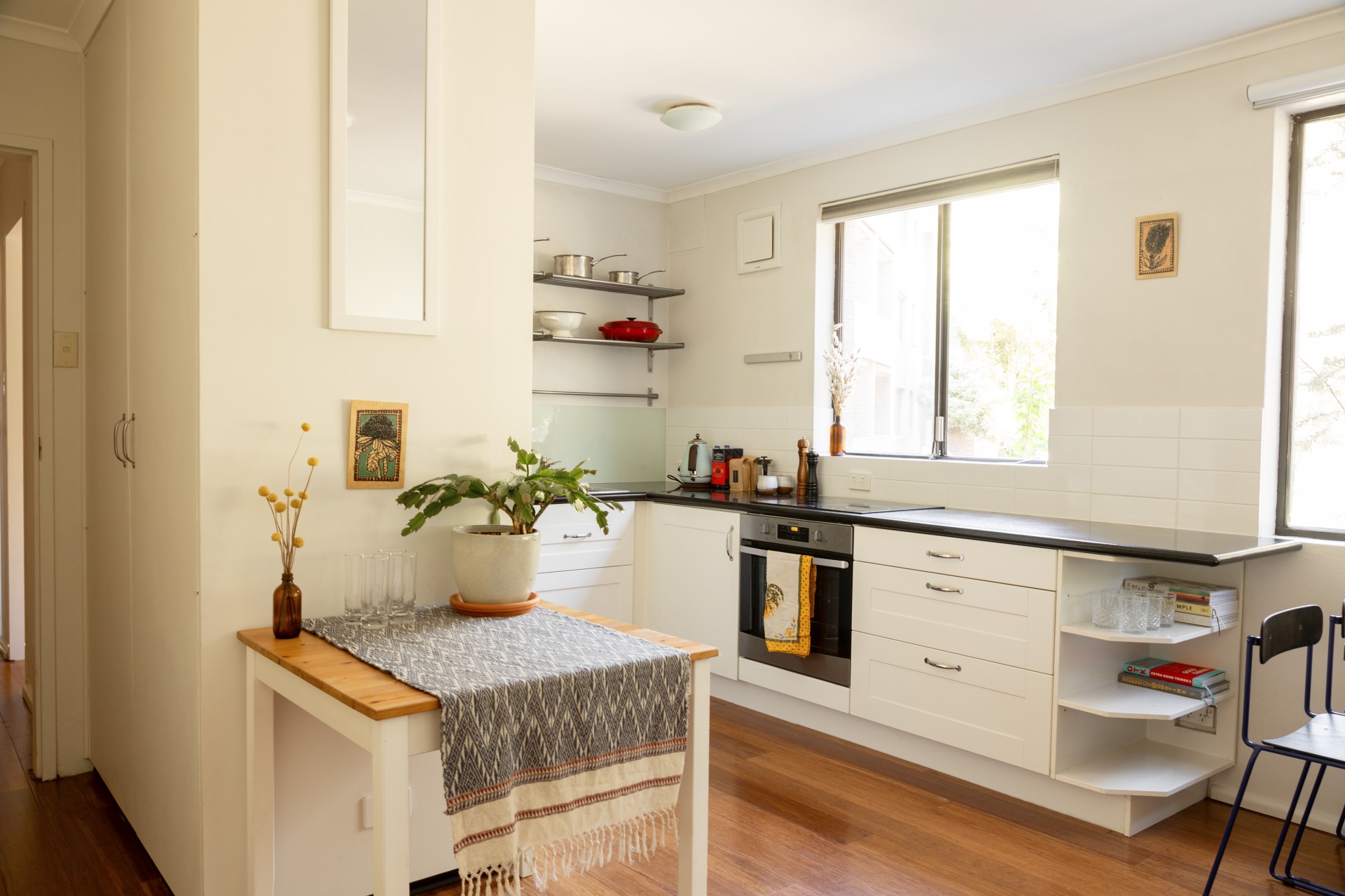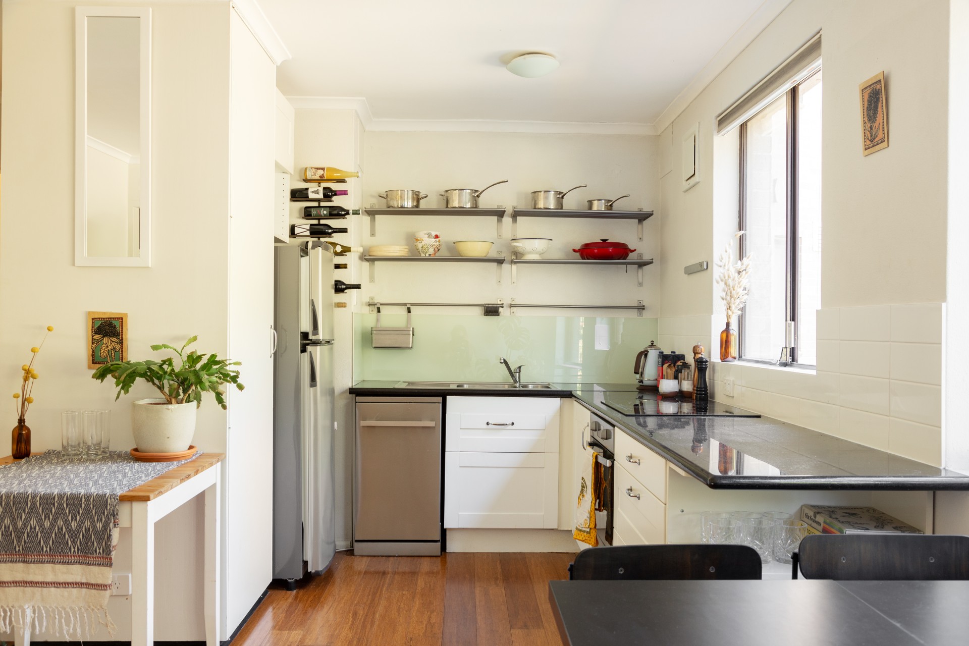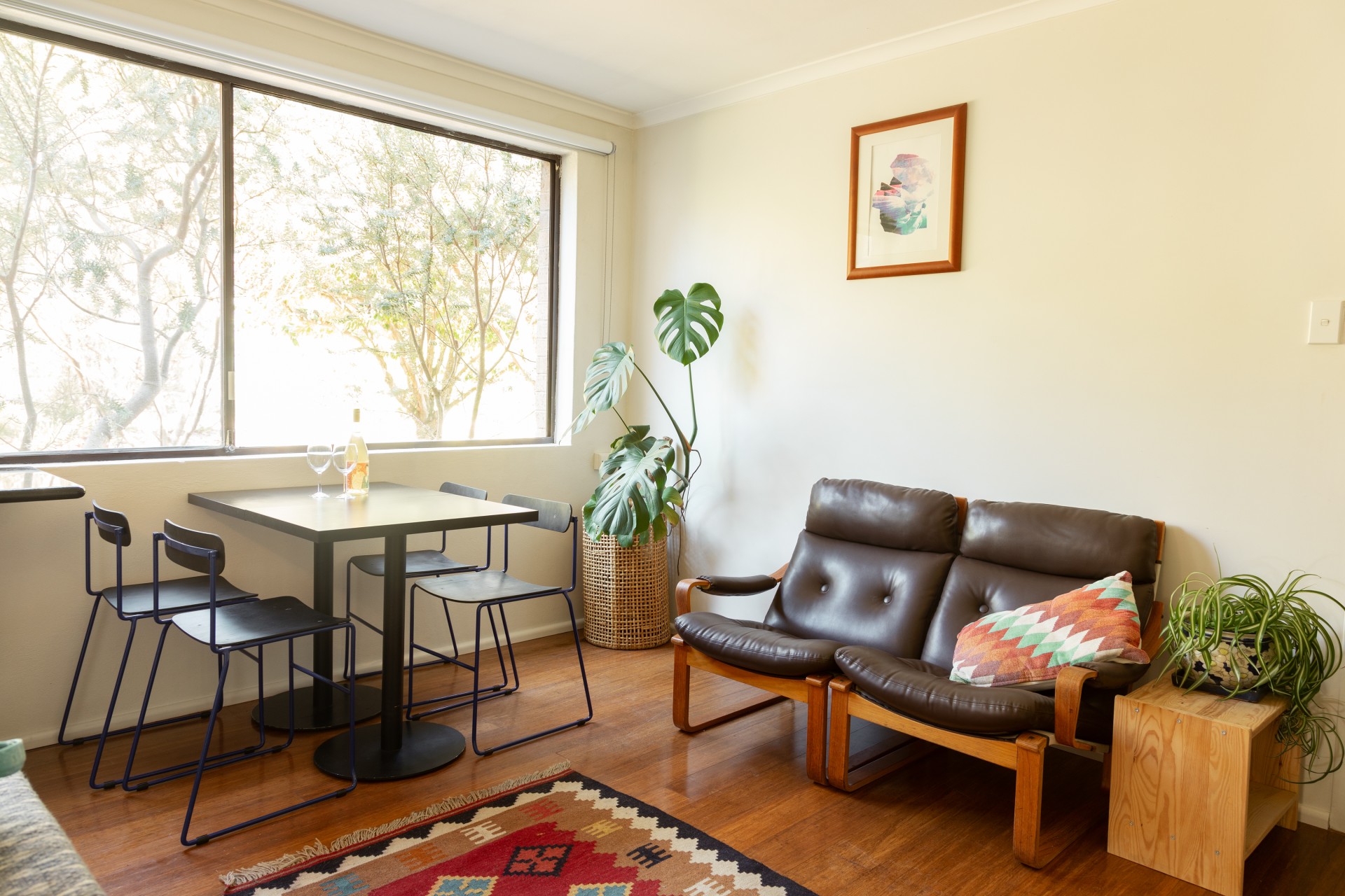 Large windows provide the apartment with an abundance of natural light and a view of the leafy surroundings. The living area and kitchen are seamlessly connected, creating a wide open space for dining, lounging and entertaining. The kitchen has been thoughtfully remodelled and now offers stainless steel appliances, ample storage, and modern fixtures that make it easy to cook and clean. The master bedroom is equipped with a built-in wardrobe and opens onto a small but charming front balcony, providing a pleasant spot to enjoy a drink or a weekend breakfast. In front of the balcony lies a garden bed suitable for a herb or flower garden. The second bedroom is generously sized, with a window that looks out to the luscious green entrance to the building. The bathroom has been tastefully renovated, featuring a porcelain vanity and a spacious shower. Additionally, there's a dedicated laundry area, eliminating the need to share communal facilities.