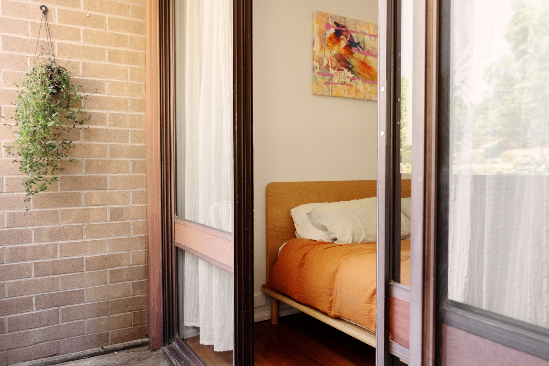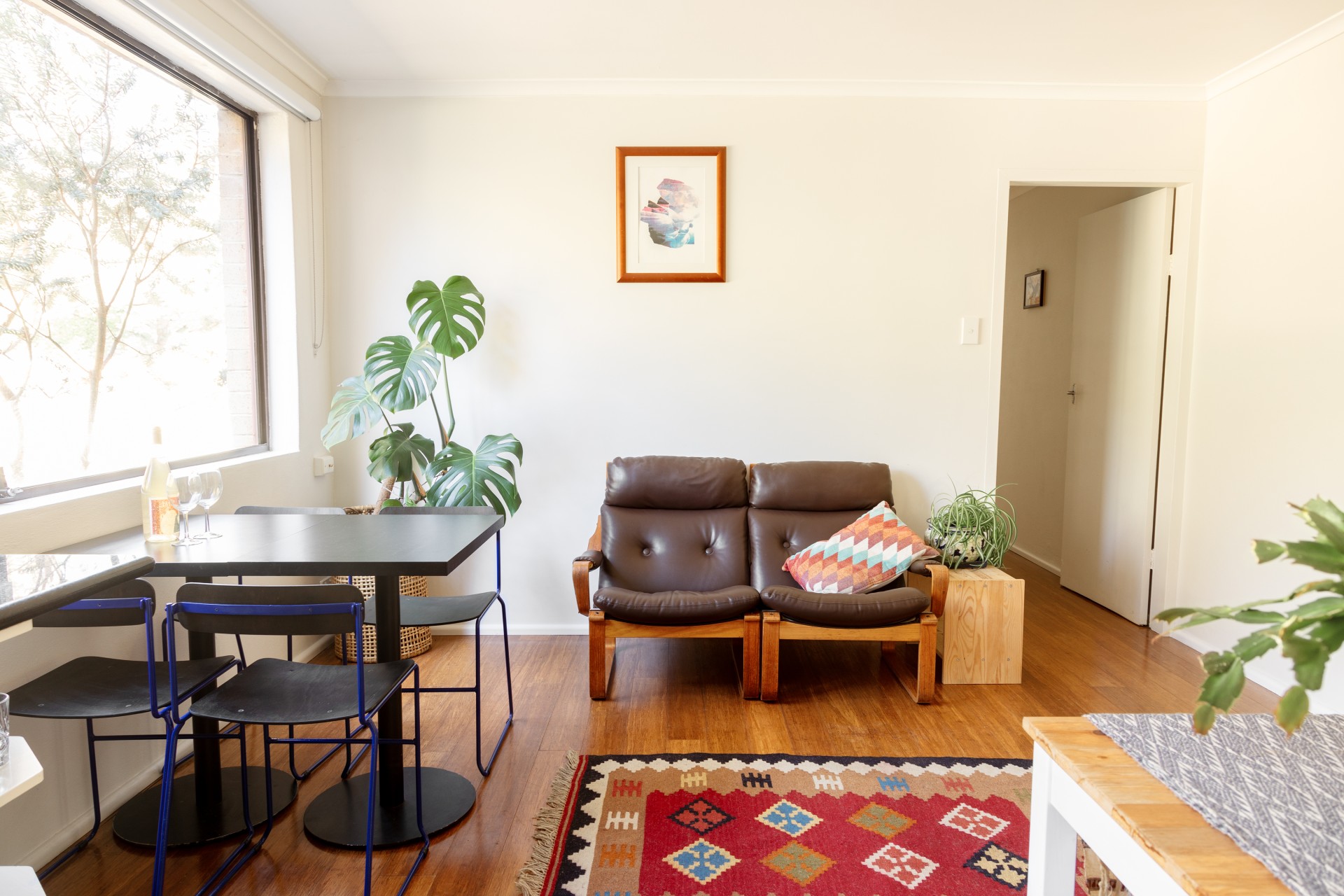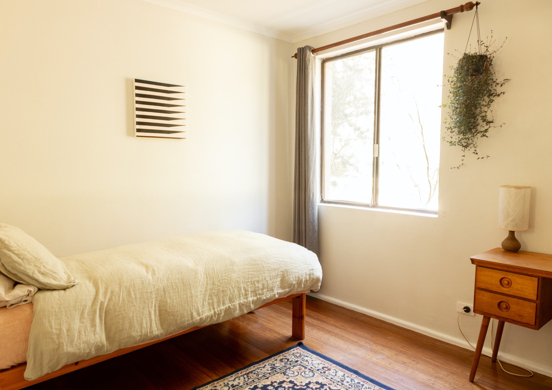 Large windows provide the apartment with an abundance of natural light and a view of the leafy surroundings. The living area and kitchen are seamlessly connected, creating a wide open space for dining, lounging and entertaining. The kitchen has been thoughtfully remodelled and now offers stainless steel appliances, ample storage, and modern fixtures that make it easy to cook and clean. The master bedroom is equipped with a built-in wardrobe and opens onto a small but charming front balcony, providing a pleasant spot to enjoy a drink or a weekend breakfast. In front of the balcony lies a garden bed suitable for a herb or flower garden. The second bedroom is generously sized, with a window that looks out to the luscious green entrance to the building. The bathroom has been tastefully renovated, featuring a porcelain vanity and a spacious shower. Additionally, there's a dedicated laundry area, eliminating the need to share communal facilities.