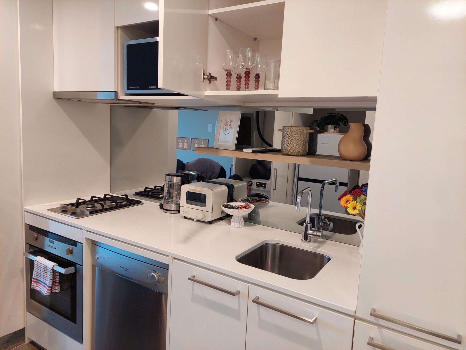 The apartment is thoughtfully designed for comfort and functionality, featuring floor-to-ceiling windows that frame panoramic city vistas, a split cool/heat system for climate control, and a designated space for a washing machine/dryer. The well-appointed kitchen includes a sleek oven, rangehood, gas stove, and dishwasher, catering to your culinary needs with style and efficiency.