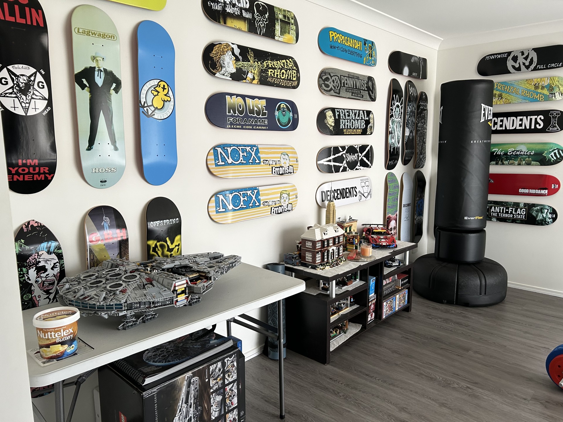 Media room with plank flooring.