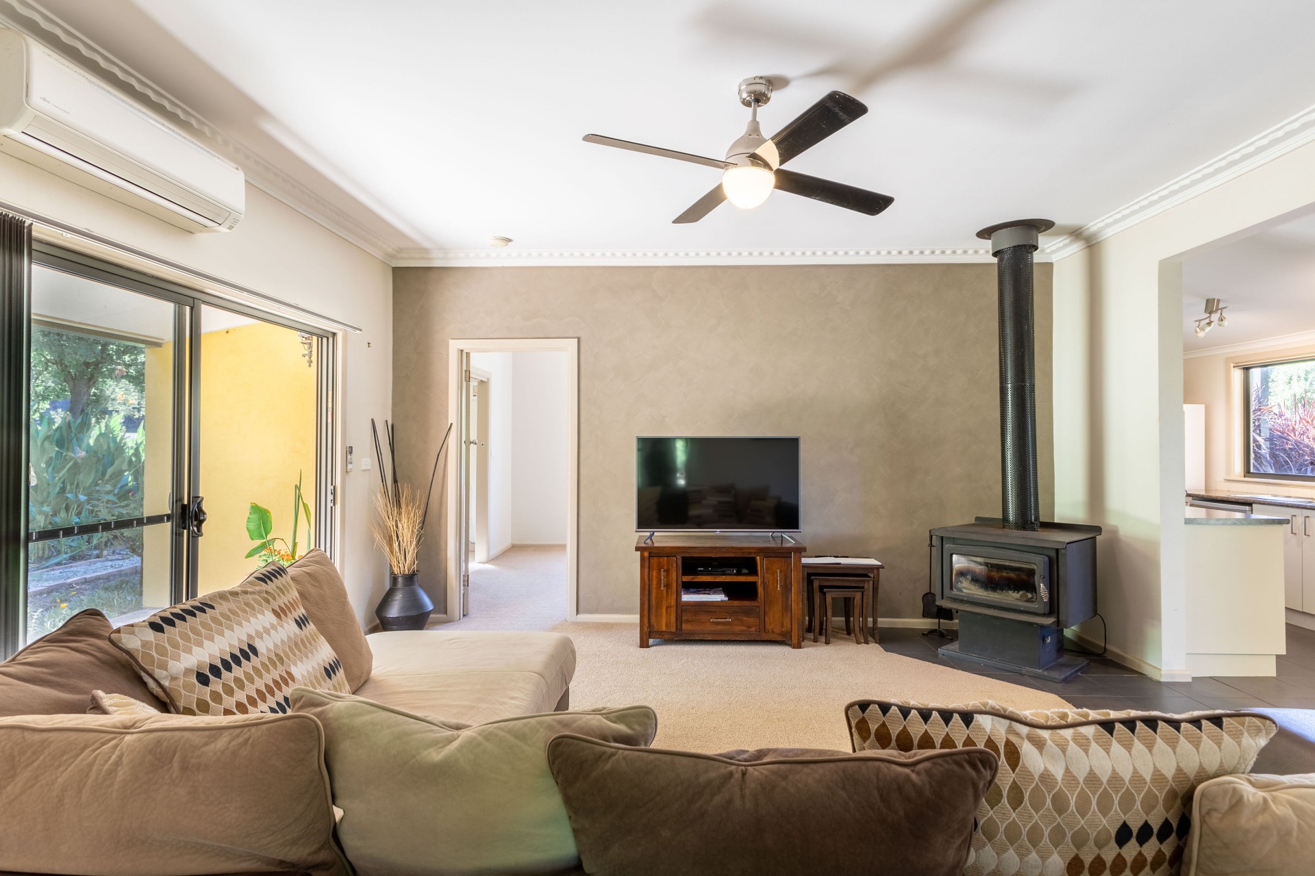 There is a wood heater in the living room, split system heating and cooling and verandahs at the front and back. Bedrooms are all of generous size with BIR in the main bedroom.