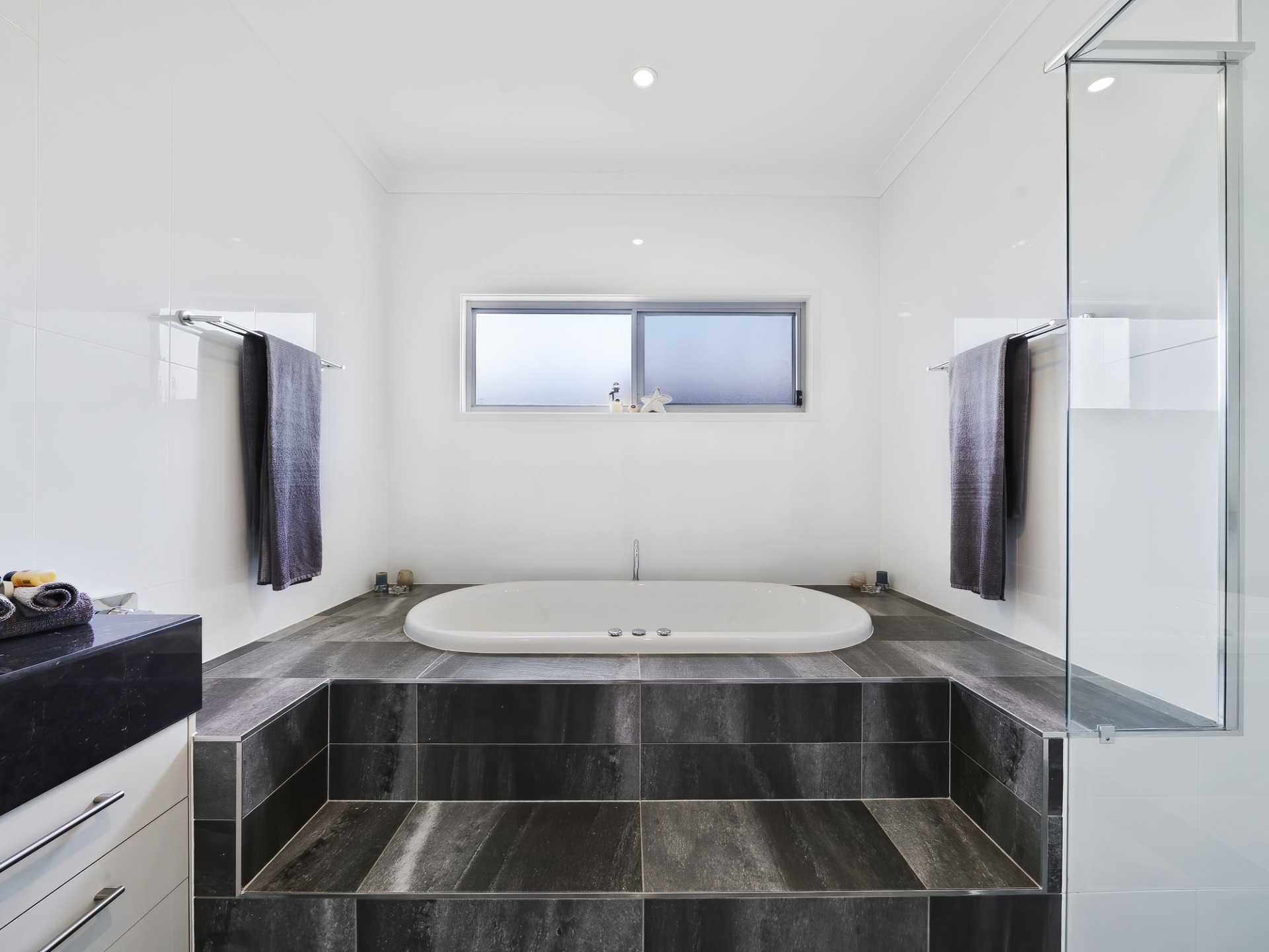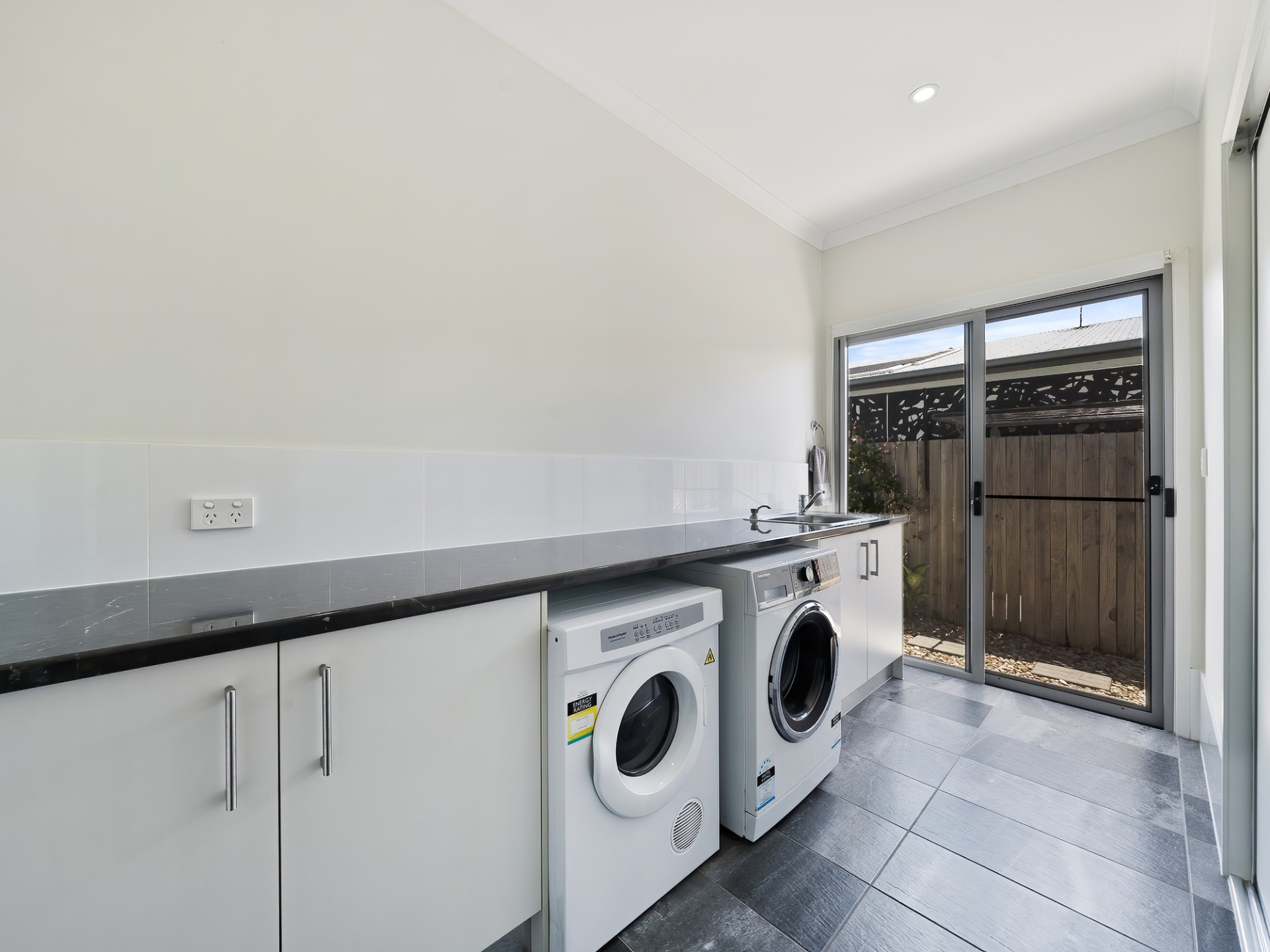 • a large laundry with a built-in linen cupboard and a long bench
