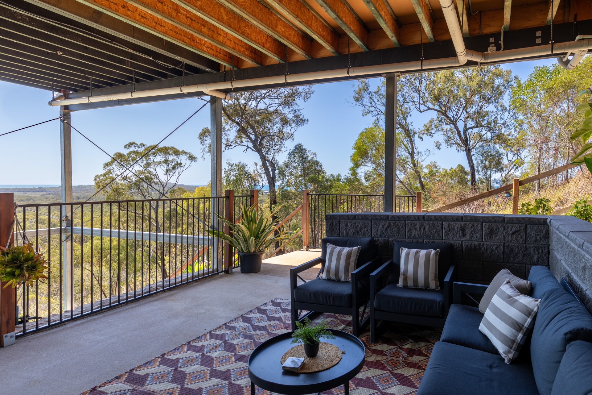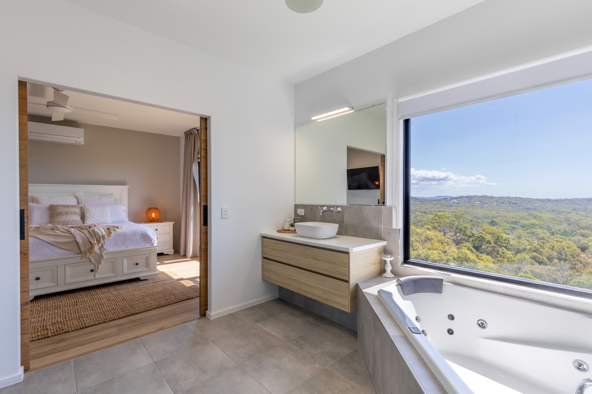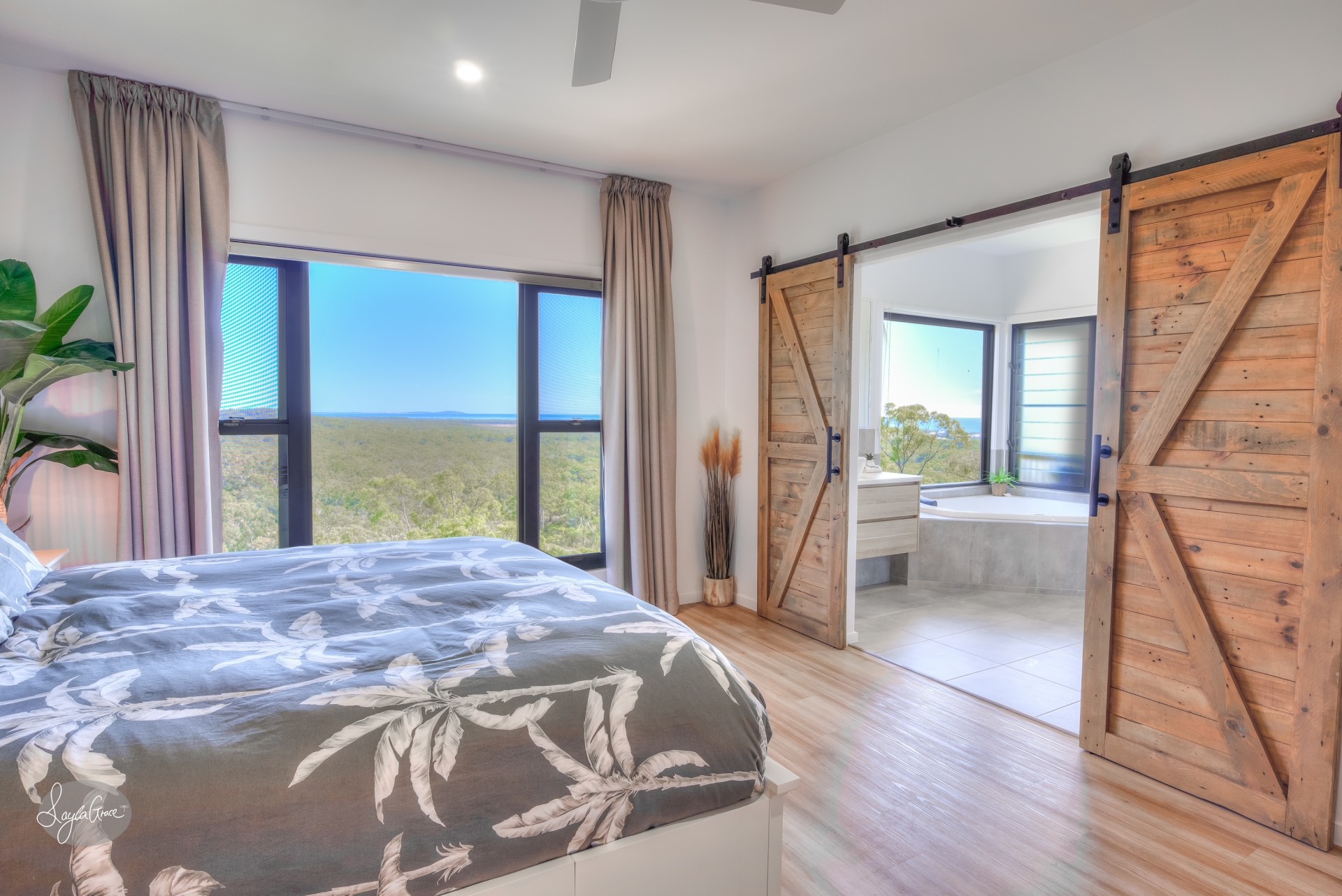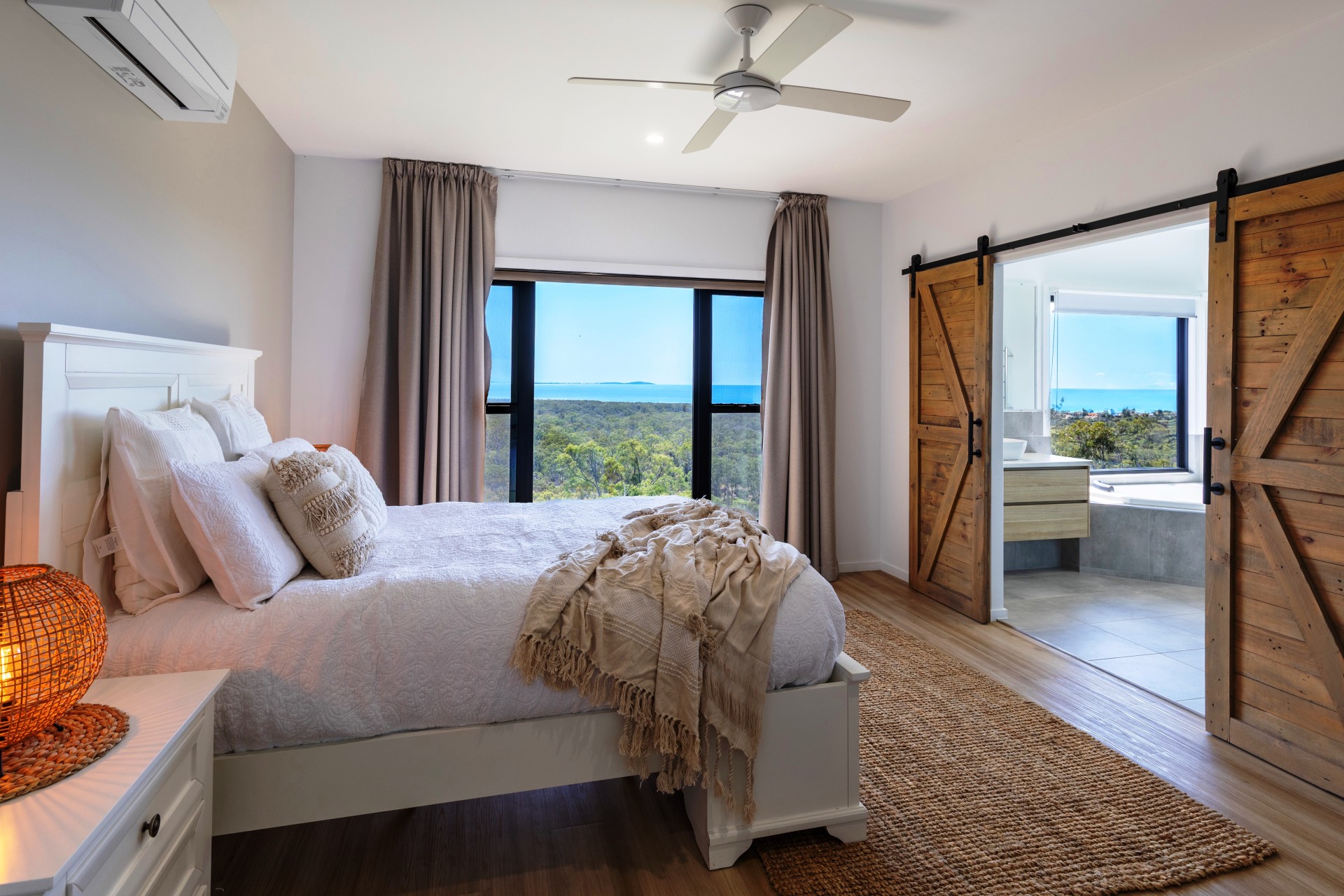 The phenomenal master bedroom, positioned high amongst the trees encompasses the beautiful hinterland and ocean views. Slide open the stylish barn doors and you'll find a show stopping ensuite that features a double shower and large spa with a giant window so you can sit back, relax and take in the enviable views of Bustard Bay.