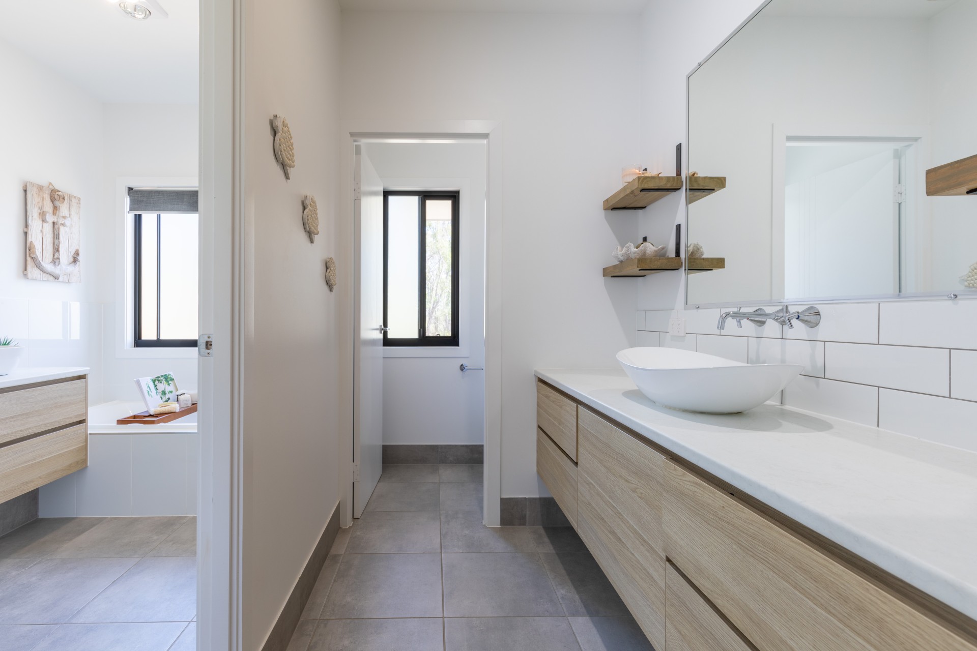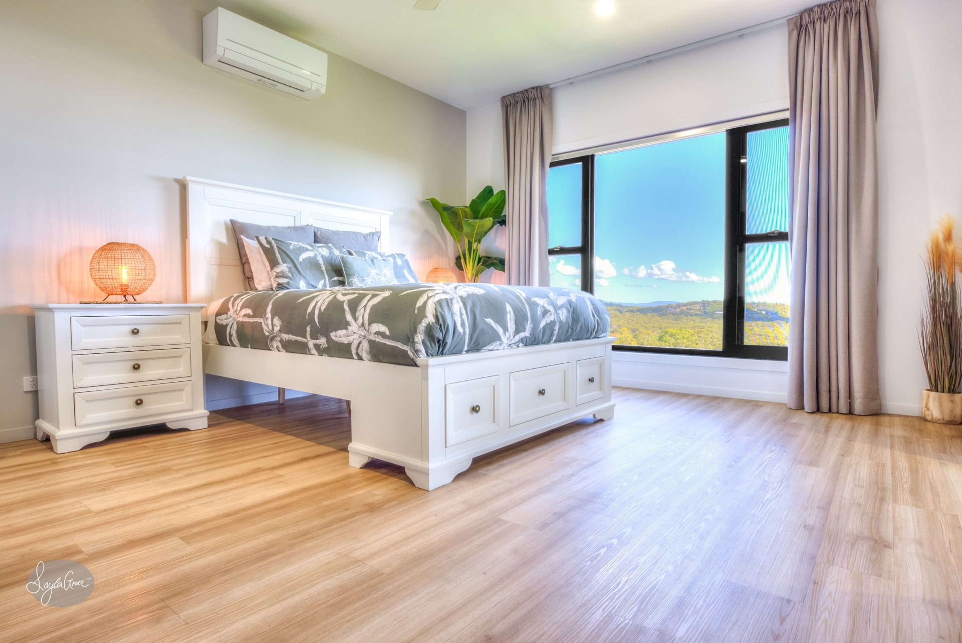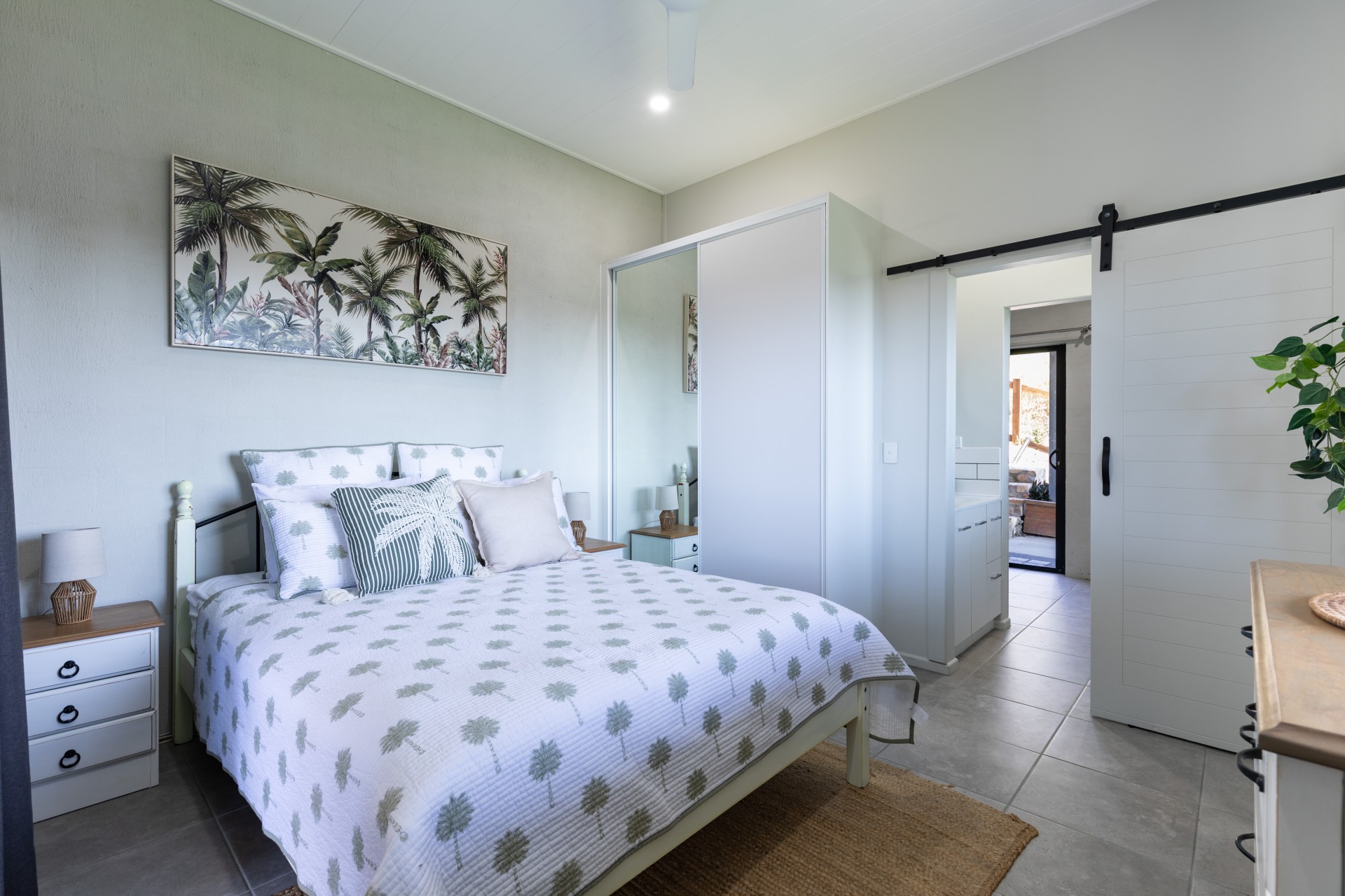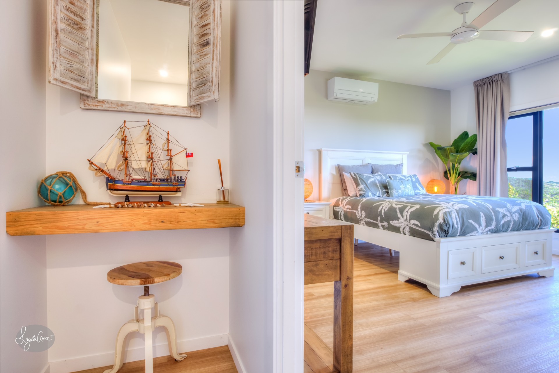The phenomenal master bedroom, positioned high amongst the trees encompasses the beautiful hinterland and ocean views. Slide open the stylish barn doors and you'll find a show stopping ensuite that features a double shower and large spa with a giant window so you can sit back, relax and take in the enviable views of Bustard Bay.