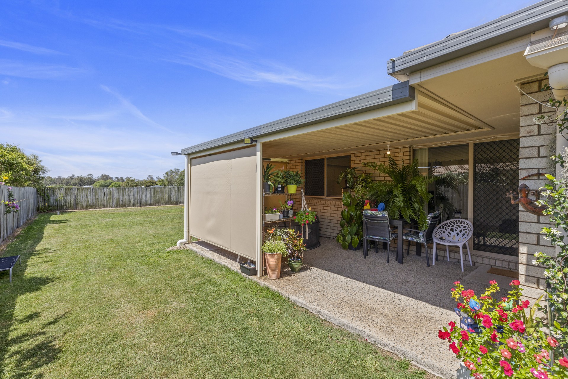 Good sized patio off the family and kitchen area, has 2 large canvas blinds which come down to the ground to keep the wind out or to keep it private.