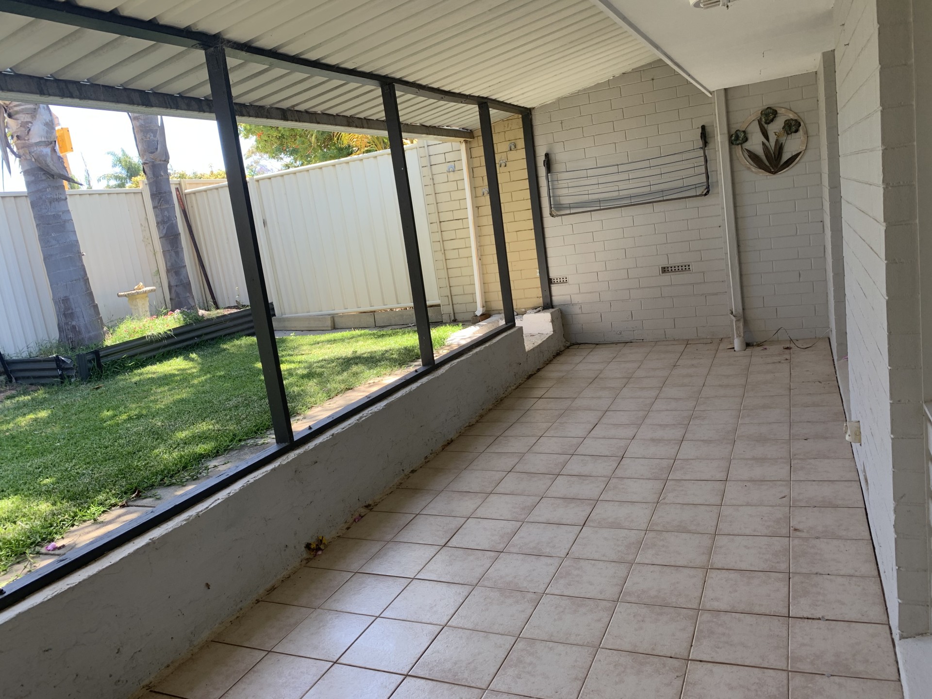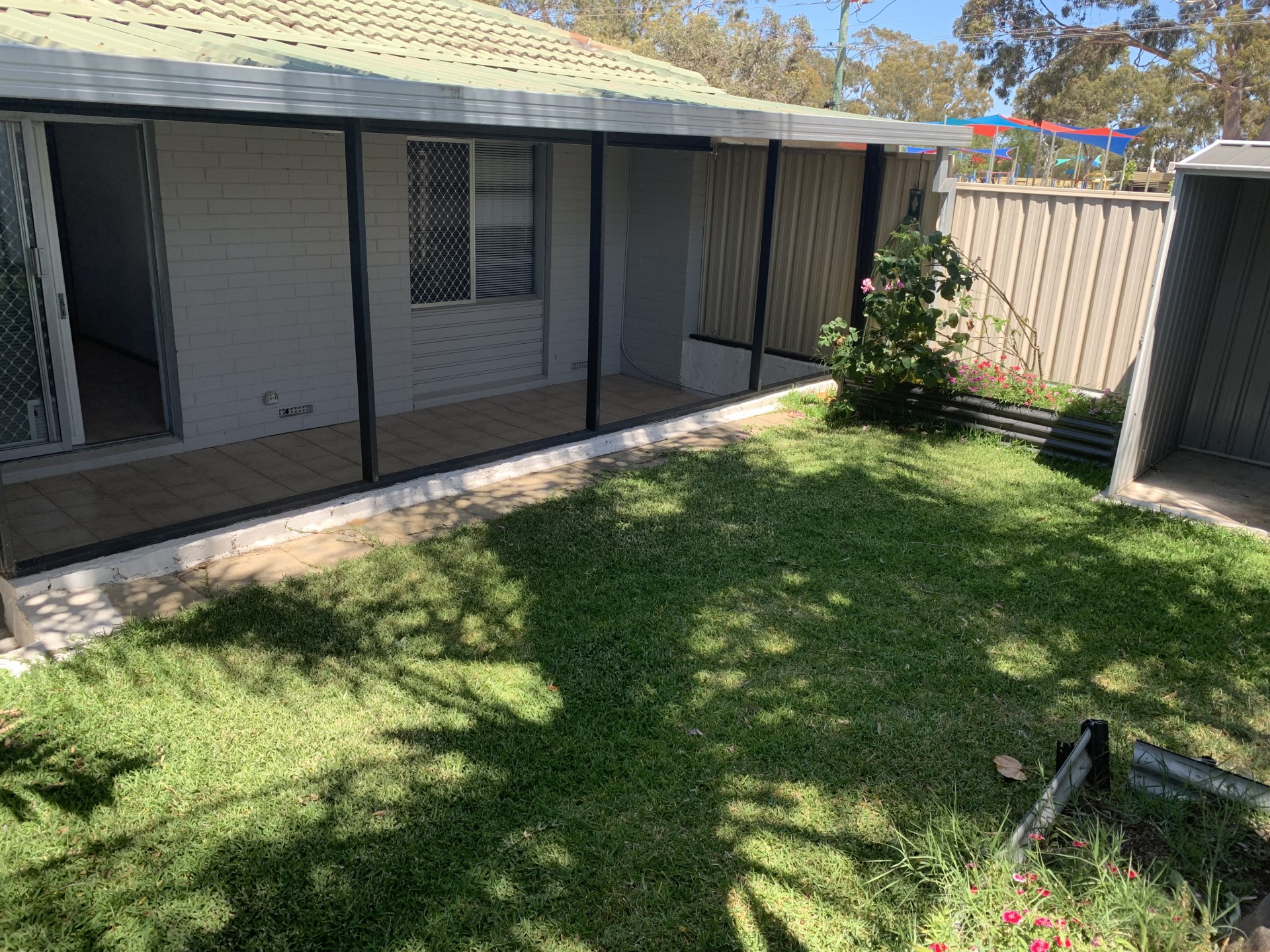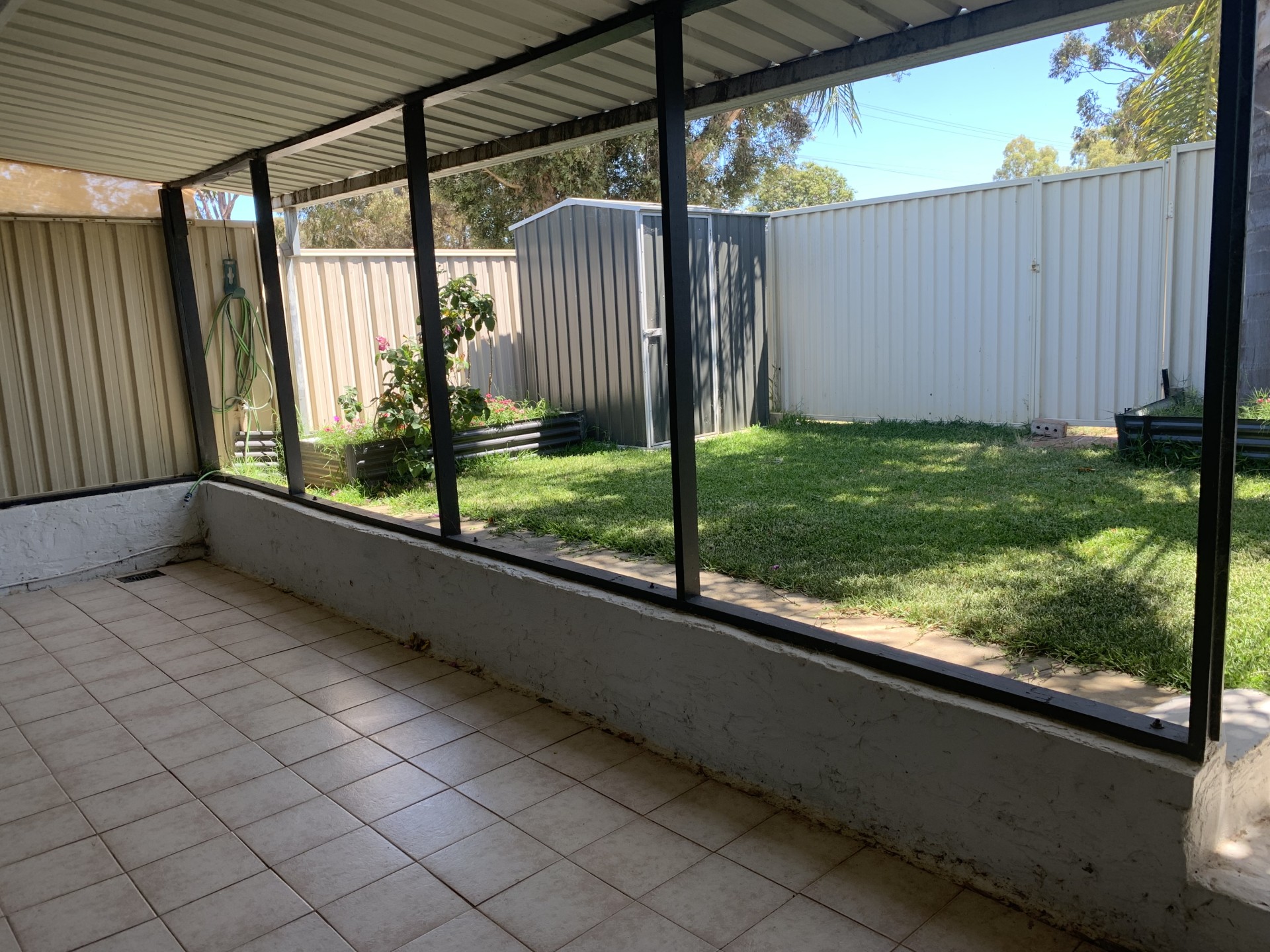 * Backyard with grassed area, garden beds and paved undercover sitting area.