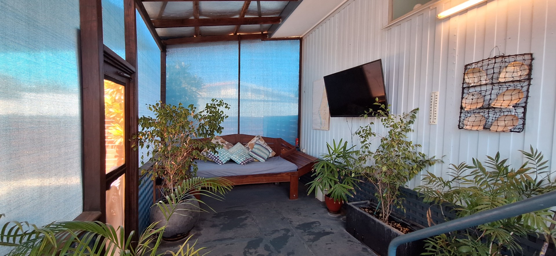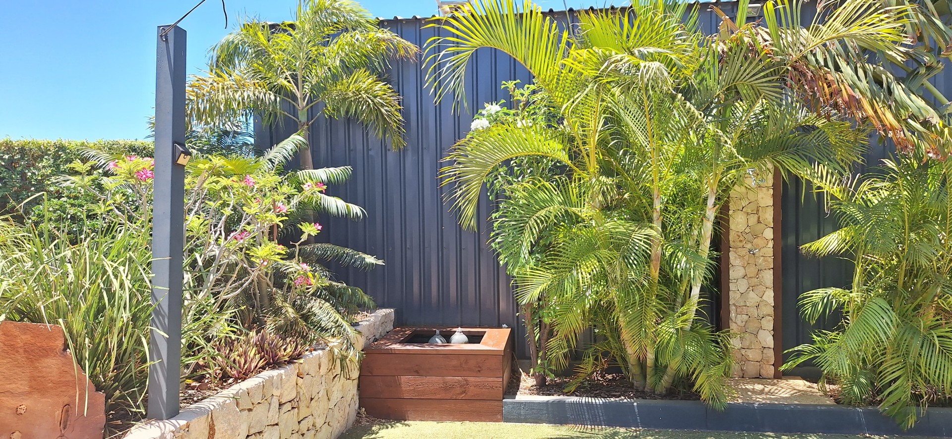 The backyard is a private tropical Oasis with an outdoor shower and water feature with shade sail.