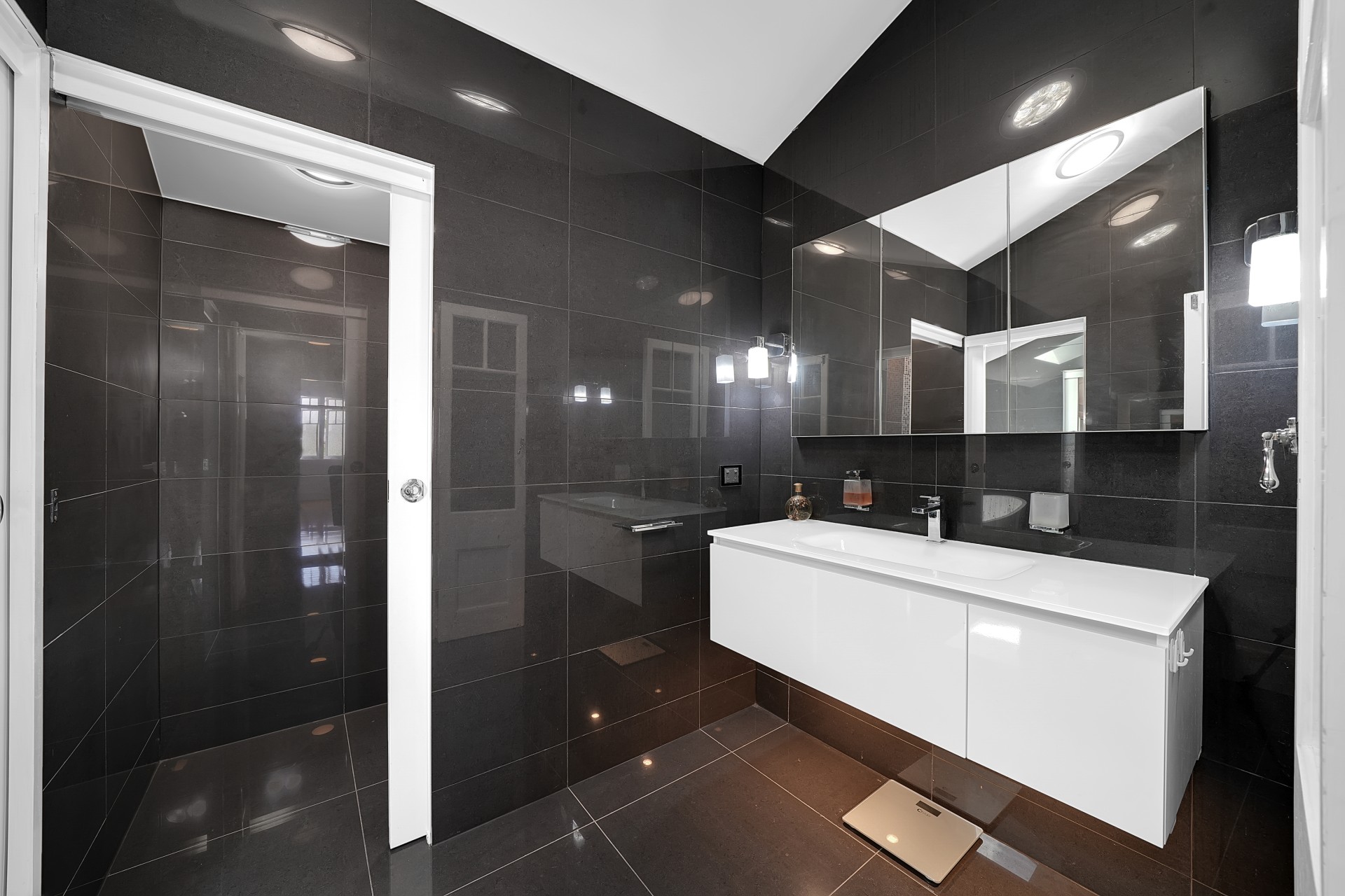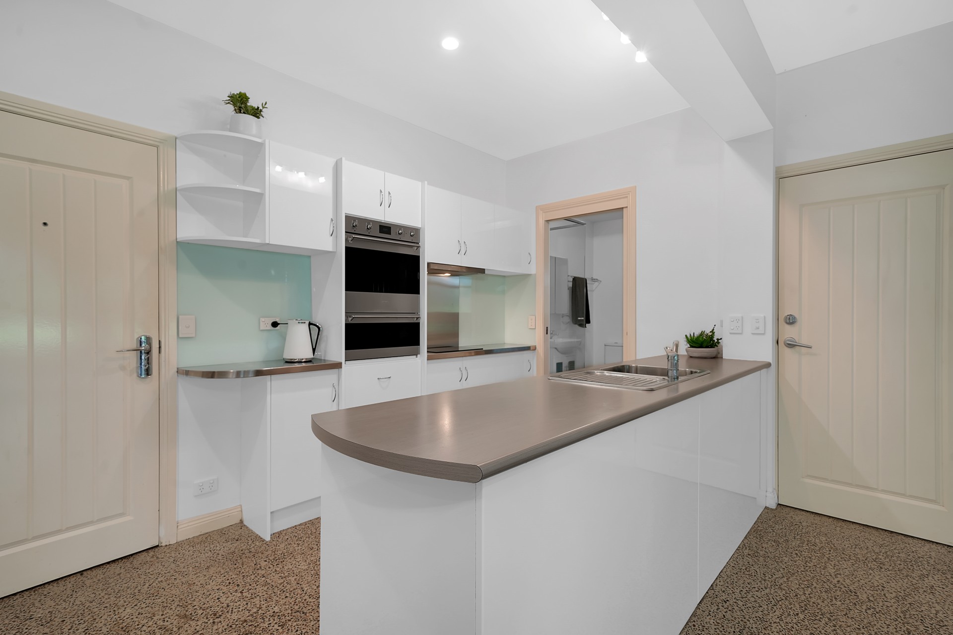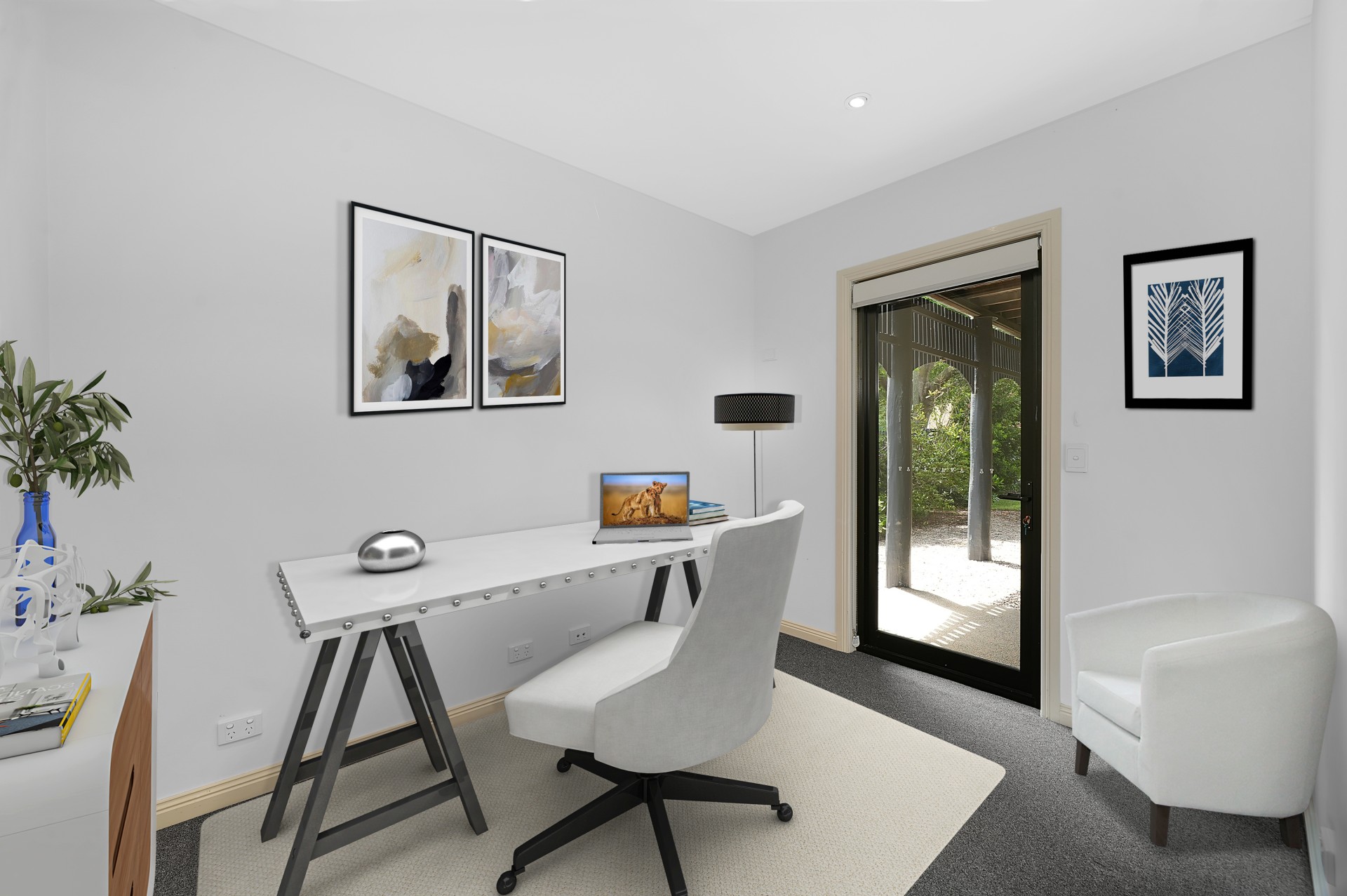 The lower level offers a full kitchen, ample living area with high ceilings, bedroom with built-in robe, airconditioned office and covered outdoor area, with direct garage access.