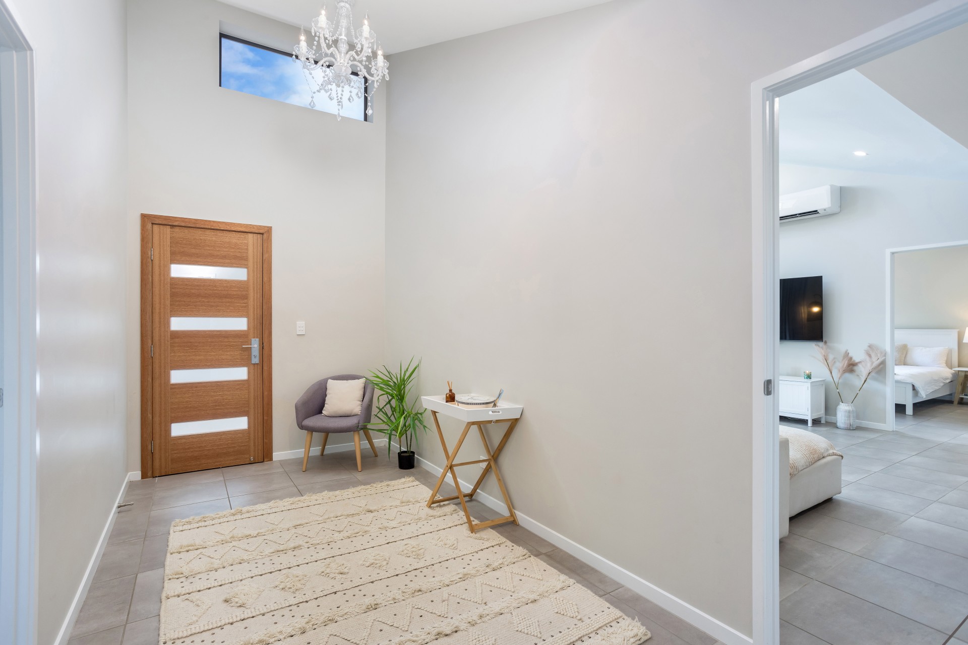 -Grand entrance, tiled floors throughout, and soaring incline ceilings.