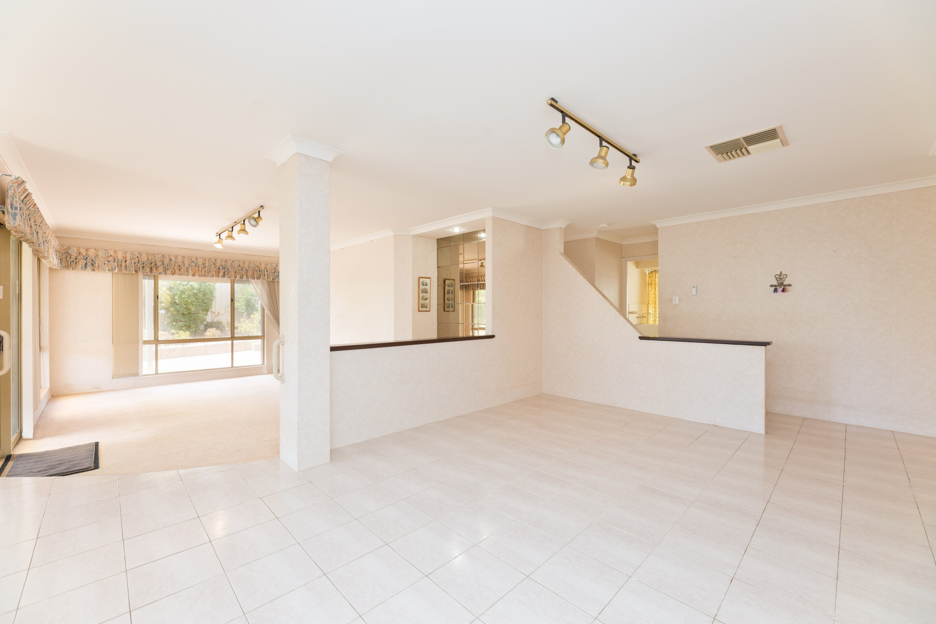 The centralised tiled family room with recessed shelves and cupboards is ideal for relaxing or casual entertaining. The nearby cosy meals area with its large corner window is set off the passageway. The sunken games room with its bar feature and square tiled windows and cupboards is perfect for a game of snooker or as an extension to the entertaining area.
