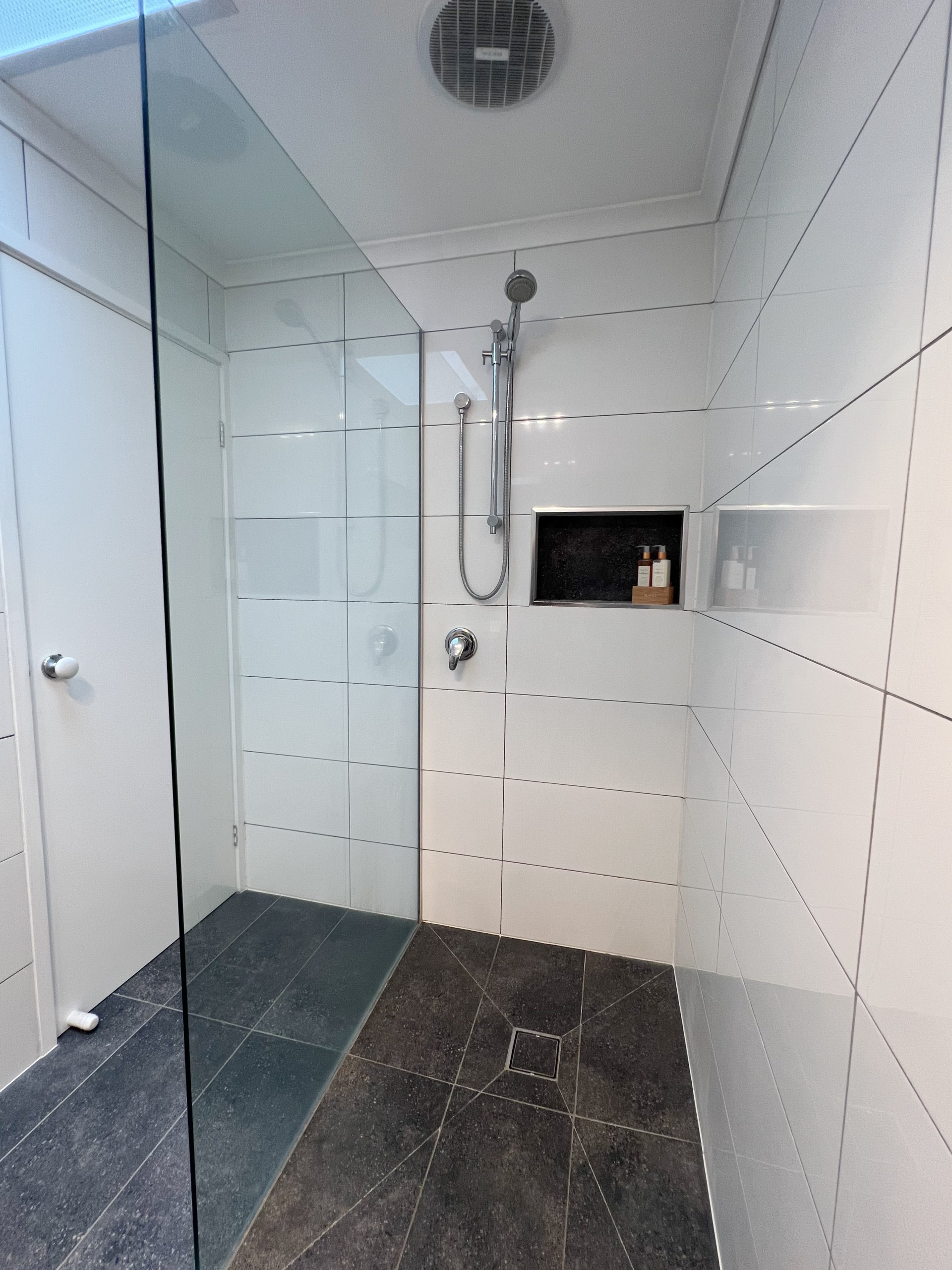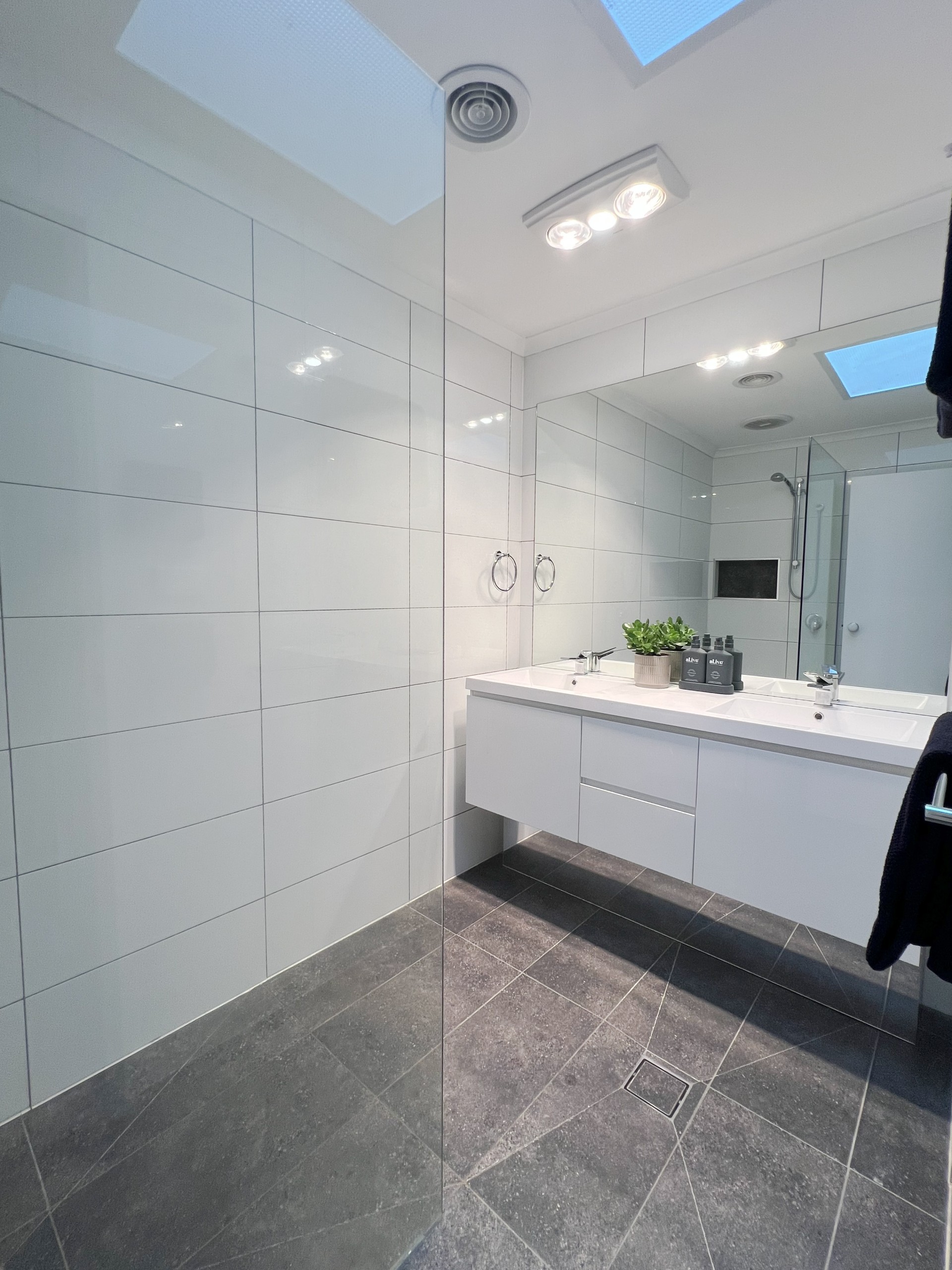 • Newly renovated bathroom with double vanity, floor to ceiling tile and separate toilet