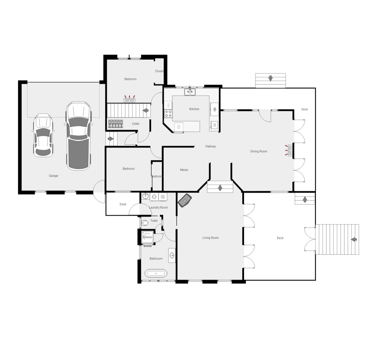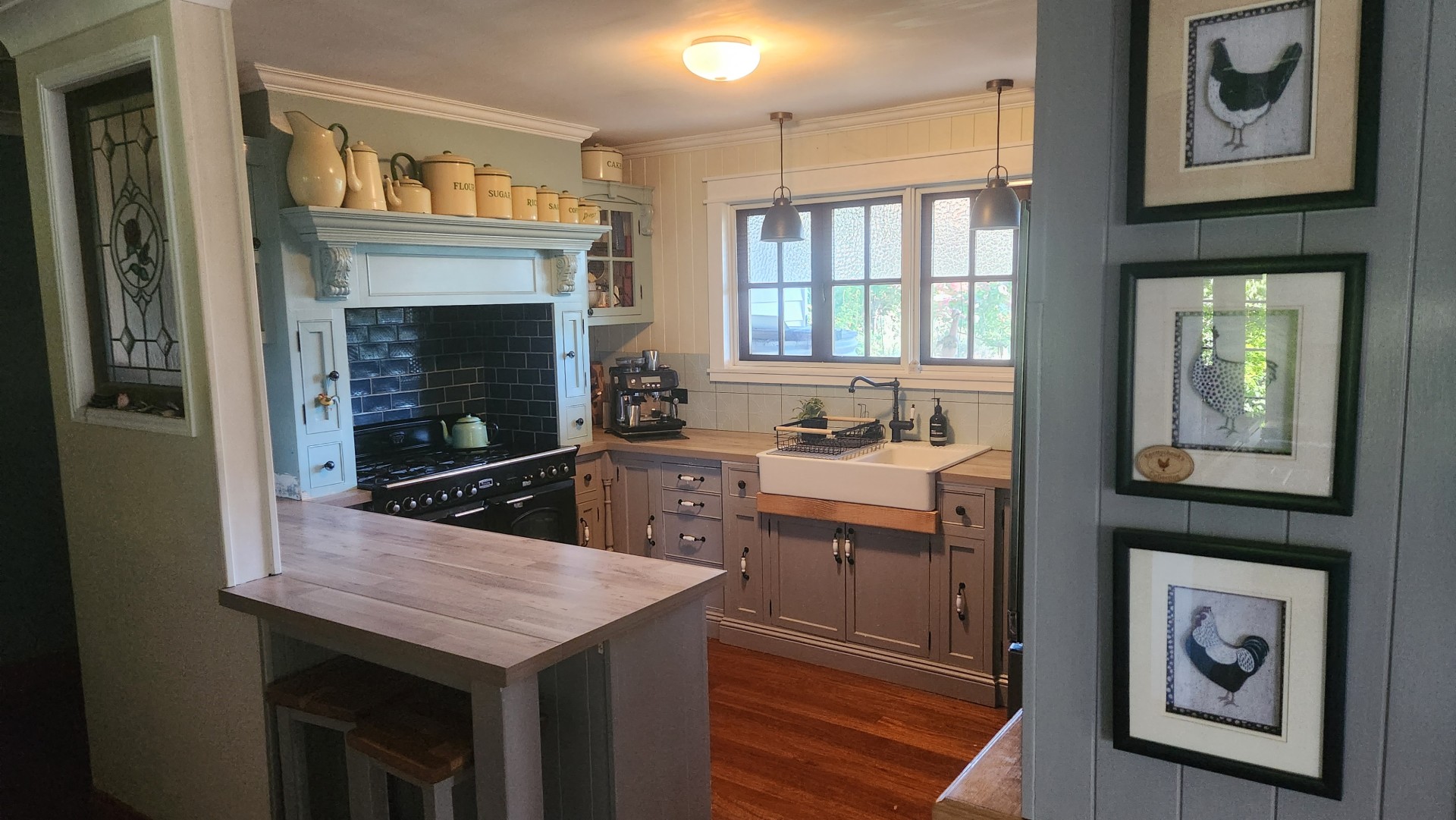 Downstairs, there is a large lounge, dining room , meals area, bathroom and laundry. Also on this level you will find the beautifully appointed Farmhouse style kitchen complete with Falcon gas / electric cooker, recess and mantle.