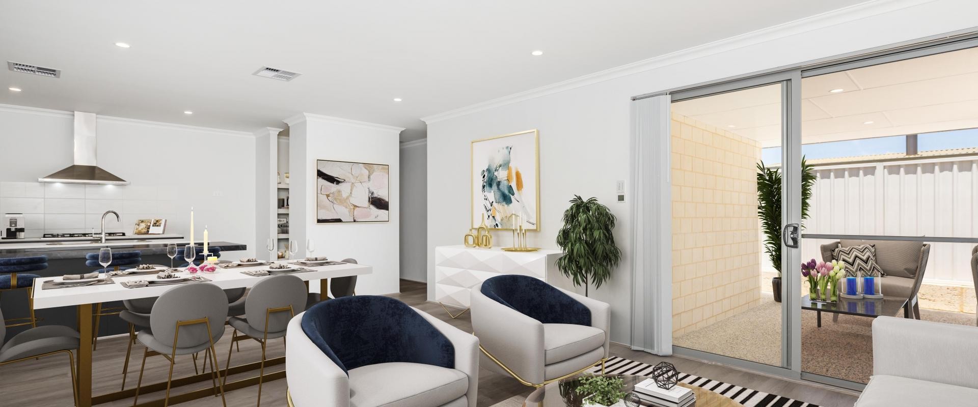 Open plan living, kitchen and dining with high ceilings and down lights throughout