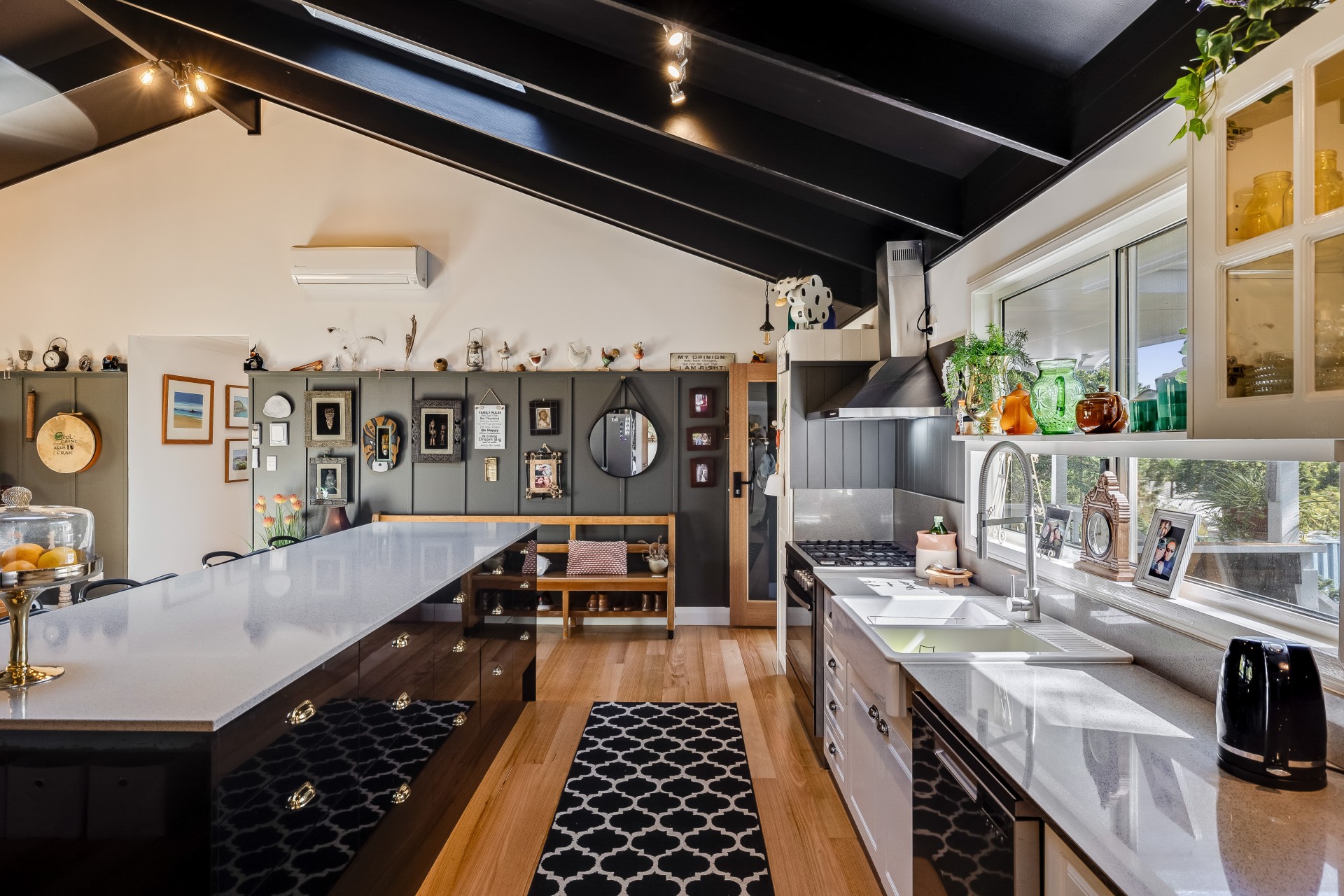 The dramatic raked ceilings with exposed beams are the focal feature in the main living space which is the true hub of the home as the southern ash timber flooring flows through this truly breathtaking room. The entertainers kitchen is soaked in natural light through the above skylights and has been expertly finished, a large 3.5m island, stone bench tops and 6 burner gas cooktop is any aspiring chefs dream.