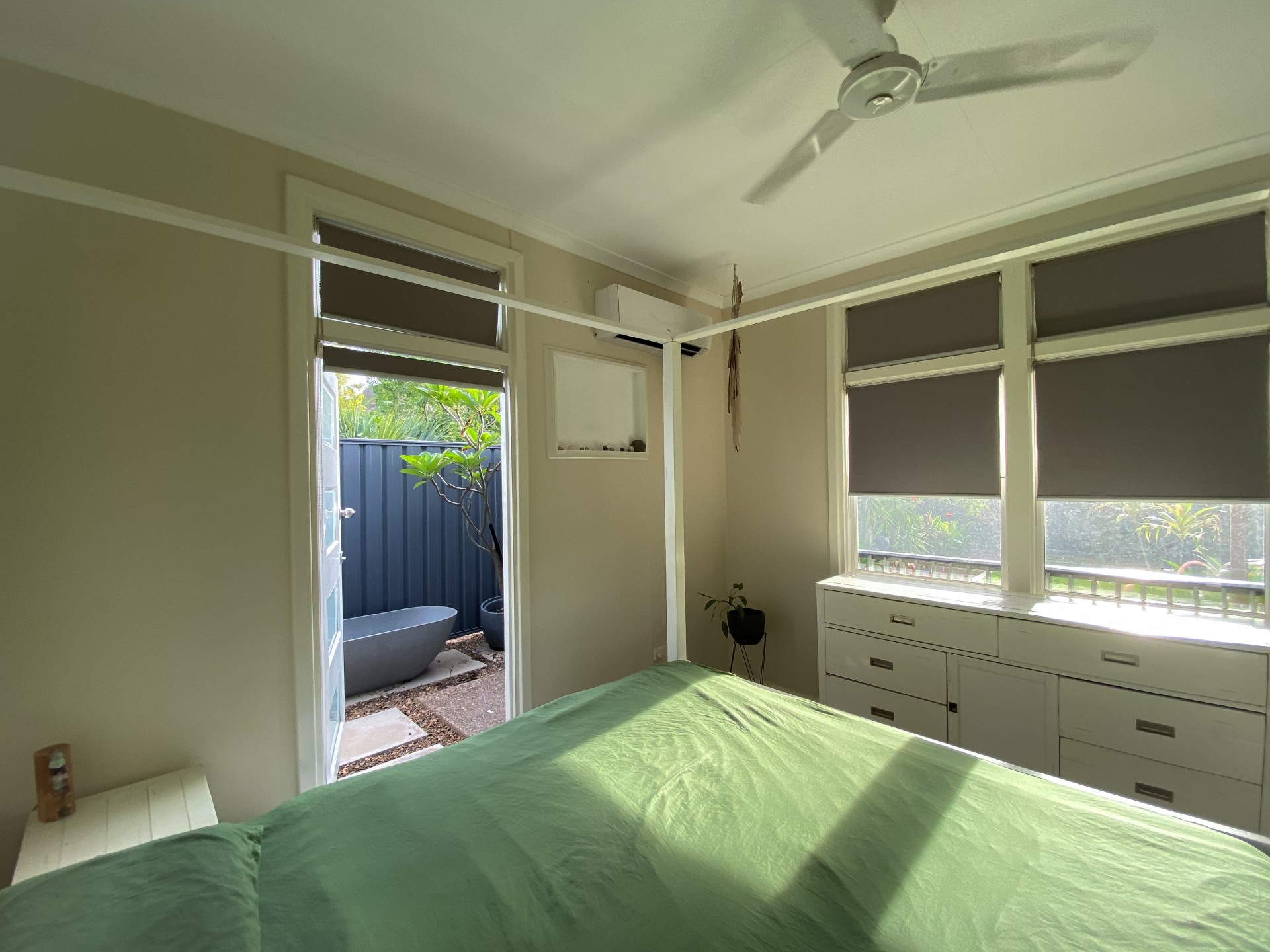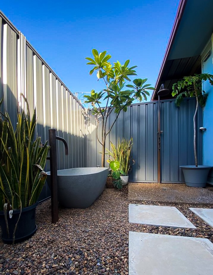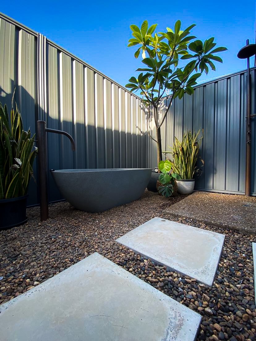 -Outdoor en-suite bathroom with stone composite bath tub & Copper stand alone shower/bath fittings