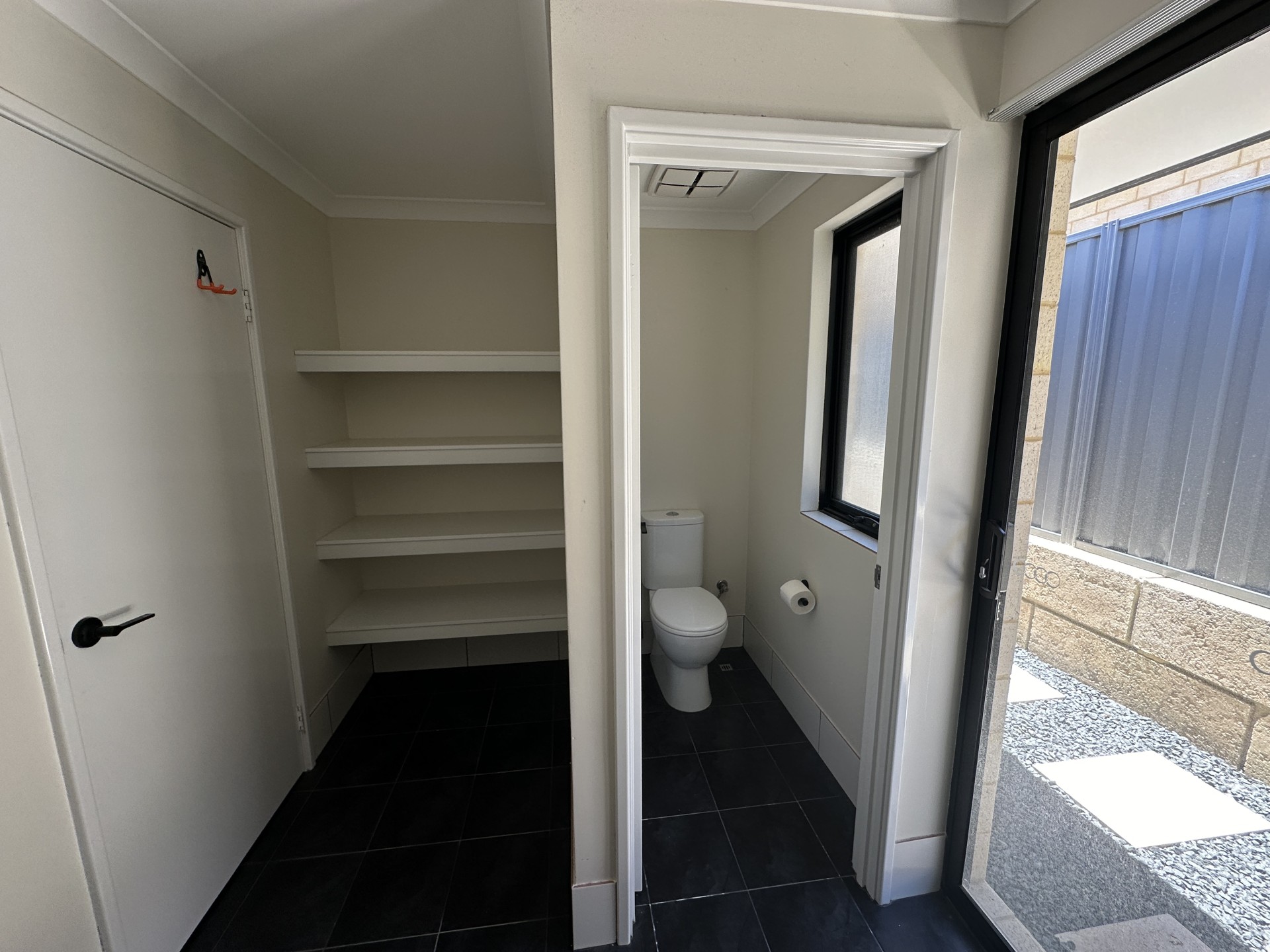 The interior living space consists of a separate home theatre, open plan indoor-outdoor living area, master bedroom with walk in robes plus ensuite with double shower head, sink and toilet. The second and third bedrooms are generously sized with full height sliding robes and share the main bathroom. The laundry hosts a linen storage with storage cupboards and a separate second toilet, with a sliding door leading outside to a paved area.