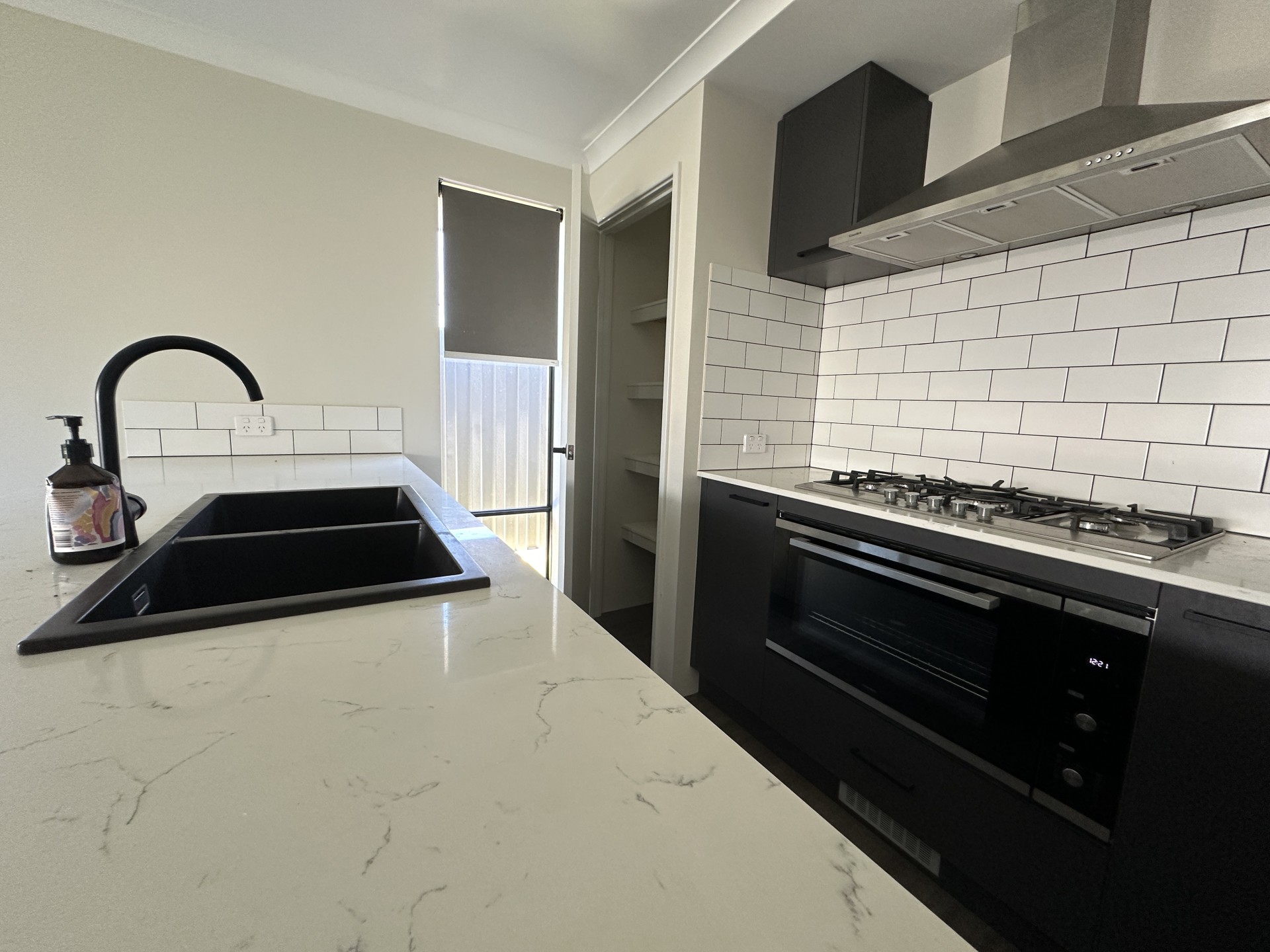 The well-appointed kitchen presents a striking centrepiece to the main living area with stone bench tops, accent black fixtures, pantry, and quality stainless steel appliances including dishwasher, gas stove top, under bench electric oven and range hood.
