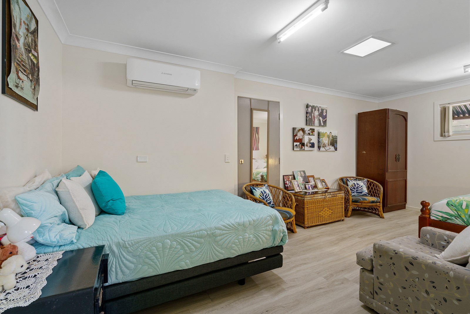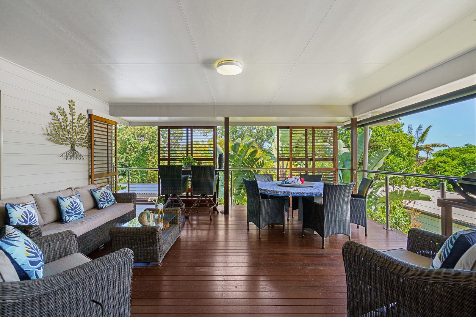 Upstairs there is three bedrooms, two bathrooms (ensuite to the Master), space kitchen with all modern appliances polished timber floors throughout and the lounge leads out to a large private deck with views of Moreton Bay. Downstairs is accessed by internal stairs or a rear keyless entry and is fully self-contained. It has another huge bedroom, bathroom, kitchenette, laundry and large lounge area opening onto the patio and gorgeous yard and garden.