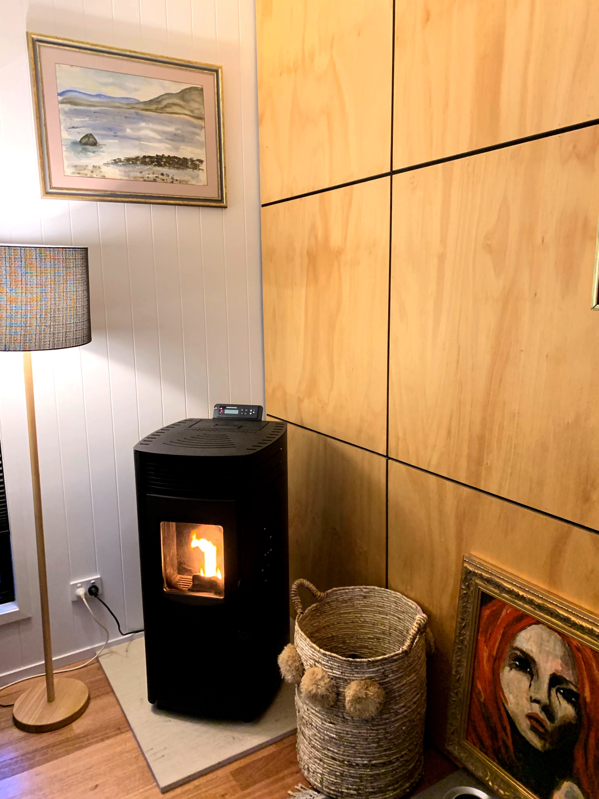 There are panel heaters in the bedrooms and bathrooms, and a lovely wood pellet heater in the living room which keeps the house toasty in winter. It only requires refilling from a bag of pellets; it starts at the push of a button. The house is very well ventilated, with plenty of windows. There is a heat pump hot water system.