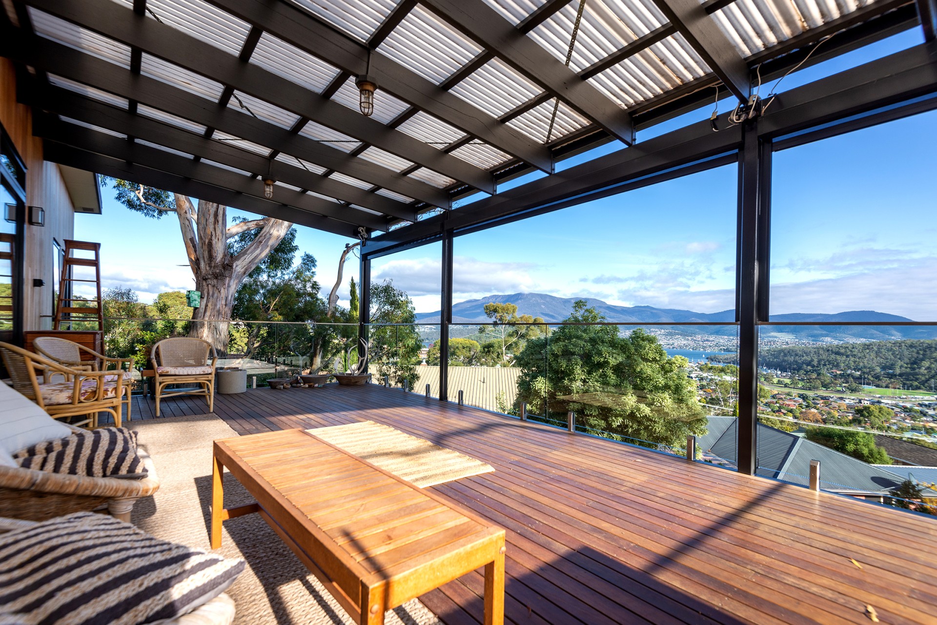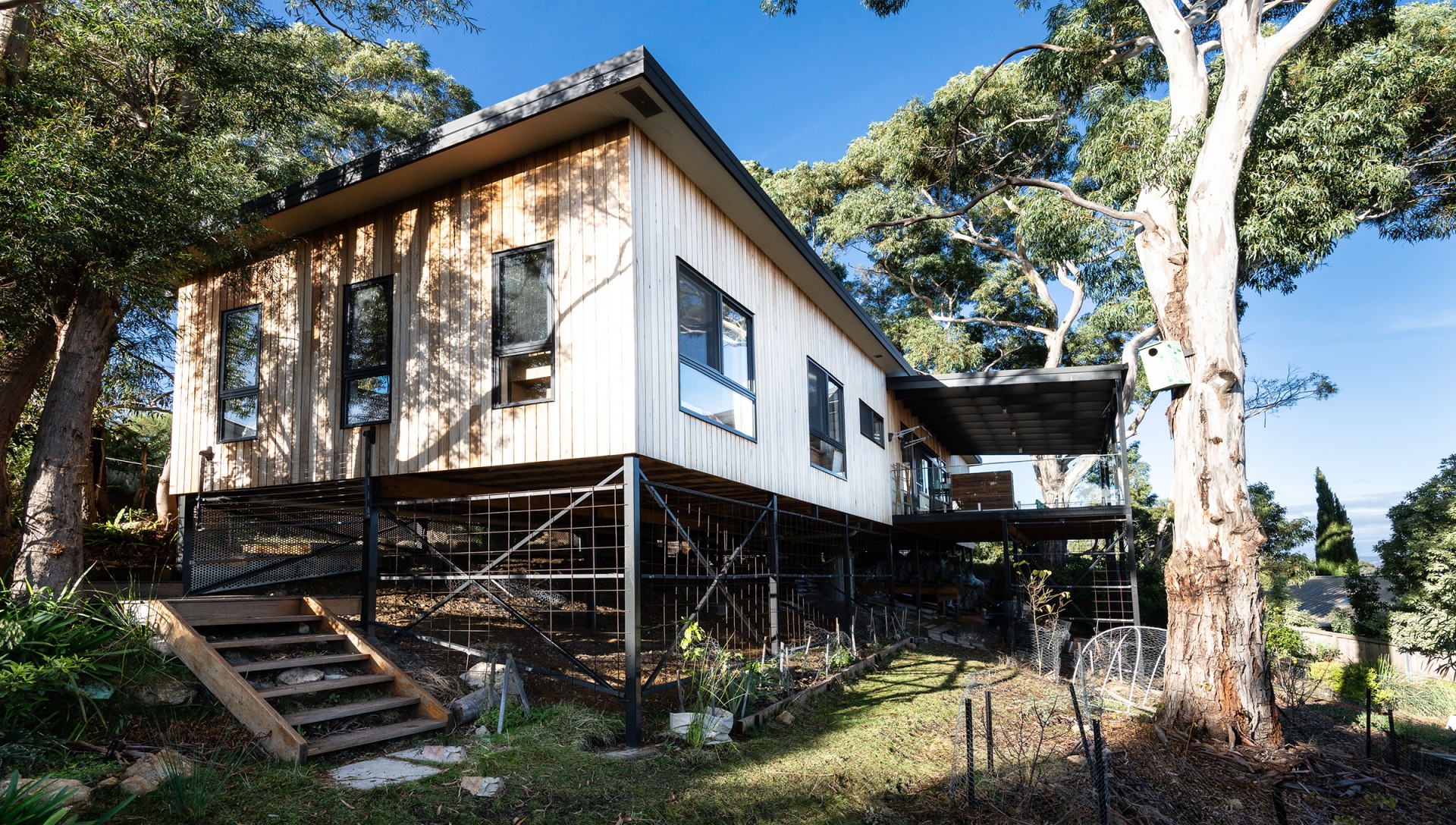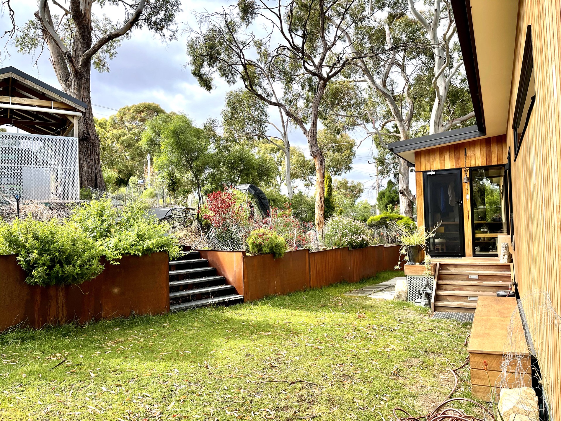 We had fun designing the house. We wanted to take advantage of the wonderful vista and the fresh breezes, so we created a large (9 x 5) verandah with glass balustrades, which also includes an electric blind in several sections, so you can screen bright sunlight if you wish. We also wanted to keep the beautiful large trees on the property. In fact we planted 100 more native trees, put in bird boxes and baths, and a lovely granite basin fountain in the front yard. We installed a korton steel retaining wall for the garden that has that amazing ochre look. We created a unique raised entrance walkway, with slight zig zag angles, utilising a traditional Feng Shui approach, that was also applied in the alignment of the house, and the internal design features of the house. This includes an entry porch that reduces heat loss, and provides a transitional space when entering the house. The bottom yard has an orchard of fruit trees, raspberries, blueberry bushes, and there are raised beds for gardening.