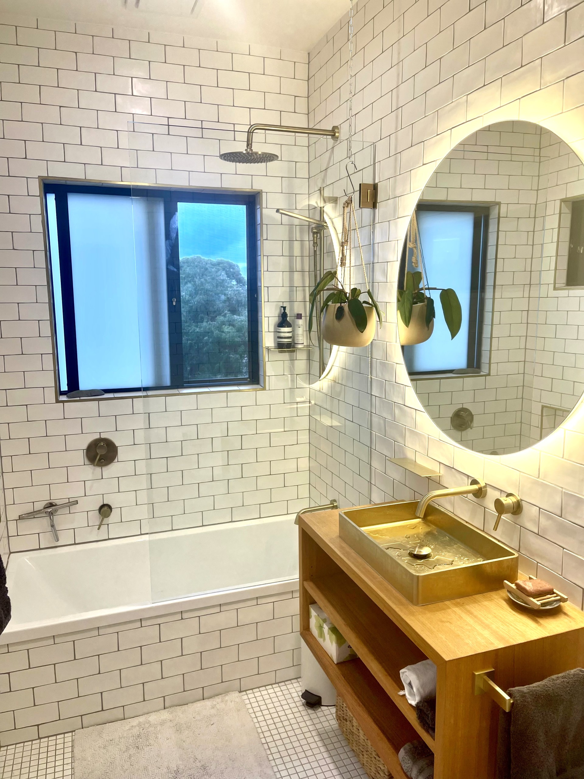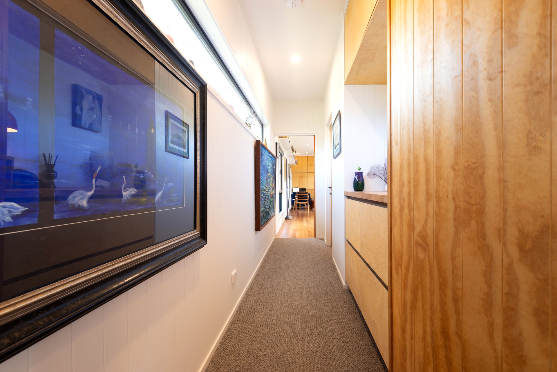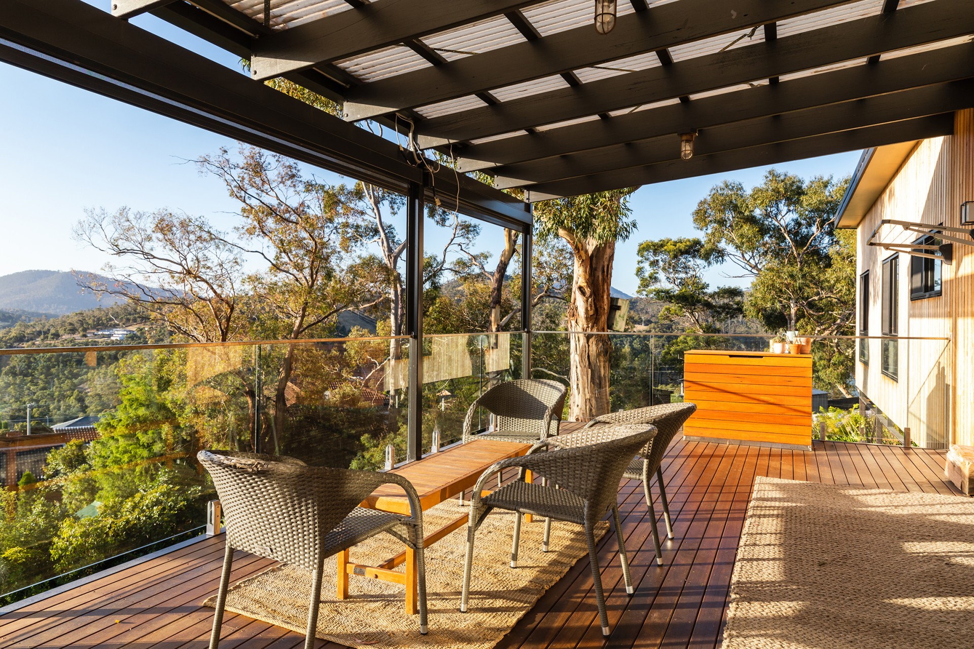 We had fun designing the house. We wanted to take advantage of the wonderful vista and the fresh breezes, so we created a large (9 x 5) verandah with glass balustrades, which also includes an electric blind in several sections, so you can screen bright sunlight if you wish. We also wanted to keep the beautiful large trees on the property. In fact we planted 100 more native trees, put in bird boxes and baths, and a lovely granite basin fountain in the front yard. We installed a korton steel retaining wall for the garden that has that amazing ochre look. We created a unique raised entrance walkway, with slight zig zag angles, utilising a traditional Feng Shui approach, that was also applied in the alignment of the house, and the internal design features of the house. This includes an entry porch that reduces heat loss, and provides a transitional space when entering the house. The bottom yard has an orchard of fruit trees, raspberries, blueberry bushes, and there are raised beds for gardening.