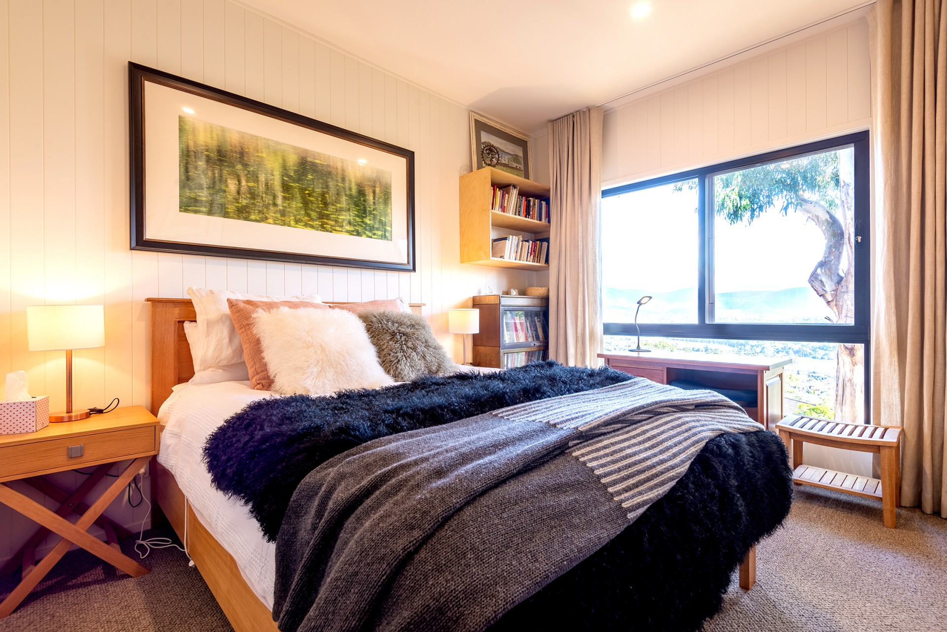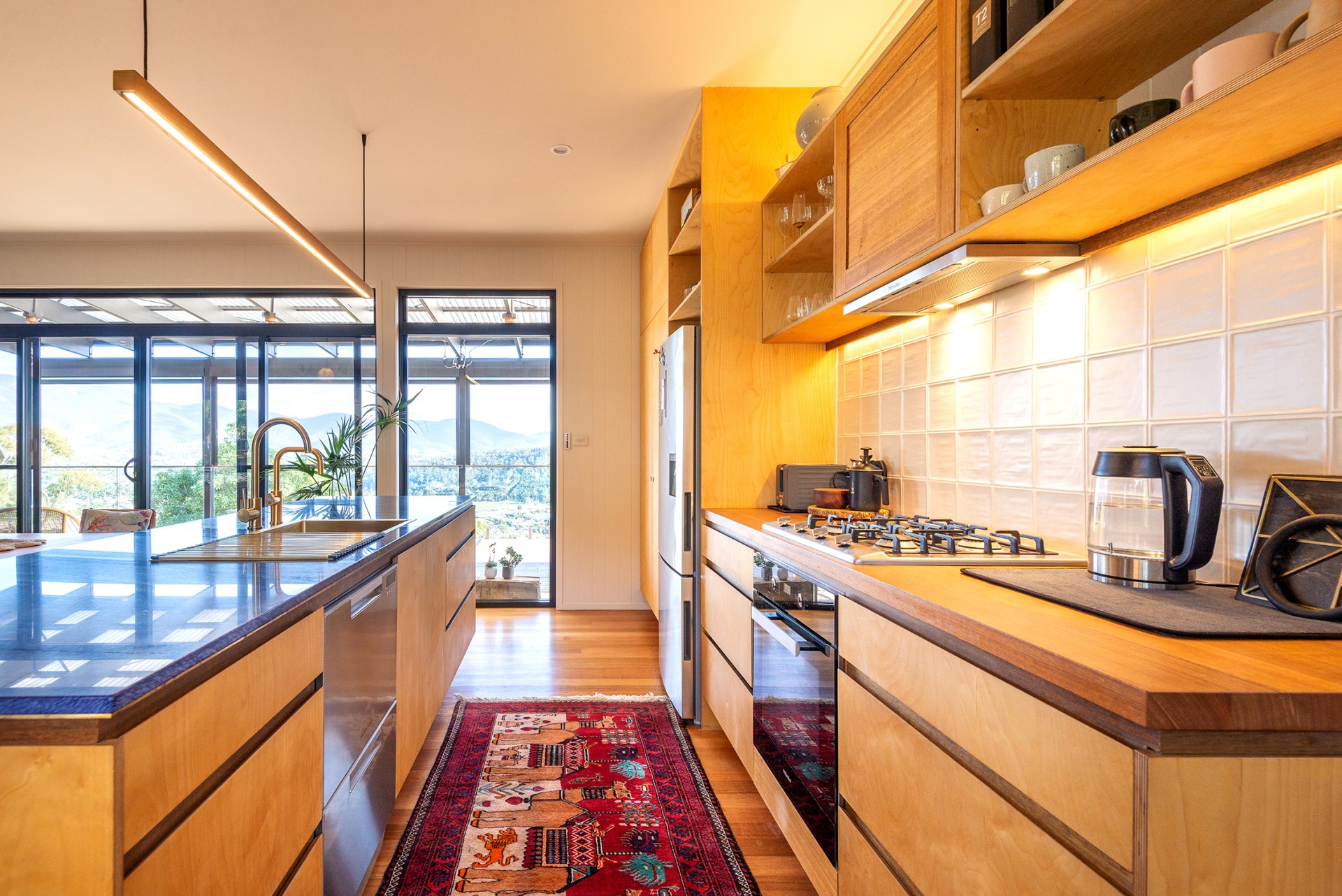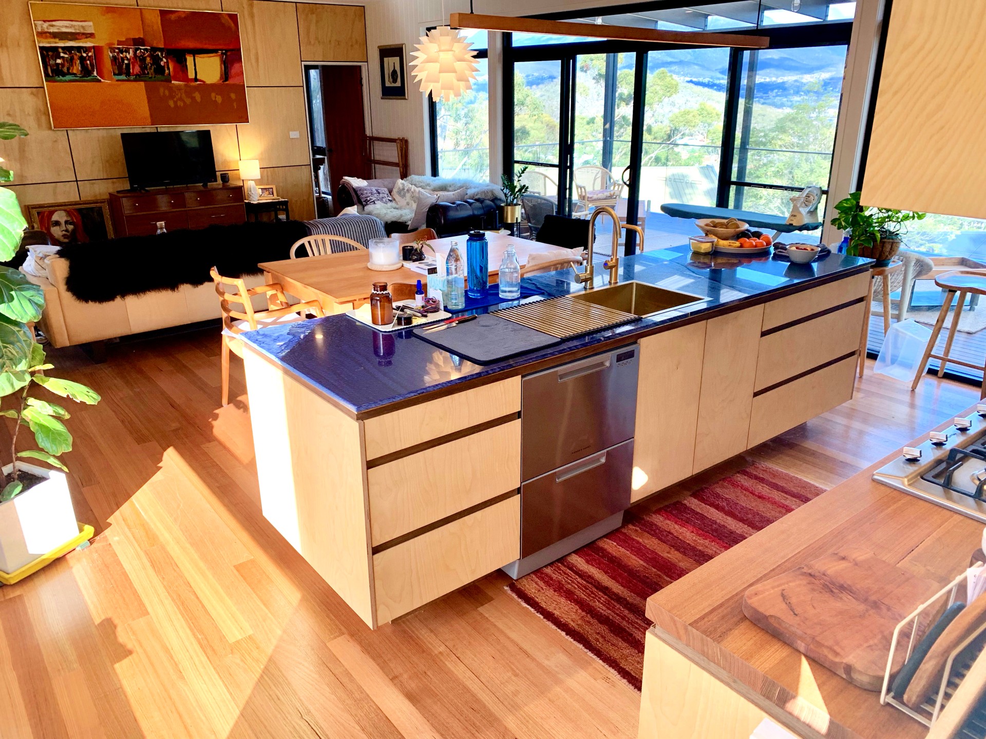 And because its on a hill, there's privacy from neighbours. There are three bedrooms and two beautiful designer bathrooms. The living room/kitchen area is floored with TasOak. The kitchen counter is Brazilian granite - it looks like a work of art, and above the dining table is a unique and striking Christopher Boots crystal lamp.