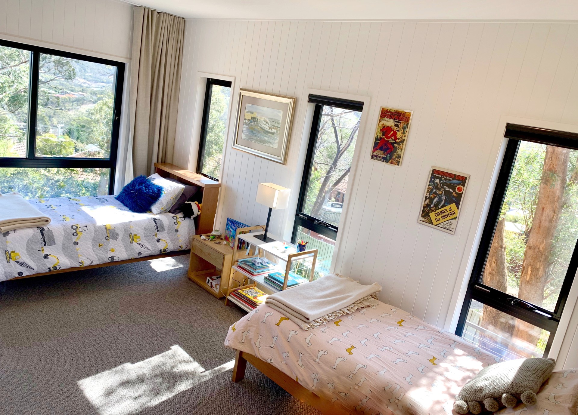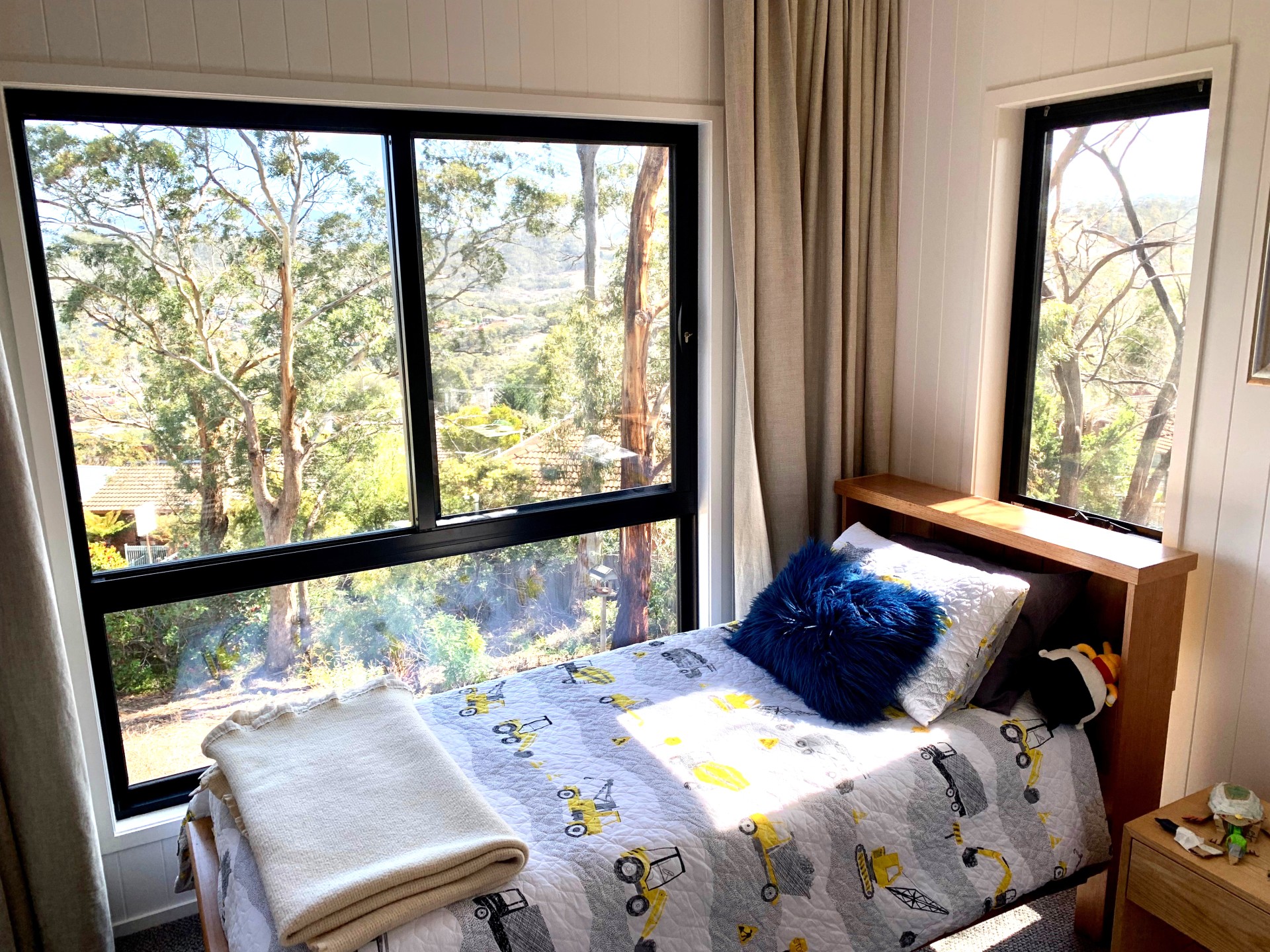 The house is kid and family friendly (our grandkids come regularly to stay); there is a trampoline in the top yard (we are happy to leave that) and the bottom yard is great for kids to explore. Its a dead end street so very safe for kids, and if you head up the hill a few hundred metres theres a large reserve area that children can safely roam in. The end bedroom is extra large, and fits several beds. Its also at the other end of the house to the master bedroom, so you have a quiet space away from kids. There is a school (by the waterfront!) very close by.