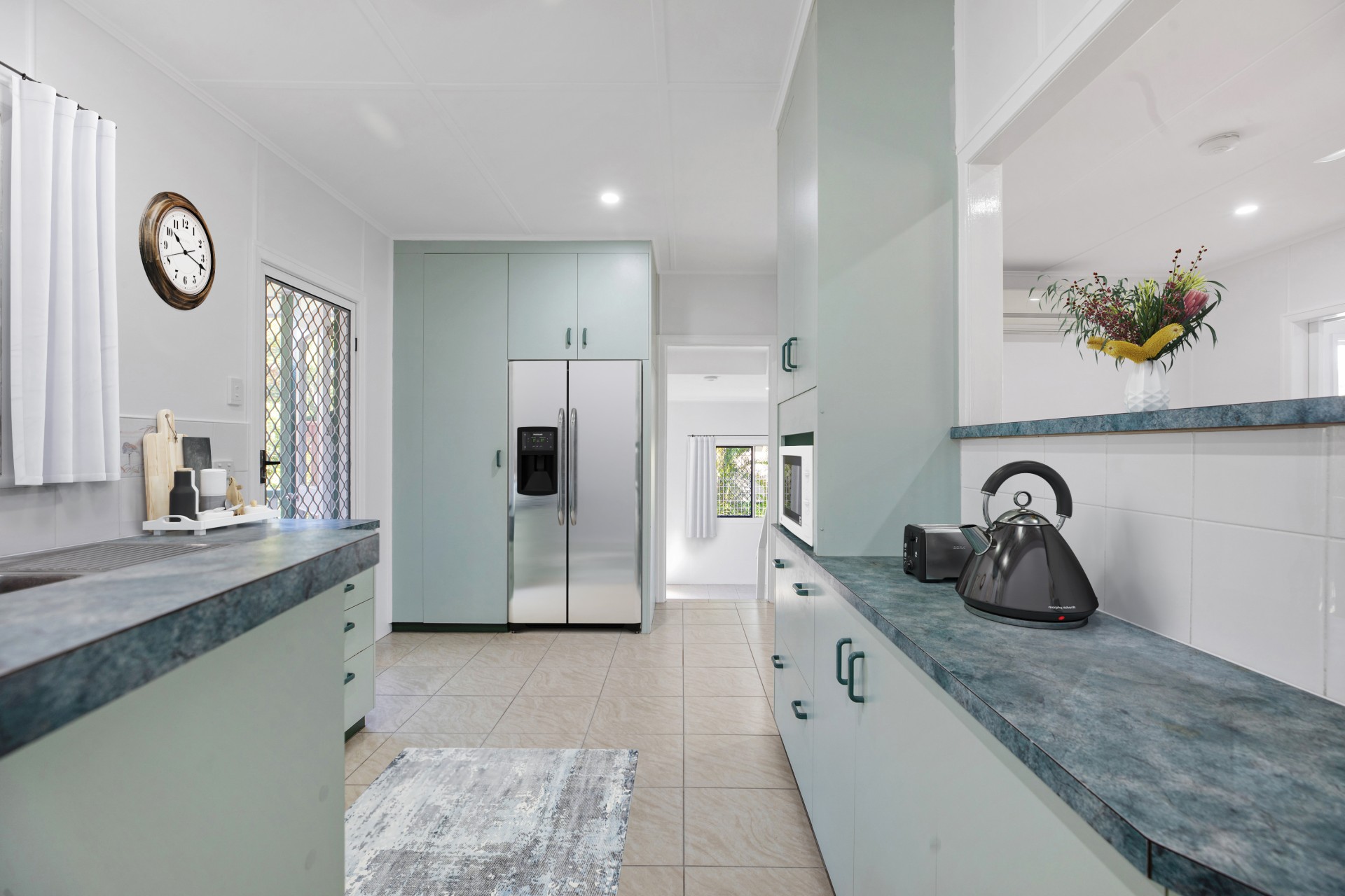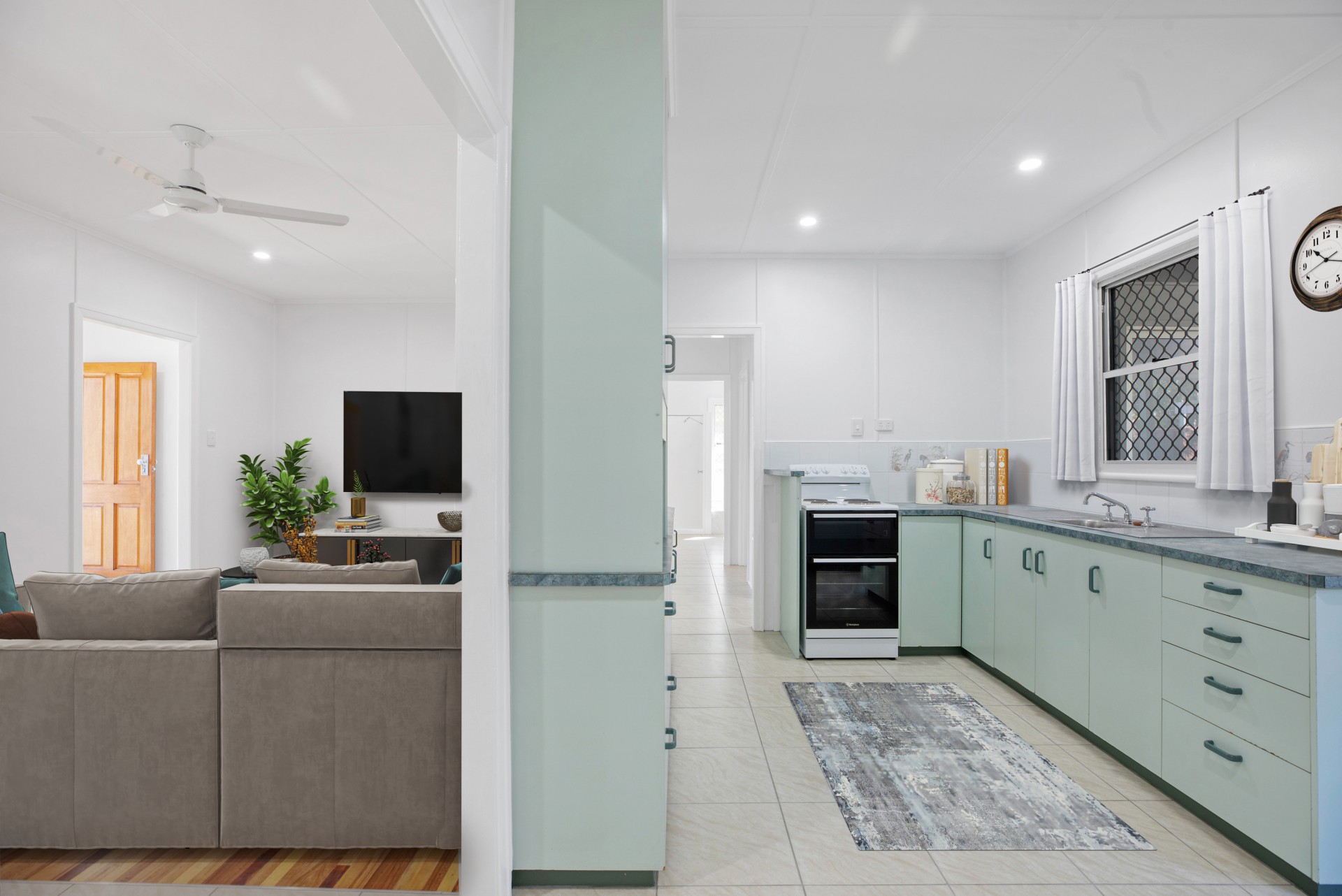 The main living area is welcoming with its polished timber floors and air conditioning, while the custom-made kitchen is equipped with ample storage and new electric stove.