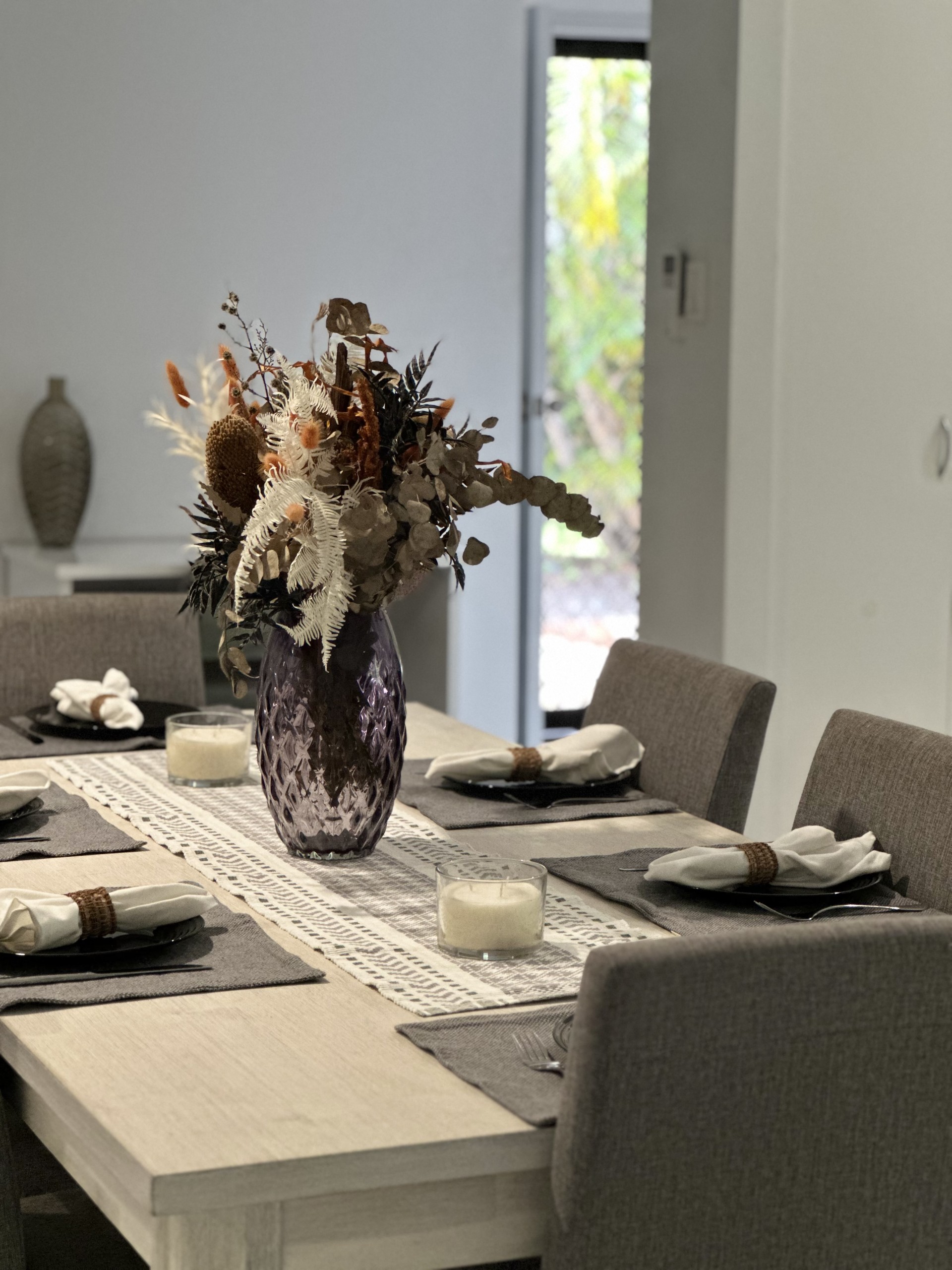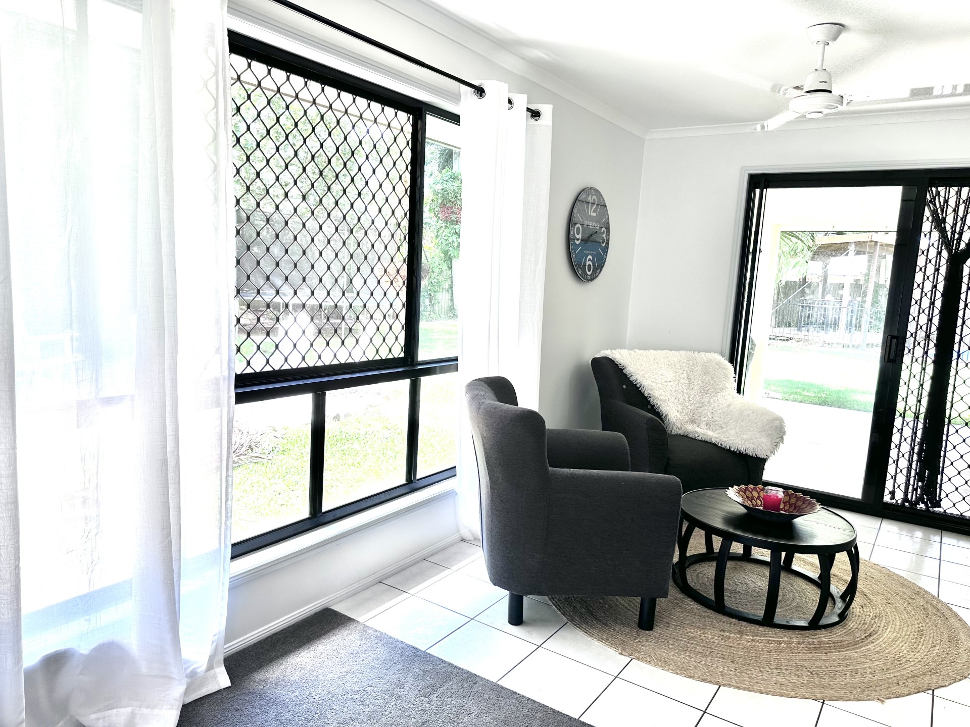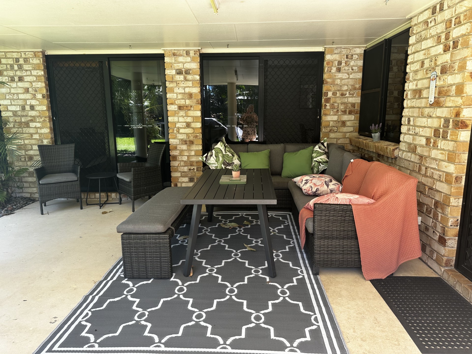 The home's design is both open and airy, with tall ceilings in some areas, promoting a cooler ambiance. Security doors and screens throughout add an extra layer of comfort and peace of mind, even into the garage.