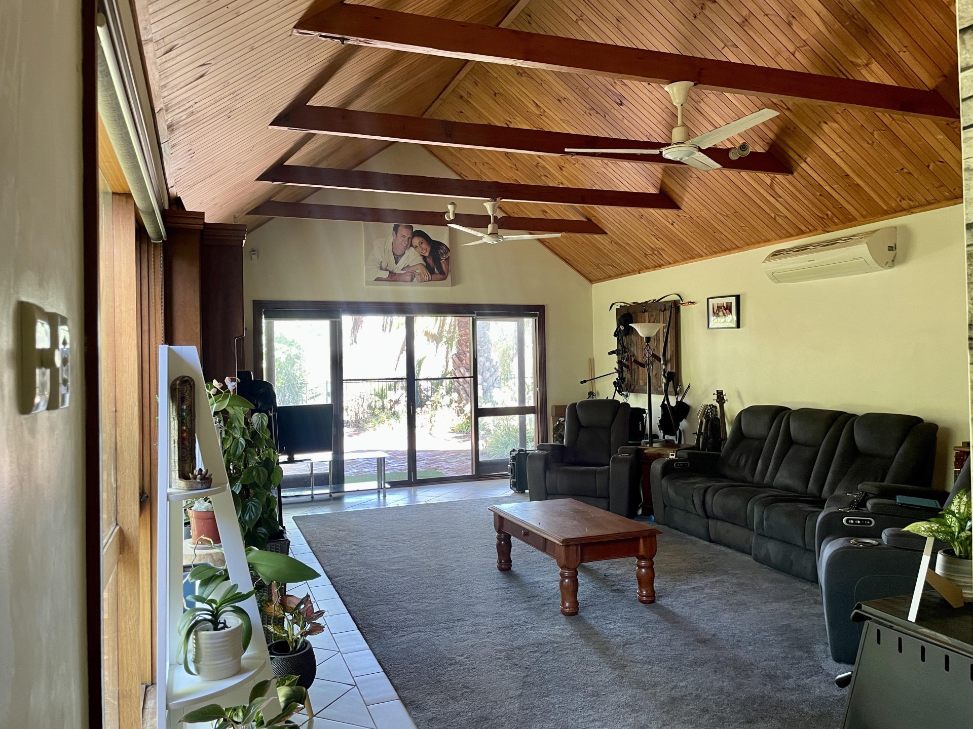 ✅ High timber-lined racked ceilings