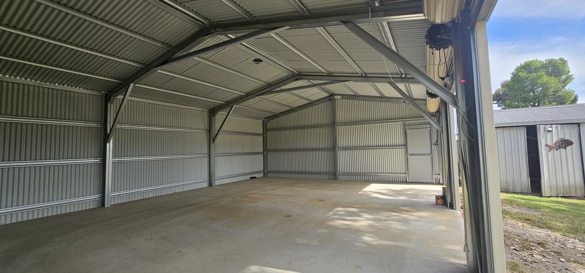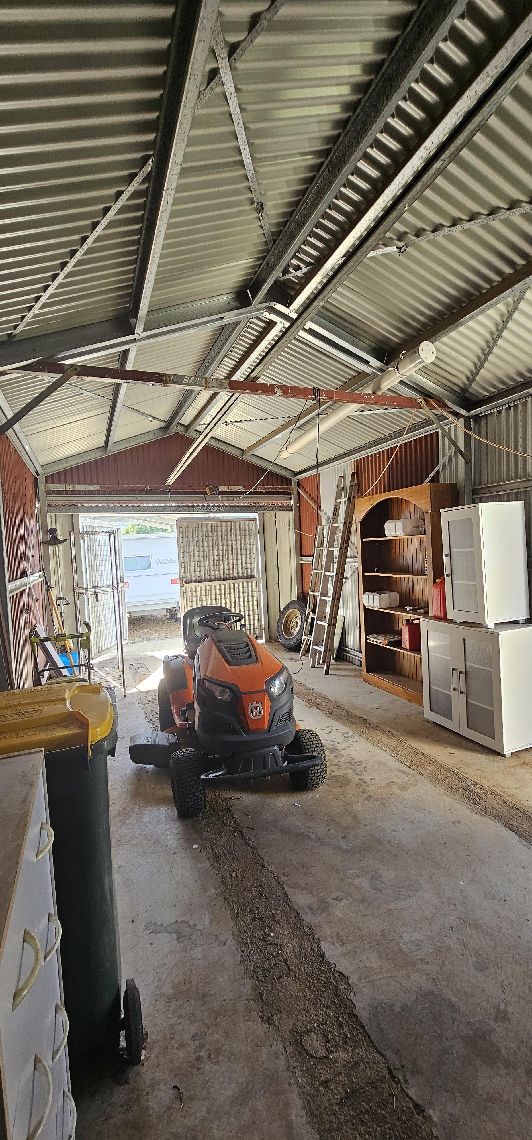 Shedding consists of a new 10.5 X 8mtr high clearance 3 bay garage with concrete floor and electric roller doors.
