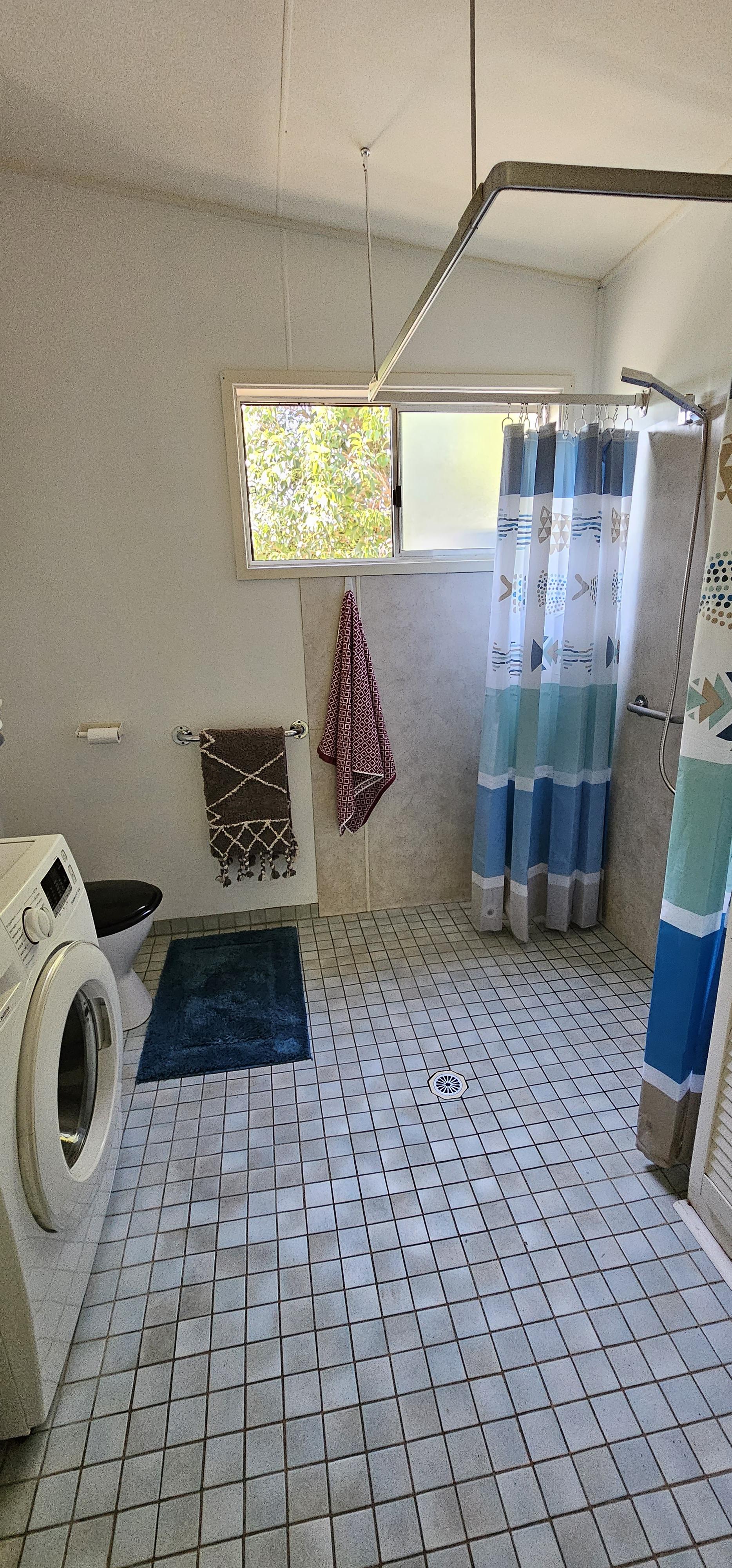 The home's large main bathroom features toilet, spacious walk-in shower plus ample storage.